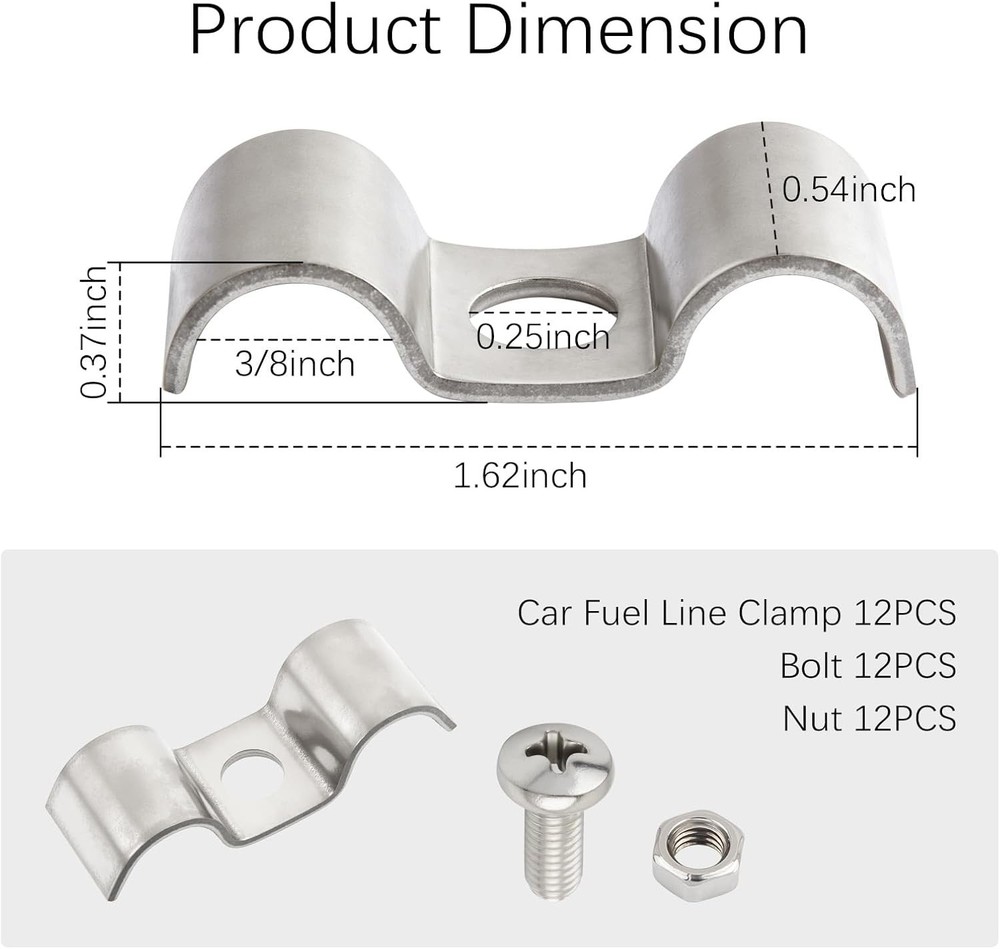 Free eBay listing template designed by dewiso.com 12PCS 3/8" Car Fuel Line Clamp with Bolts and Nuts Kit,M-shaped Double Line Hose Clamps for Securing Piping,304 Stainless Steel Clamps Car Accessories for Brake Lines FREE AND FAST SHIPPING! About this item Applicability: Note that you can use our hose clamp for brake/oil lines with a diameter of about 3/8 inch (9.5 mm), please do not use it to fix lines larger than 3/8 inch in diameter, please check the size information before purchasing Securing Lines: Fuel lines can come loose or even fall off during vehicle movement if they are not properly secured. Using our M-design metal clamps, both lines can be secured in place at the same time, avoiding unnecessary friction with other parts High Strength: High hardness 304 stainless steel is especially used as the main material of the pipe clamps, with its good physical properties, which can keep the structure intact and not easy to rust under the harsh environment of vehicles Product Specification: We offer you 12 pieces of fuel line clamps + 12 pieces of bolts + 12 pieces of nuts set, the total size of the clamps is 1.62*0.54*0.37 inch, the inner diameter of the bayonet hole is 3/8", the bolt thread size is M5*0.8*11.65 mm Steps to Use: 1. Find the automotive pipeline that needs to be fixed, and cover the pipeline with metal clamps. 2. Take out the bolts and nuts included in the kit. 3. Tighten the bolts with a cross screwdriver, and then lock the nuts at the end › Product We offer a 30-Day Return Policy on items which you are not completely satisfied with. You have the option for a full-refund or an exchange of the item. No returns are available on items shipped outside of the US . Shipping We offer Free Shipping to the US and ship within 2 business days of payment, usually sooner. We use UPS express shipping. That's why your products are usually delivered within 3 days . Contact We try our very best to make sure every customer is completely satisfied. If there's a problem , message us! We're happy to help. 24/7 live chat available.