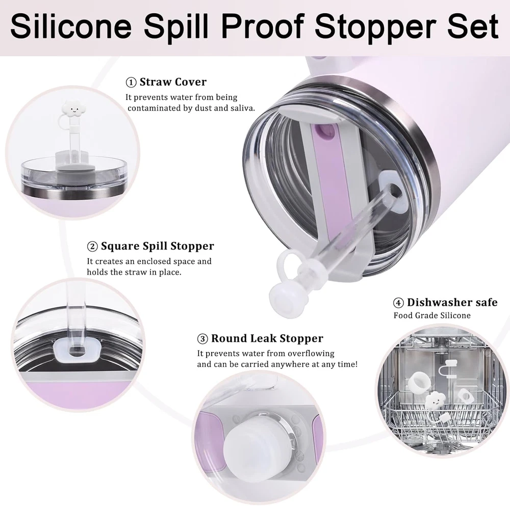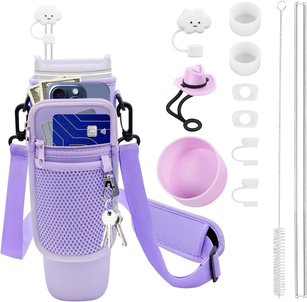 【Upgrade Cup Sleeve】New mesh pocket designs that provide plenty of room for all your personal belongings such as cellphones,cash,cards,keys,etc. And comes with removable and adjustable strap to suit all body types. ——One Set for all you need. Take your cup everywhere and free your hands. 【Cute Straws Covers】Made from food-grade silicone; Reusable & dishwasher safe. Fit straws with an outer diameter of 0.4in. A Cute decoration to remind you to drink more water. 【Drinking Straw & Cleaning Brush】The straw measures 12.5 x 0.4 in. And the brush is long enough to clean the straw easily. 【Protective Silicone Boot】 2.95x1.8in. Premium protector to fit bottles or tumblers with 2.8-2.95 in base. No need to worry about the bottom of the cup getting scratched; dented or making noise. Keep your cup in perfect condition. 【Anti Leak Stoppers】Available for Stanley H2.0 only. Perfect complement to your water bottle. They seal the cup and holds the straw in place. They are spill proof; stop gas loss and keep cold or hot drink longer. 【Wide Application and Perfect Gift】 This beautiful water bottle cover for stanley 40 oz tumbler is perfect for walking, biking, camping, hiking, back to school, commuting, or even if you're at the beach, gym, or sporting events. The tumbler pouch's versatile design makes it suitable for various sports and outdoor activities. And the water bottle holder with strap is a perfect gift for Stanley fans and a good gift for Halloween, Thanksgiving Day, Christmas Day, New Year's Day, Valentine's Day, Mother's Day and Father's Day. Product Description JMY 12 Packs Stanley Cup Accessories Add to Cart Add to Cart Add to Cart Add to Cart Add to Cart Customer Reviews 4.6 out of 5 stars 80 4.6 out of 5 stars 80 4.6 out of 5 stars 80 4.6 out of 5 stars 80 4.6 out of 5 stars 80 4.6 out of 5 stars 80 Price $19.99 $ 19 . 99 $9.99 $ 9 . 99 $19.99 $ 19 . 99 $19.99 $ 19 . 99 — $19.99 $ 19 . 99 Dishwasher Safe ✔ ✔ ✔ ✔ ✔ ✔ Reusable ✔ ✔ ✔ ✔ ✔ ✔ Food-grade Material ✔ ✔ ✔ ✔ ✔ ✔ Scratch Proof ✔ ✔ ✔ ✔ ✔ ✔ Size 30/40OZ 30/40OZ 30/40OZ 30/40OZ 30/40OZ 30/40OZ