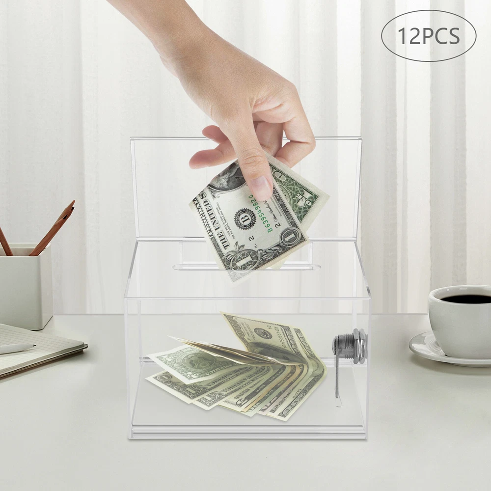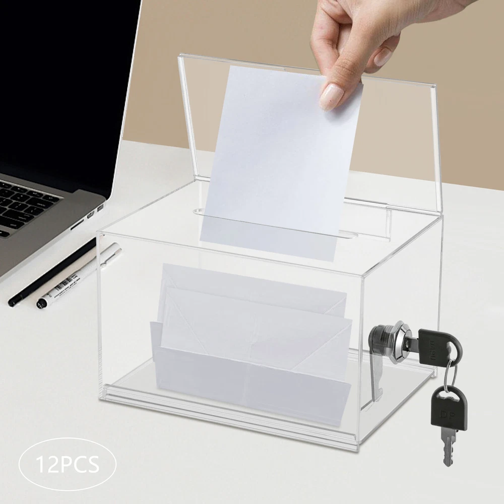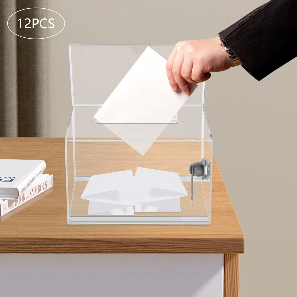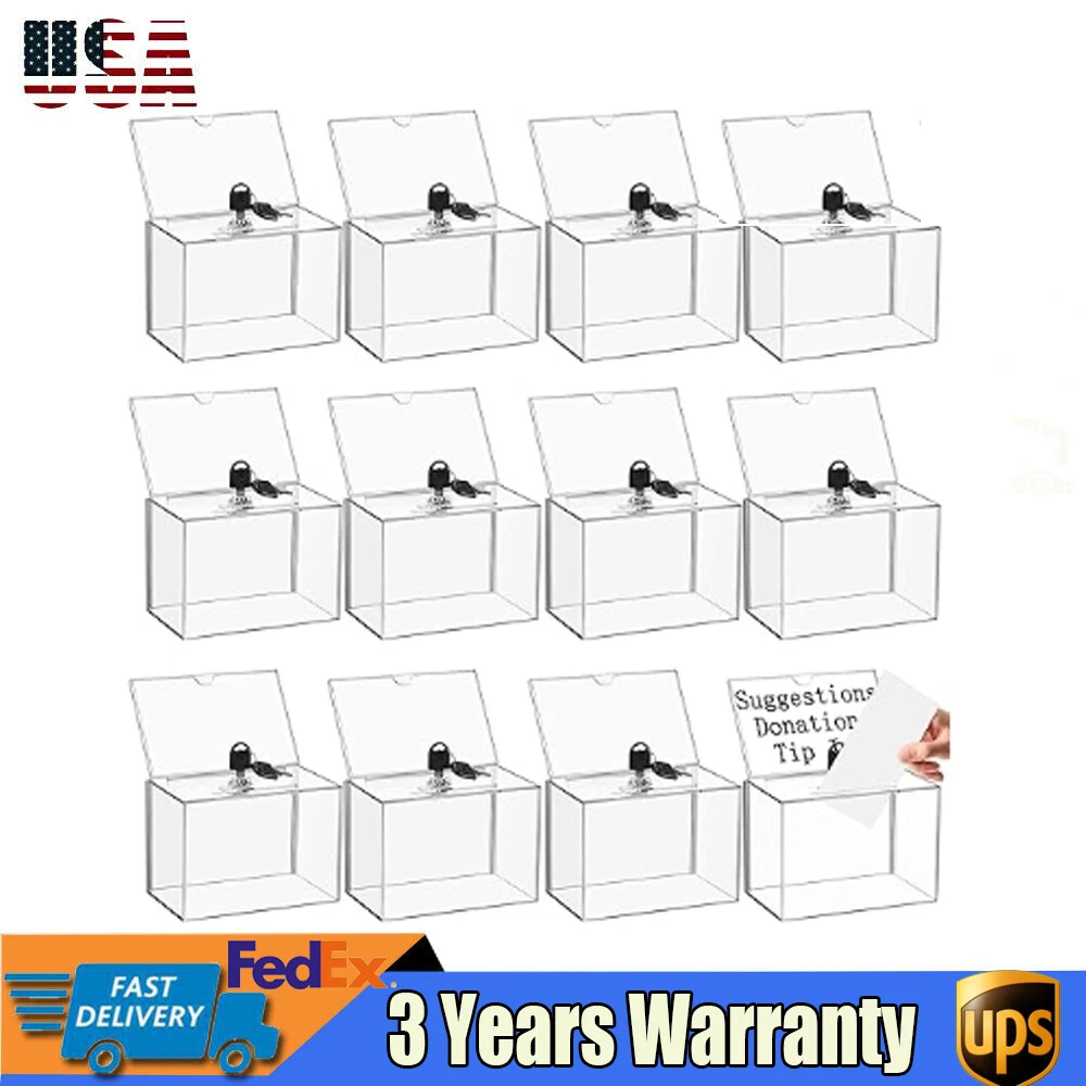 Description Voting or fundraising activities are right in front of you, but do you lack practical voting boxes? Take a look at our highly transparent acrylic ballot box! Each box comes with a lock and two keys, which can help you organize more professional voting and fundraising activities while ensuring fairness and trust. Key Features High-quality and Durable: It is made of high-quality acrylic with a laser cutting process, which has high tenacity and is not easy to break and deform. Suitable Size: The external size of 6.3*4*4.5 inches provides sufficient space to accommodate items like coins and coupons while only taking a small footprint, making it a very suitable size. Visible Design: The high-transparency acrylic provides excellent visibility to the items inside, you can use it as 12PCS Acrylic Suggestion Boxes Clear Acrylic Donation Box Ballot Box with Lock Description Voting or fundraising activities are right in front of you, but do you lack practical voting boxes? Take a look at our highly transparent acrylic ballot box! Each box comes with a lock and two keys, which can help you organize more professional voting and fundraising activities while ensuring fairness and trust. Key Features High-quality and Durable: It is made of high-quality acrylic with a laser cutting process, which has high tenacity and is not easy to break and deform. Suitable Size: The external size of 6.3*4*4.5 inches provides sufficient space to accommodate items like coins and coupons while only taking a small footprint, making it a very suitable size. Visible Design: The high-transparency acrylic provides excellent visibility to the items inside, you can use it as a ballot box to ensure justice or as a charity box to showcase the love from people. Good Protection: Each box has a lock with 2 keys that can prevent the loss of internal items and also provide convenience for you to take out internal items. 12Pcs a Set: This set includes twelve ballot boxes, so you don't need to purchase them repeatedly, greatly saving time and energy. Good Helper: With the help of this ballot box, you can easily accept the opinions of employees or customers and solve existing problems promptly, which is conducive to improving your image and providing better services for them. Easy to Use: After receiving the package, you only need to insert the board and label plate to start using it, which is simple and convenient. Easy to Clean: This product has a smooth surface and simple structure, so it reduces the difficulty of cleaning. You only need to use a towel to remove the dust on it. Details Label Plate: You can insert paper with voting or donation promote information into it without the need for glue. The curved groove design makes it more convenient for you to take out the paper from the label plate. Slot: You can easily put the ballot papers into the box through the slot on top, which is very convenient and fast. Application It is suitable for restaurants, companies, churches, coffee shops, hotels, salons, bars, proms, parties, marketing promotions, tradeshows, exhibitions, etc., to accommodate donations, ticket comments, suggestions, coupons, ballots, notes, coins, business cards, and tips. Specification Color: Clear Style: Modern Lock Type: Key Material: Acrylic Process: Laser Cutting Shape: Rectangular Assembly Required: Yes Mounting Type: Tabletop Thickness: 2mm/0.08in, 3mm/0.12in Label Plate Size: 16*10cm/6.3*4in Product Size: 16*10*11.5cm/6.3*4*4.5in Internal Size: 15.4*9.4*10.5cm/6.06*3.7*4.13in Ballot Slot Size: 10.5*1cm/4.13*0.39in Package Size: 35*30*30cm/13.78*11.81*11.81in Gross Weight: 5kg/11.02lbs Package Included 12* Ballot Boxes 12Set* Keys Notes Please understand that ballot papers, tickets, cards, etc. are not included. Please allow the slight color difference caused by the shooting light and 1-3cm error due to manual measurement, and make sure you do not mind before ordering. Payment Delivery details Terms of sales About us Contact us Payment We accept ebay payment 。 Fees such as import duties, taxes are not included in the item price or shipping costs. These charges are the buyer's responsibility. Delivery details Shipping: 2-9 working days to: USA Terms of sales We maintain high standards of excellence and strive for hundred percent customer satisfaction. Feedback is very important to us. We hope that you contact us immediately before you give neutral or negative feedback, so that we can address your concerns. It is impossible to address issues if we do not know about them! About us Your satis faction is our ultimate goal. We work hard to earn your trust and future business. Our certified technicians have tested each item before shipping. The unit comes with 1 year limited warranty on all manufacturing defects. a) If you receive a defective item, you may return it or ask for a discount. Please contact us within 14 days after you receive the package. b) What you returned must be intact and in its original packaging as re? u. Customer is responsible for shipping costs of the returned item. c) We will cover the cost of shipping back t with the shipping rate indicated in the registration page. We will send you a new unit or refund the full payment you paid. Thank you. Contact us Business Hour Business Hour: Monday To Friday: 8:30 AM to 5:00 PM (Beijing China time) Due to time zones, our reply to your questions may not be immediately. But within above working time, we will reply your email within 24 hours. If it's non-workdays, please kindly be patient and wait till Monday. Please contact us with ebay message. Please feel free to contact us if you have any questions. Monday To Friday: 8:30 AM to 5:00 PM (Beijing China time) Due to time zones, our reply to your questions may not be immediately. But within above working time, we will reply your email within 24 hours. If it's non-workdays, please kindly be patient and wait till Monday. Please contact us with ebay message. Please feel free to contact us if you h