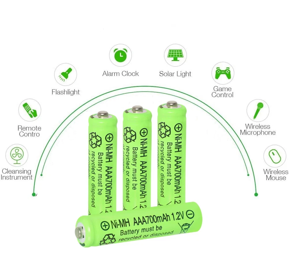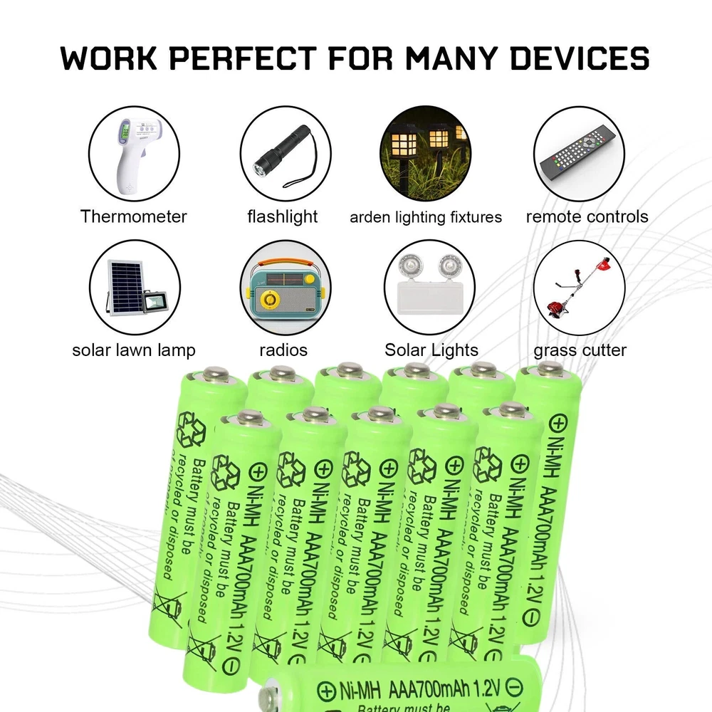 12Pack 1.2v 700mAh Ni-MH AAA Rechargeable Batteries for Garden Solar Ni-MH Light Warm Tips: Before use, please remove the plastic packaging film of the battery. Features: ❤1. Widely use: Our AAA batteries rechargeable is perfect used for solar powered garden lights, landscaping lights, lawn lights, etc. replace all alkaline disposable batteries that power your TV remotes, wireless mouse and keyboards, gaming controllers, RC remotes and others. ❤2. Easy to install and use: Remember to Keep your solar light switch on,Simply install the AAA Ni-MH batteriy in your solar lights and allow sunny day for recharging.Triple a solar batteries for outdoor solar lights can be charged via solar cell lights or standard charging units. ❤3. The 1.2v Ni-MH rechargeable batteries can be charged up to 500 times, save money from buying huge of one-time used batteries. Power life up to 25 months, longer life in the high drain devices than normal Alkaline batteries. ❤4. Please note that this is AAA size batteries---Please use up the power each time, then recharge it or it will affect its capacity and lifetime. Specification: 1.2-volt 700mAh AAA Ni-MH rechargeable batteries Voltage:1.2V Recycling above 500times Dimension: 10 Dia x 44 H mm Rapidly charging and reliable service life Ideal for fast discharge applications / solar lights Package Included: 12x 700mAh 1.2v AAA Rechargeable Batteries Ni-MH Battery Warm Tips: 1. Before use, please remove the plastic packaging film of the battery. 2. Please check the "+" and "—" directions of the battery before you charge the battery. 3. Do not put the product into fire, short circuit, dissassemble and extrude. 4. Do not mix charging with different type of batteries, which may explode or leak, causing personal injury. 5. Please use up the power each time, then recharge it otherwise it will affect its capacity and lifetime. 6. Please take out the battery if you won't use for a long time to avoid battery leakage. 7. Note:Please find us in first time when you find the parcel Broken/Scratch/Function Error/Miss Parts/Unwork/has not arrived etc, we always have more details and solutions, even duty for your order. On Jan 9, 2025 at 02:12:02 PST, seller added the following information: