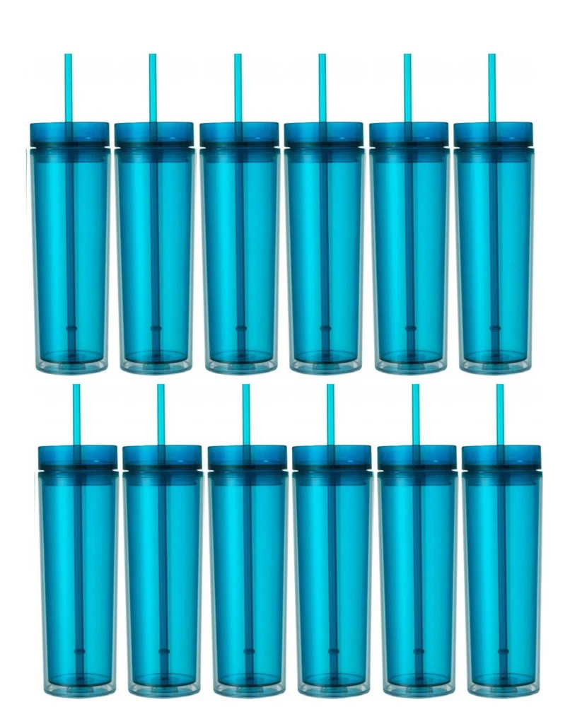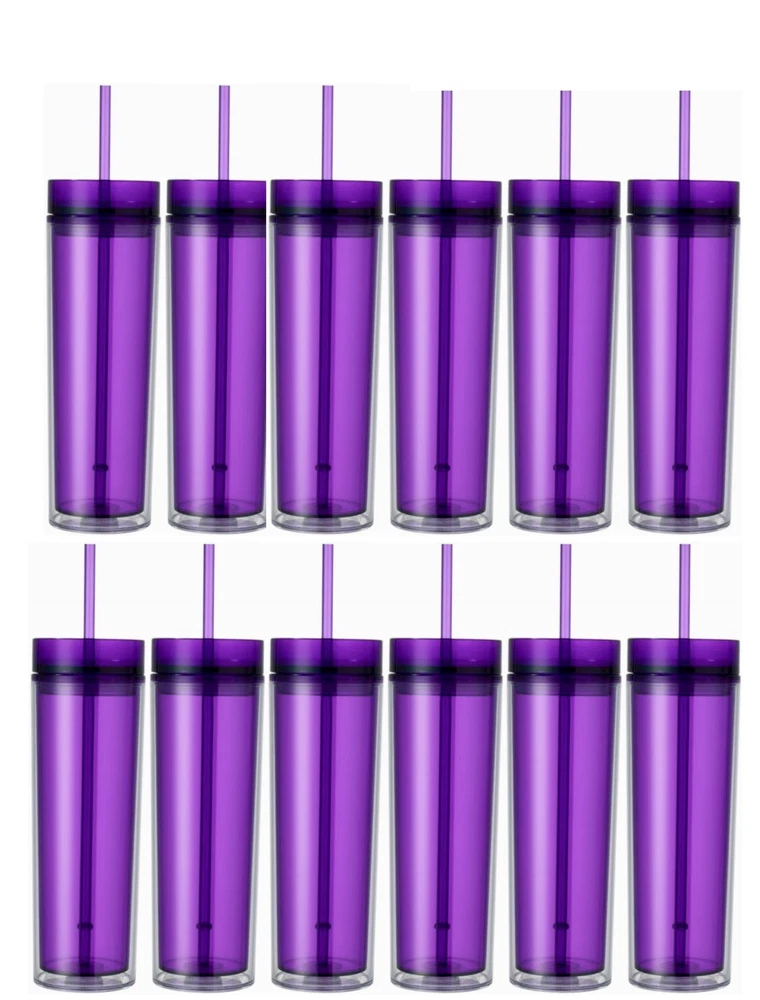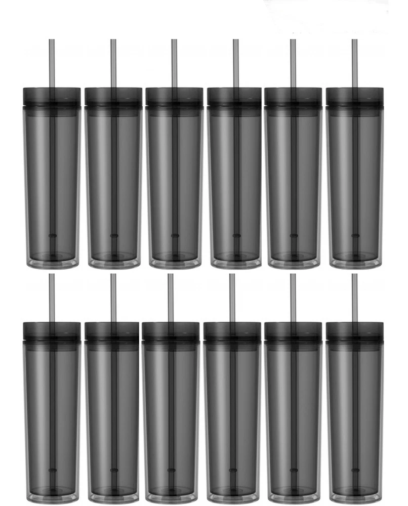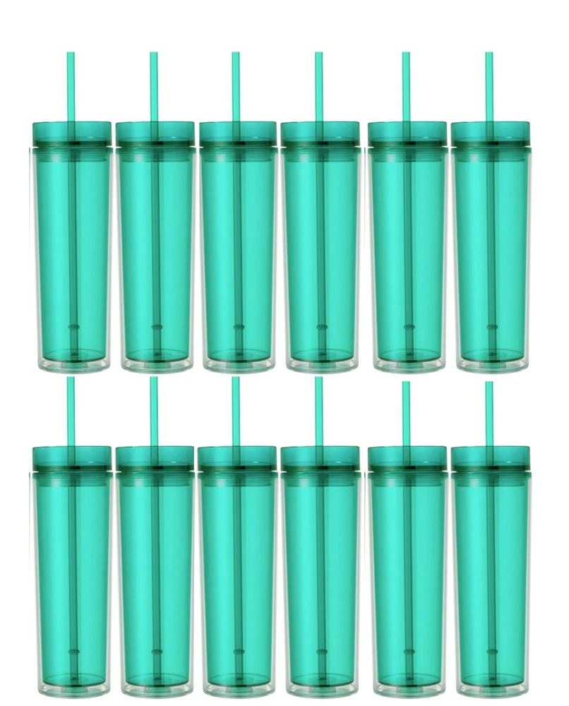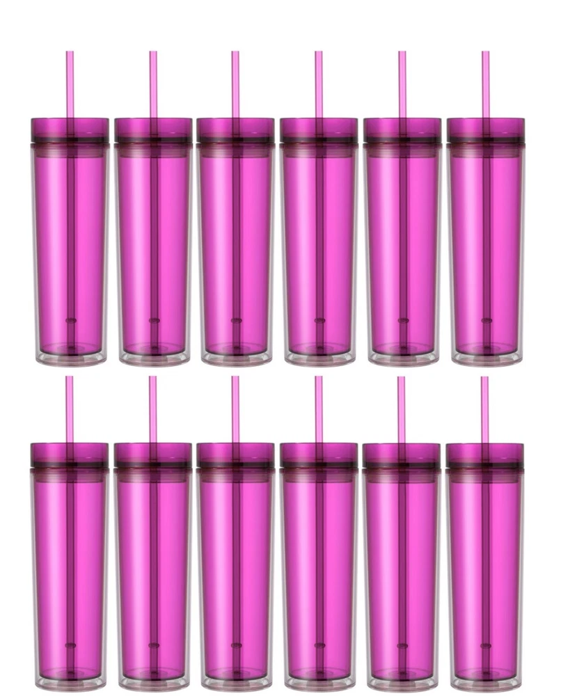 Skinny Acrylic Tumbler Double Wall 16 Oz This is a package of 12 Skinny Acrylic Tumblers, Set of 12 Tall Skinny Acrylic Tumbler Double Wall 16 Oz Temp Rating: Up to 175 Degrees Measurements: 8.5" H x 2.75" Diameter BPA Free: Yes SHAPED FOR MONOGRAMMING AND VINYLS 16 oz Skinny Double Wall Acrylic Tumbler with Lid and Straw Our wide selection of colors which include clear, lavender, Ash, smoke, aqua, blue, pink, purple, and mint will suit any person or occasion This BPA free high grade insulated acrylic construction reduces condensation and stays comfortable to touch. While designed for both hot and cold liquids, this can also conveniently fit into any standard size cupholders in vehicles in case you are on the go. Product dimensions are 8-1/2” in height with a base diameter of 2-1/2.”