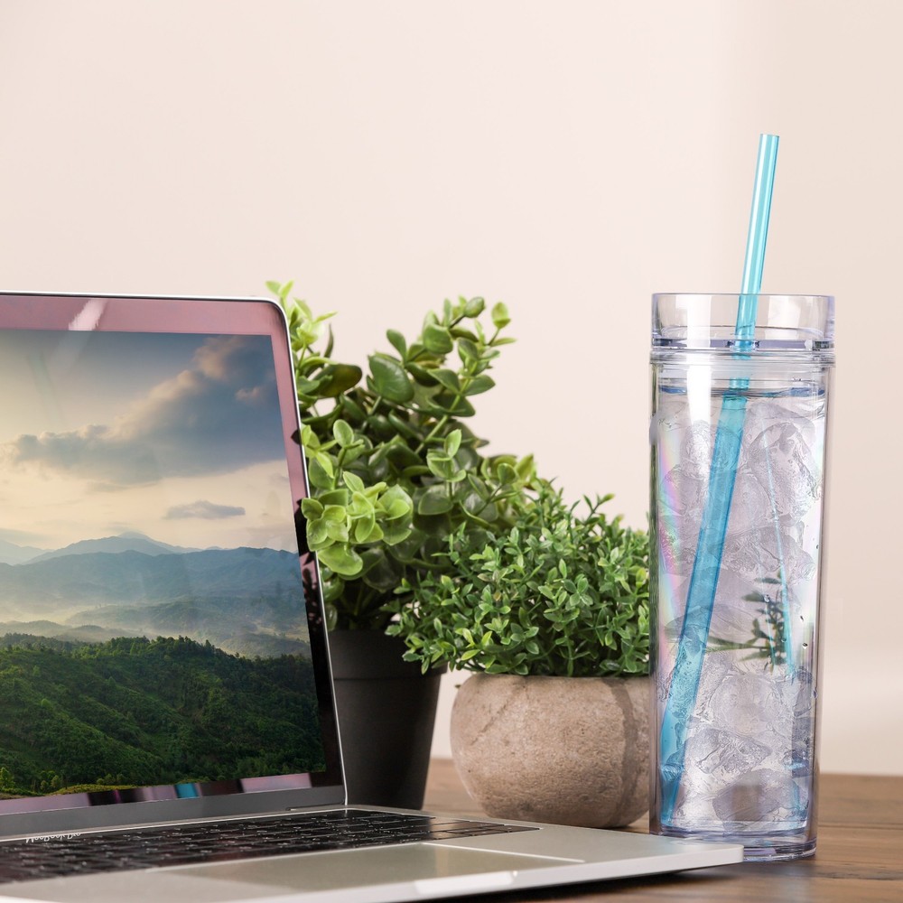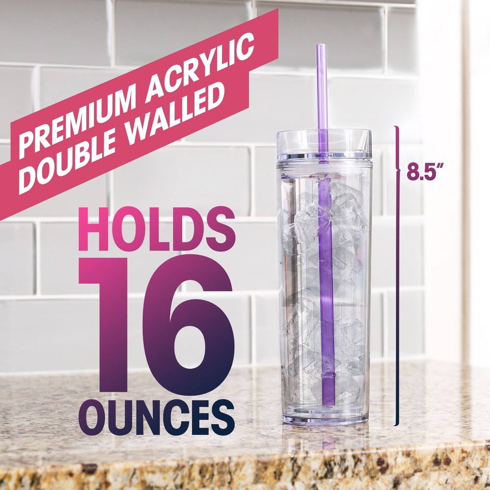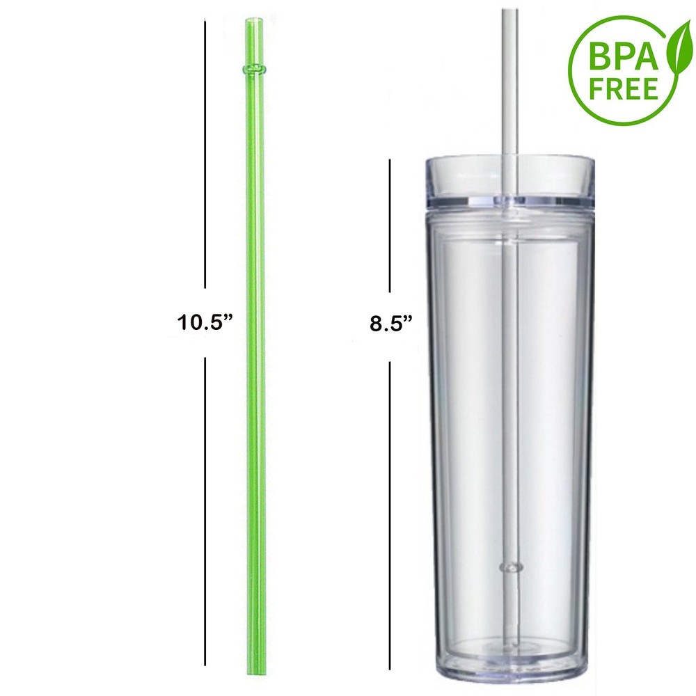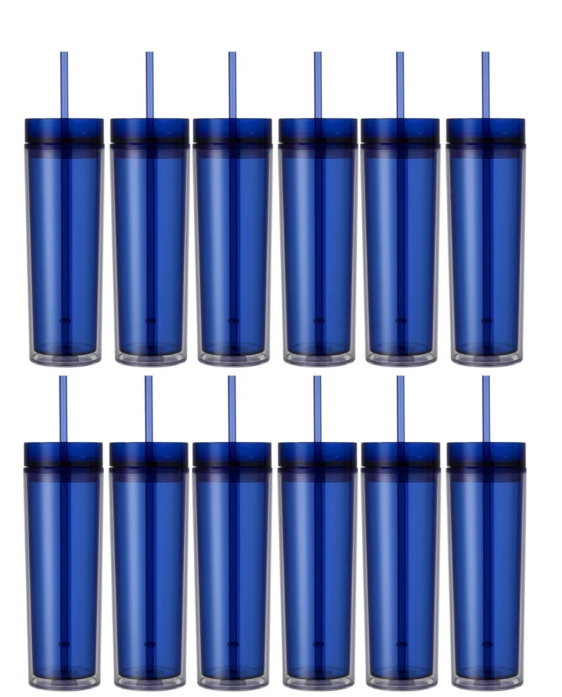 Skinny Acrylic Tumbler Double Wall 16 Oz This is a package of 12 Skinny Acrylic Tumblers, Set of 12 Tall Skinny Acrylic Tumbler Double Wall 16 Oz Temp Rating: Up to 175 Degrees Measurements: 8.5" H x 2.75" Diameter BPA Free: Yes SHAPED FOR MONOGRAMMING AND VINYLS 16 oz Skinny Double Wall Acrylic Tumbler with Lid and Straw Our wide selection of colors which include clear, lavender, Ash, smoke, aqua, blue, pink, purple, and mint will suit any person or occasion This BPA free high grade insulated acrylic construction reduces condensation and stays comfortable to touch. While designed for both hot and cold liquids, this can also conveniently fit into any standard size cupholders in vehicles in case you are on the go. Product dimensions are 8-1/2” in height with a base diameter of 2-1/2.”