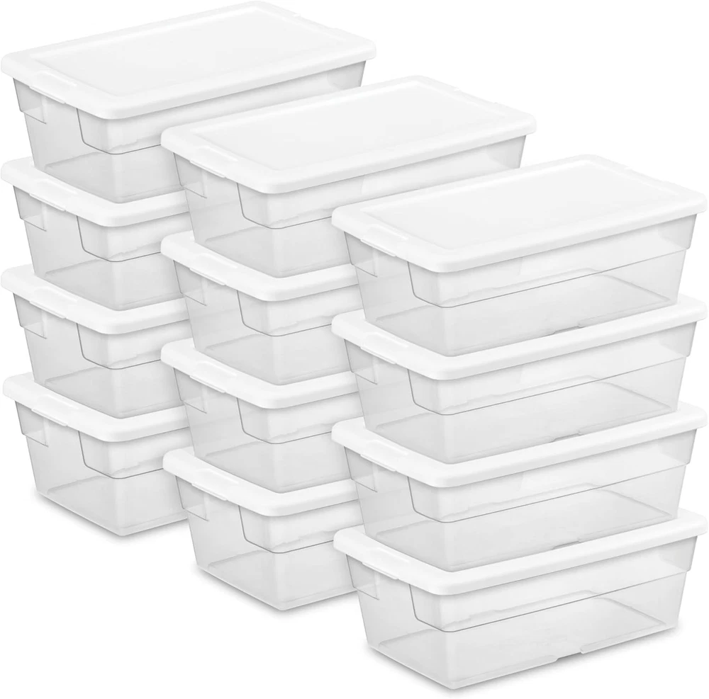 12-Pack Stackable Clear Storage Bins, 6 Quart with Snap-On Lids for Organization N/A-plastic Dimensions & Size: The storage boxes have outside dimensions of 13 5/8" x 8 1/4" x 4 7/8" and interior dimensions at the bottom of 11 1/4" x 6 1/8" x 4 1/4", making them perfect for organizing items. Versatile & Convenient: These storage boxes are ideal for a variety of basic and lightweight storage needs, making them perfect for use throughout the home. Secure & Easy Handling: The opaque lid securely snaps onto the base, providing a firm grip for effortless lifting and carrying. Easy Visibility: The clear base of the container allows for effortless viewing and locating of stored items. Sterilite products are proudly made in the USA since 1939 and are BPA and phthalate-free.