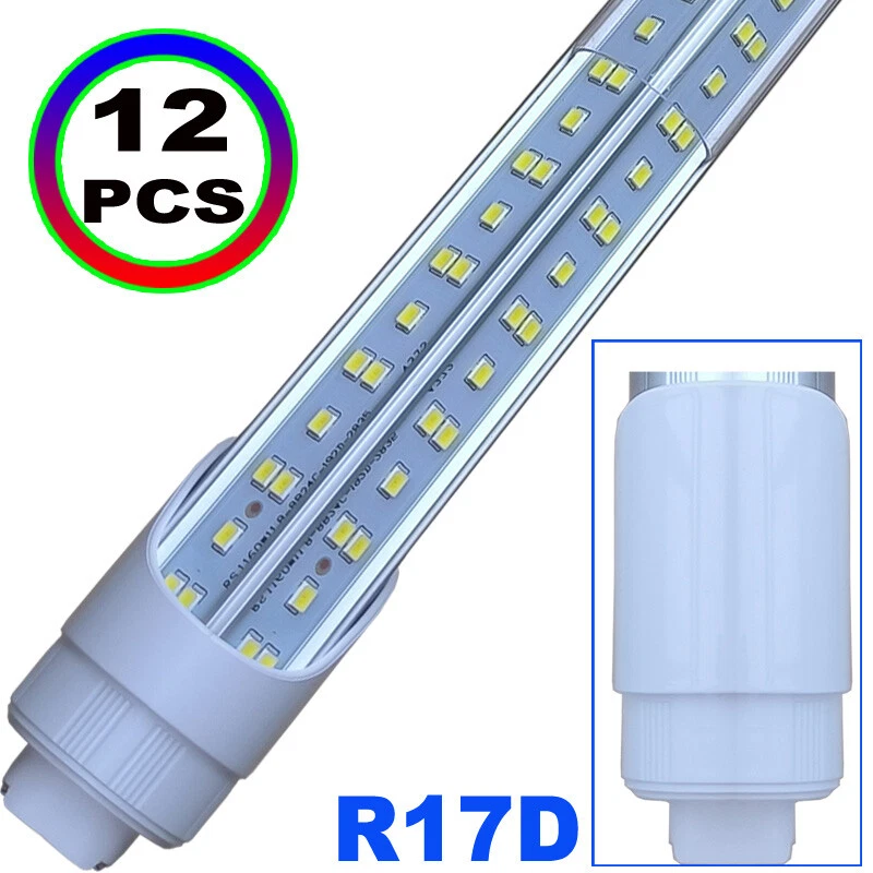 FAST DELIVERY - Ship from New Jersey or Los Angeles Warehouse via FedEx , 3-7 Days Delivered Your Door . SCIENTIFIC DESIGN - 8Ft LED Shop Lights Fixture is Made of 6500K Cold White SMD2835 LED Chip ,Plastic Clear Cover , Aluminum Bracket Housing ,and AC85-277V Constant Current Driver . It can work in -68F to 120F Temperature Conditions EASY INSTALLATION - The Integrated Tube Fixture Can be Install on Wall or Ceiling ,Easily Replace Traditional Fluorescent Tube Bulb . Plug and Play , Free Accessories (Power Cords, Connector , Extension Cords , Clip and Screw ) Come with Tube Lights Together WIDE APPLICATION - Linkable 8Ft Bulbs Widely Used in Garage Ceiling , Barbershop , Schools, Hospitals Basement , Factory Warehouses , Supermarkets Cooler Door , Offices, Shops,Hotels, etc 12Pack 8 FOOT Led Shop Light 144W HO T8 Rotatable Base 8Ft R17D Led Tube Light 【Rotate Cap & Swivel End】 Easy Adjust rotated Lighting Direction within 180 degree after Installation 【No RF & FM Interference】LED Driver have passed Electromagnetic Magnetic Compatibility EMC tests,No cause EMI ,No longer subject to any RF & FM jamming. Never interfering with the signal of your garage roller shutter door,No make noise when you listen radio 【Easy to Install】Just simply bypass the ballast and connection AC85-277V AC power . Not compatible with single-ended powered sockets 【Wide Application】 - 8Ft 144W V Shaped R17D HO LED Bulb fitted to replace traditional F96T12 T8 T10 T12 fluorescent bulbs. Widely used in Garage,supermarkets, offices , convenience stores , 【High Output】8Ft 144W 18000LM R17D 6500K Cold White Color