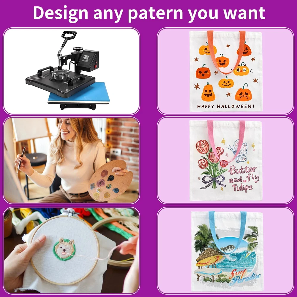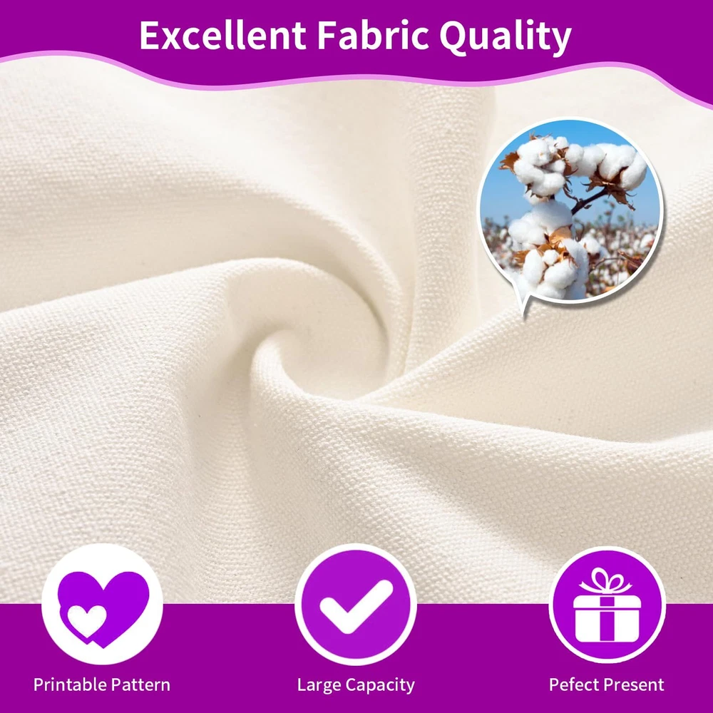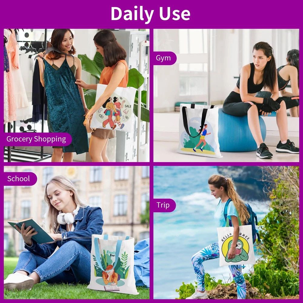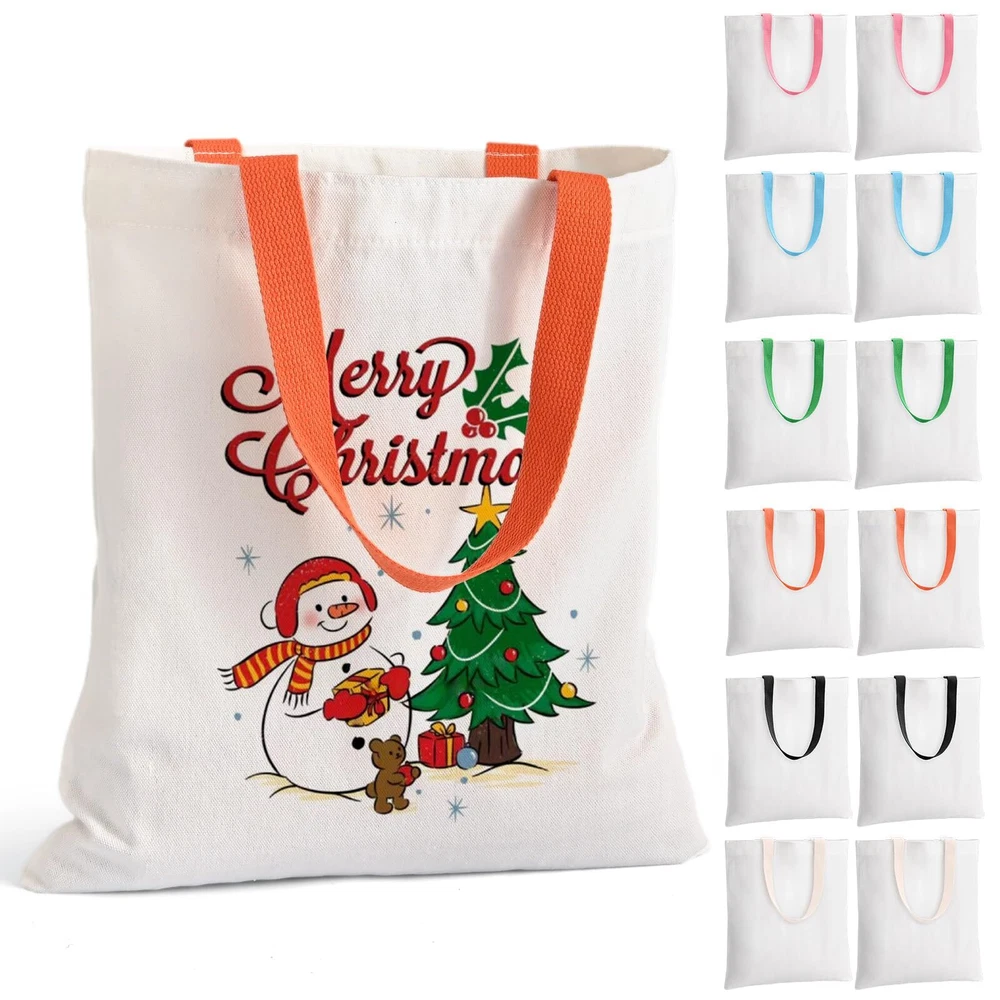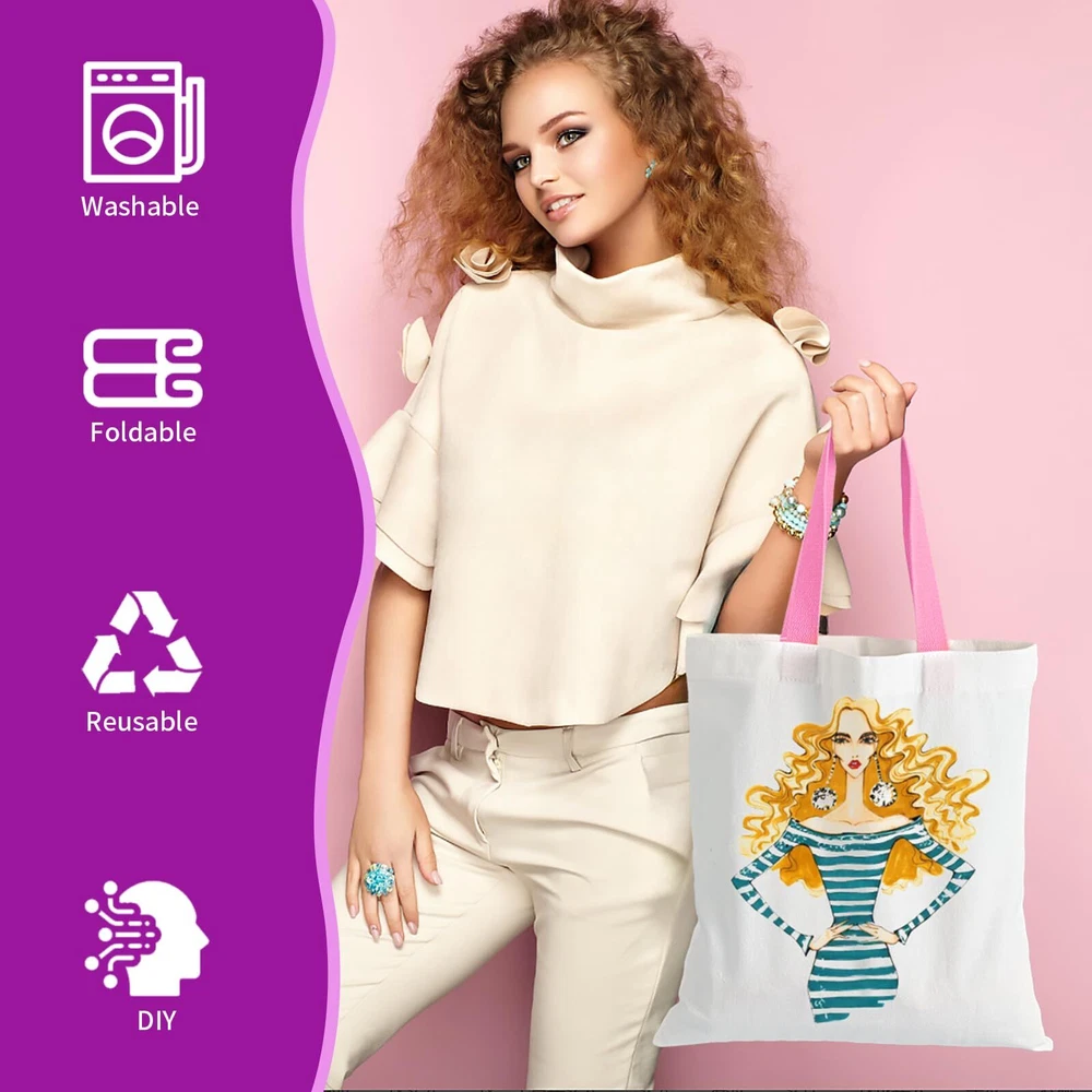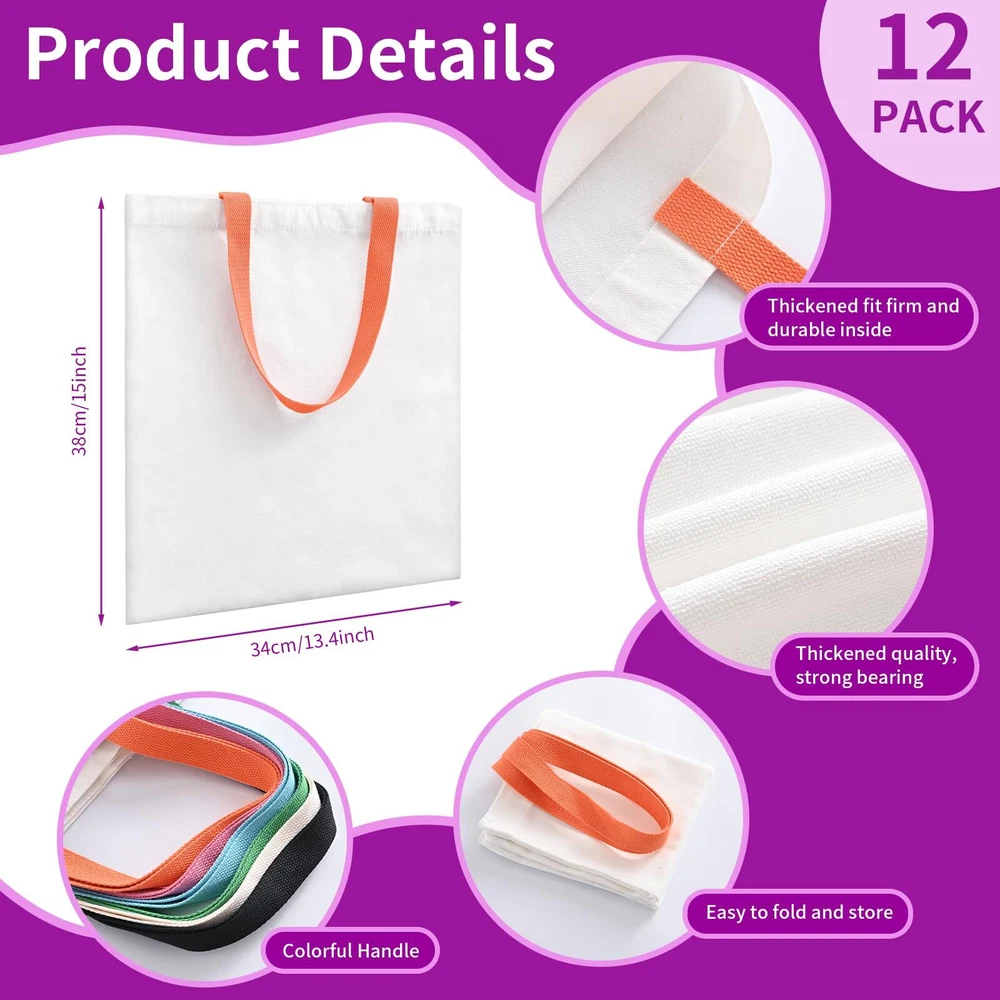 12Pack Economical Canvas Cotton Tote bags, 10Oz Cotton Canvas Tote Bags Reusable Grocery Bags Shopping Cloth Bags w/Colorful Handles Personalized Present Bags for Women, DIY, Decorating Craft, White SPECIFICATION 10oz Cotton. Perfect Size Tote Bags. Bulk in Quantity & DIY Available. Multi-Function & Durability. Eco-Friendly. PACKAGE LIST 12 x Blank Canvas Tote Bags with colorful Handles (15" W x 13"H) POTABLE SIZE: Included twelve pieces of canvas tote bags with colorful handles(15" W x 13"H), convenient to carry in hand or wear on your shoulder, sturdy enough for all kinds of daily use. Give these reusable bags to your friends and family to inspire them to stay away from plastic DURABILITY: Blank canvas tote bags made of 10oz cotton with dense thread and exquisite workmanship. All seams are reinforced and sewn to ensure their durability MULTI-FUNCTION: Perfect for HTV, silk screen printing, or painting on bag. It can be used as promotional bags, grocery bags, holiday bags, etc. Suitable for bridesmaids, bridal showers, beach, flower girls, holidays, Christmas and bachelor parties, it is a great present for women, mother, teacher, wife, sister and friends SUITABLE for DIY: You're free to create whatever look you like on these canvas bags, they support thermal transfer printing and you can paint or embroider on them, enjoying the fun of DIY and showing your own styles WASH TIPS: Cleaning cotton canvas bags is not recommended. The shrinkage rate after washing is about 8%-10%. And it is suggested to wash it partially if it's terribly dirty