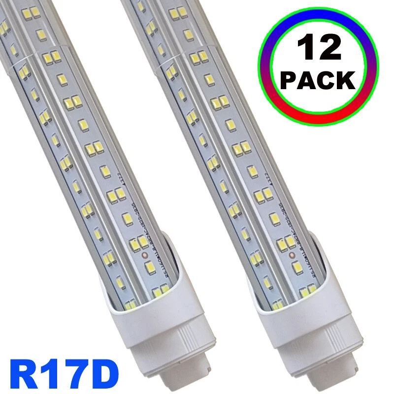 FAST DELIVERY - Ship from New Jersey or Los Angeles Warehouse via FedEx , 3-7 Days Delivered Your Door . SCIENTIFIC DESIGN - 8Ft LED Shop Lights Fixture is Made of 6500K Cold White SMD2835 LED Chip ,Plastic Clear Cover , Aluminum Bracket Housing ,and AC85-277V Constant Current Driver . It can work in -68F to 120F Temperature Conditions EASY INSTALLATION - The Integrated Tube Fixture Can be Install on Wall or Ceiling ,Easily Replace Traditional Fluorescent Tube Bulb . Plug and Play , Free Accessories (Power Cords, Connector , Extension Cords , Clip and Screw ) Come with Tube Lights Together WIDE APPLICATION - Linkable 8Ft Bulbs Widely Used in Garage Ceiling , Barbershop , Schools, Hospitals Basement , Factory Warehouses , Supermarkets Cooler Door , Offices, Shops,Hotels, etc 12Pack HO R17d T8 8Ft LED Shop Lights 144W 18000LM 8' LED Tube Light Bulbs 6500K 【Rotate Cap & Swivel End】 Easy Adjust rotated Lighting Direction within 180 degree after Installation 【No RF & FM Interference】LED Driver have passed Electromagnetic Magnetic Compatibility EMC tests,No cause EMI ,No longer subject to any RF & FM jamming. Never interfering with the signal of your garage roller shutter door,No make noise when you listen radio 【Easy to Install】Just simply bypass the ballast and connection AC85-277V AC power . Not compatible with single-ended powered sockets 【Wide Application】 - 8Ft 144W V Shaped R17D HO LED Bulb fitted to replace traditional F96T12 T8 T10 T12 fluorescent bulbs. Widely used in Garage,supermarkets, offices , convenience stores , 【High Output】8Ft 144W 18000LM R17D 6500K Cold White Color