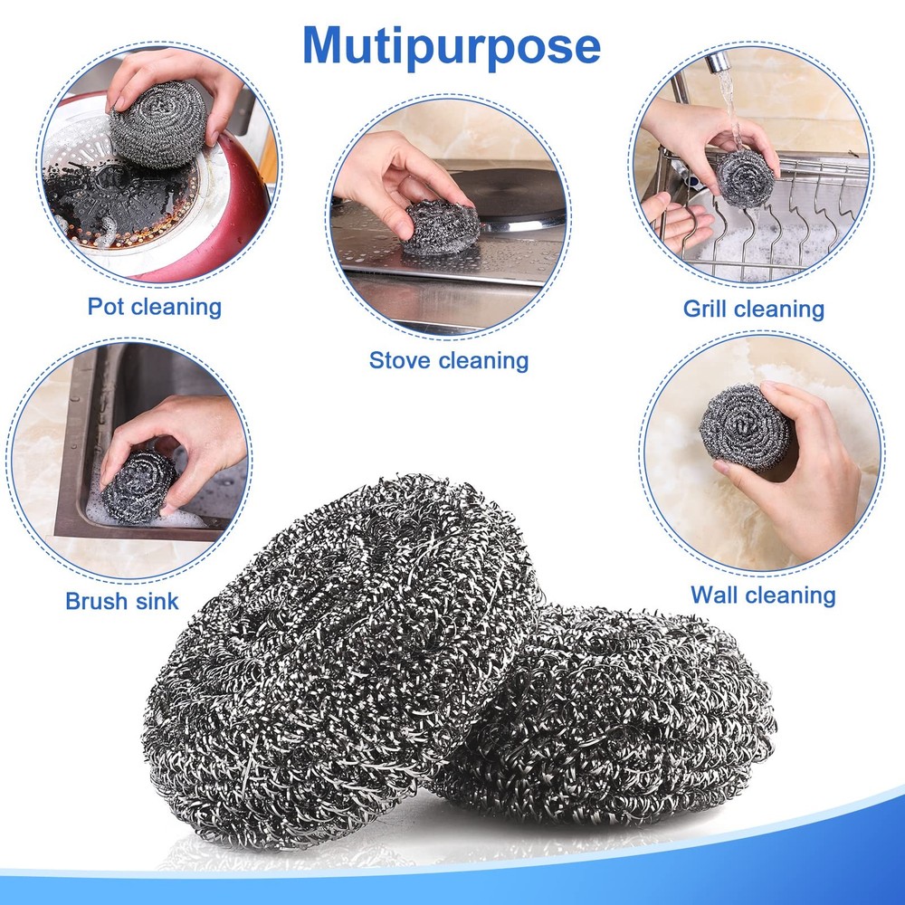 12Pack Upgraded Steel Wool Scrubbers - Premium Stainless Steel Scrubber, Metal Scouring Pads, Steel Wool Pads, Kitchen Cleaner, Heavy Duty Cleaning Supplies - Especially for Tough Cleaning HIGH QUALITY: Made of high quality 410 stainless steel, Internal spiral structure, tightly wound, soft and stretchy, preventing them from loosening, rusting, hurting hands HEAVY DUTY: Easily remove grease, stubborn burnt-on stain and grimy build-up, These stainless steel scouring pads can deal with the toughest household cleaning tasks effortlessly PACKAGE SIZE: 12Pack steel wool scrubbers included, individually wrapped to keep clean and avoid mutual entanglement between these scouring pads. The diameter of each one is approx 2.76 inches, and the weight is about 0.83 ounces MULTIPURPOSE: In addition to in the kitchen and bathroom, you can use them in the outdoor furniture and garage. Great for cleaning uncoated cookware, bakeware,ovens, grill racks, pots, pans, sinks, spatulas, etc. GOOD CLEANING HELPER: steel wool scrubbers is better at heavy cleaning such as grills; In contrast, microfiber cleaning cloth, ideal for kitchen cleaning, dusting and glass, scrubbing sponge focus on washing dishes Shipping We offer FREE shipping on all orders! We ship within Three business days of payment, usually sooner. We use a selection of shipping services such as UPS, FedEx, USPS etc. We only ship to the lower 48 states, no APO/FPO addresses or PO Boxes allowed. Local pickups and combined shipping options are not provided at this time. Return You can return a product for up to 30 days from the date you purchased it. Any product you return must be in the same condition you received it and in the original packaging. Please keep the receipt. Payment We accept payment by any of the following methods: PayPal Please pay as soon as possible after winning an auction, as that will allow us to post your item to you sooner! Feedback Customer satisfaction is very important to us. If you have any problem with your order, please contact us and we will do our best to make you satisfied. Contact Us If you have any queries, please contact us via ebay. We usually respond within 24 hours on weekdays. Please visit our eBay store to check out other items for sale! Thank you for shopping at our store.