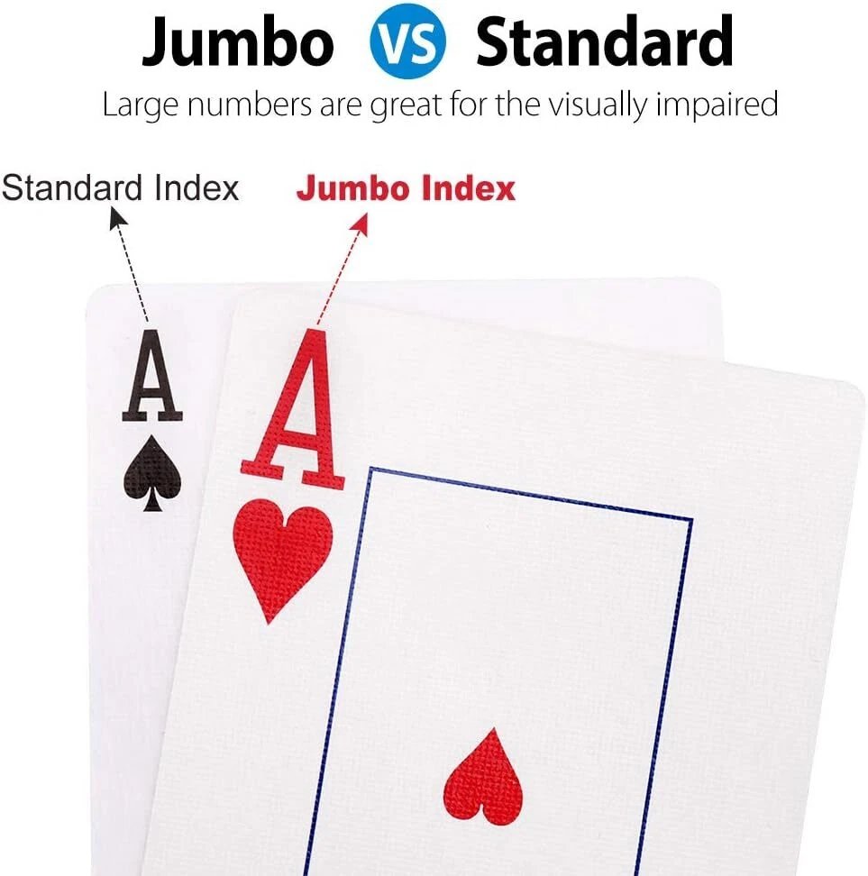 Great quantity of 12 decks playing cards: 6 red and 6 black; each deck contains 52 suited cards and 2 jokers Playing cards are great for many card games: Texas Hold'em, Blackjack, Pinochle, Euchre, Bridge, Canasta, Go fish, Poker, Hearts, Baccarat and more Jumbo index playing cards are super-indexed, big-faced and large-numbered, easy to see, helpful to players with imperfect eyesight, and favored by seniors Plastic-coated decks of cards for a smooth feel and extra durability, easy to shuffle; made from paper stock; linen finish for better handle; blue core sandwich construction for professional game play, nearly Casino Grade Poker size (wide size) cards measure 2.5" x 3.5"; This is regular playing cards. If you play pinochle game, just pick out two copies of 9,10, J, Q, K, A cards of all four suits and remove unneeded cards. Product Description Jumbo Index Playing Cards If you have to strain to see the small print on standard index cards, then Jumbo Index is good choice for you. Jumbo index means the ranks, and suit symbols are printed larger on the cards than standard index. The card size is same with traditional card, measures 2.5" x 3.5". Super Index Playing Cards are easier to see from far away, especially great for Texas Hold'em, which requires you to hold few playing cards in your hand, and relies heavily on community cards for all the players crowded around the table to see. Jumbo Index is also suitable for players with imperfect eyesight, and favored by seniors. LotFancy Playing Cards LotFancy Playing Cards are made from paper, coated with a layer of plastic, to make slick, durable and flexible. These cards have excellent quality graphics, shuffle easily and feel very substantial. Blue core sandwich construction prevents from cheat, nearly Casino Grade, great for professional game play. Jumbo-indexed playing cards feature classic red and black suits, super-index, and big-face, available in both black and red card backs. Each deck includes 52 suited cards and 2 jokers. You will love it ! Playing cards are one of favorite items for party, travel and camping to kill time with friends and family, perfect for Poker Night and Casino Party. Whatever you play texas, poker, bridge, euchre, canasta, hearts, go fish, pinochle and other different variations of solitaire, even practice card sleights or cardistry, LotFancy playing cards can satisfy all your need. Specification Quantity: 12 Decks or 2 Decks Color: red; black Card size: 2.5” x 3.5” (63mm x 88mm) Index: jumbo size