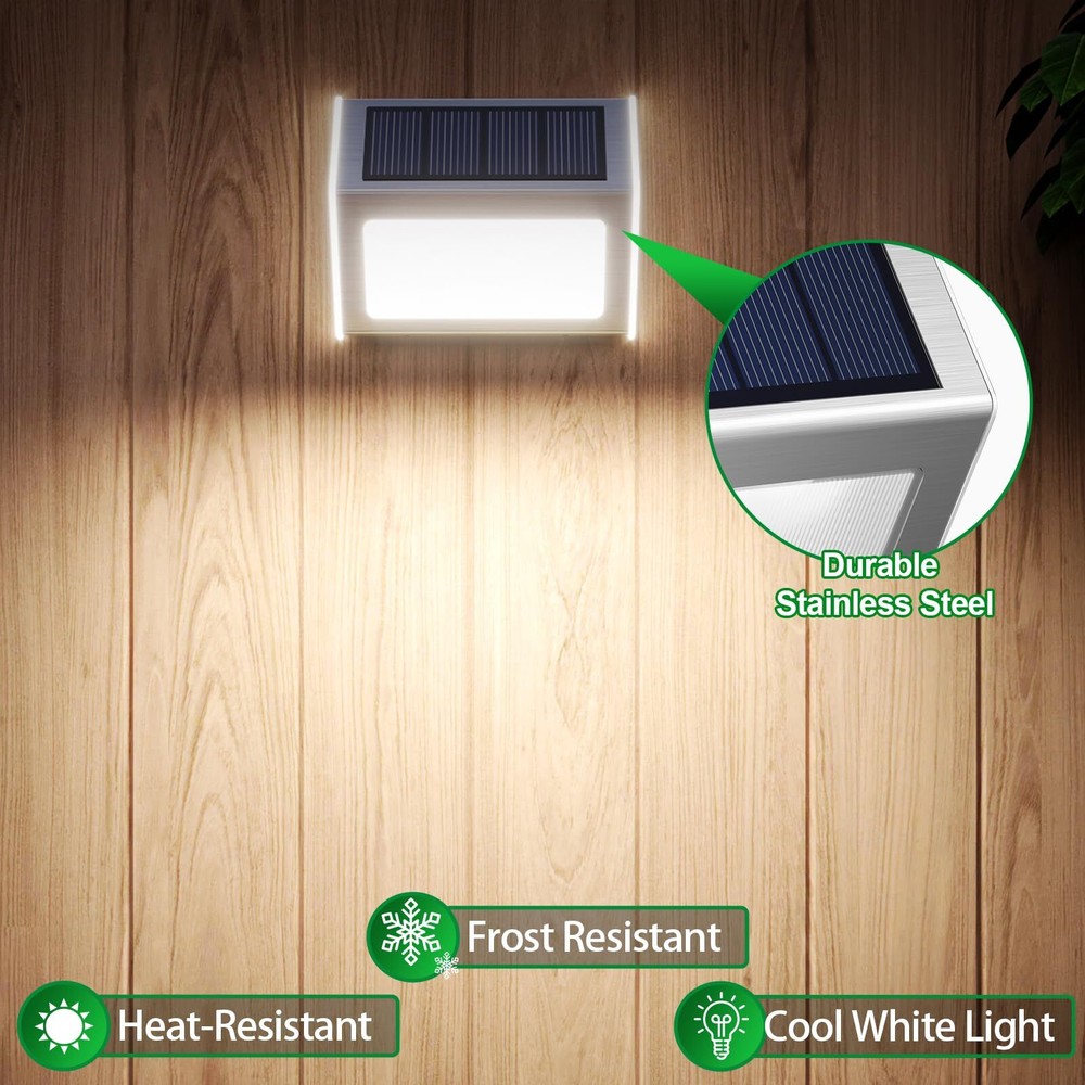 Upgraded Solar Panel - Charge Faster: Solar step lights come with upgraded 2V larger solar panel, the 18% solar conversion rate is higher than other solar lights, ensuring high charging efficiency and saving charging time. The deck light can illuminate for up to 8 hours when fully charged, which is longer and brighter than other solar lights on the market. Waterproof & High Quality Metal: Outdoor solar step lights With waterproof rating and high-impact resistance, long lasting construction. our Stainless Steel light body which avoid long-term outdoor exposure under extreme weather and causing cracking or deformation and provide fine illumination on a rainy or cloudy day. Unlike plastic lampshades, remains free from yellowing and corrosion, ensuring long-lasting performance. Enjoy hassle-free landscape lighting once installed. Wireless & Easy Installation Fence Lights: Just screws or double-sided tape can fasten the solar deck lights to any flat surface like fence, wall, step edge, stair handrail, railing, etc. The solar fence lights have no messy wires and can be installed without professional workers. Wide Application - Perfect Outdoor Lighting: The small size solar deck lights can be installed anywhere outdoor. Moderate size, no need to worry about tripping. Perfect for lighting garden, patio, yard, backyard, courtyard, terrace, balcony, frond door, porch, pathway, walkway, sidewalk, stairway, entrance, deck, fence, stair, step, wall, also use decorating your outside house, it is a good choice for Easter, Halloween, Thanksgiving Day, Christmas. Tips: please make sure nothing shades your solar lights and expose them to full sun for 8 hours before starting installation.