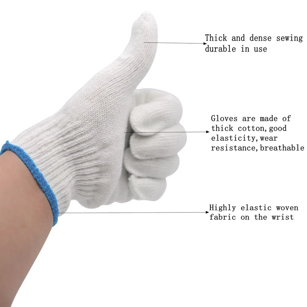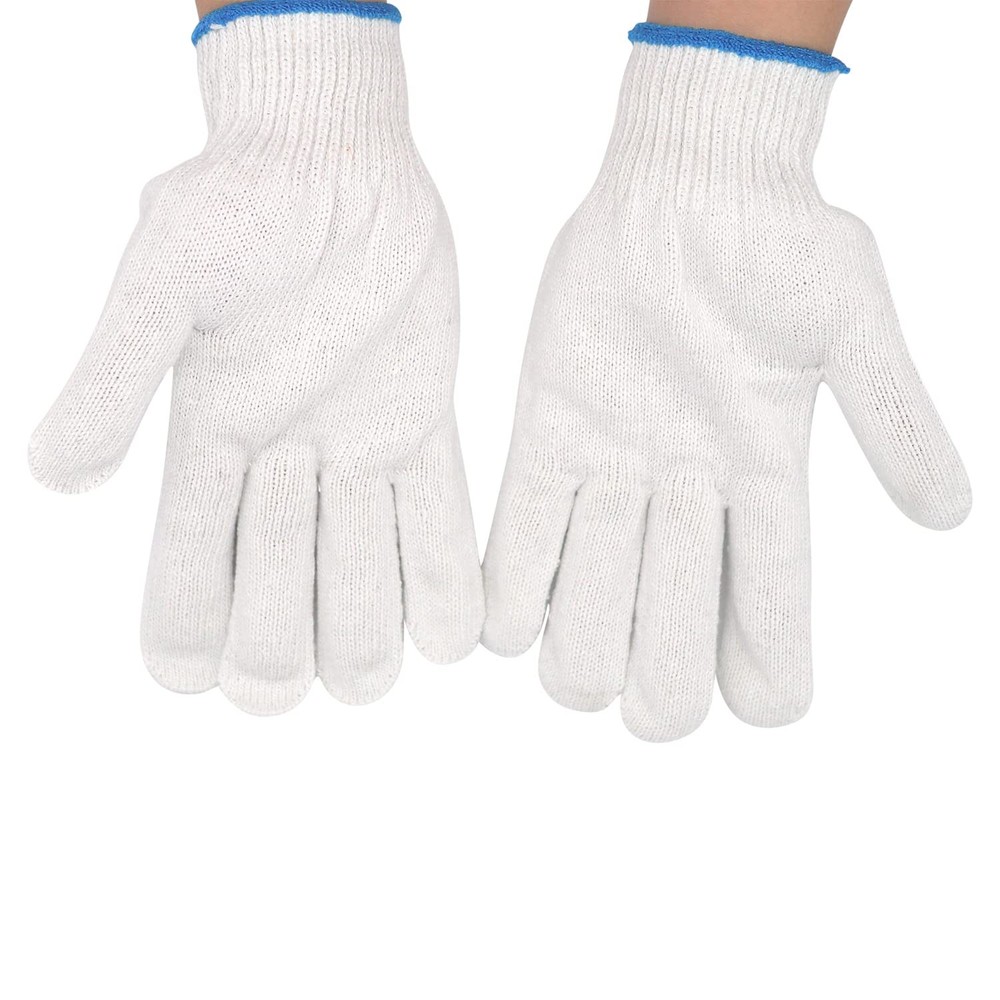 String Knit Work Glove 1.BREATHABLE AND COMFORTABLE:Cotton provide dry while helps absorb perspiration and the polyester provides a soft feel to keep hands comfortable 2.PACKAGE INCLUDING:you will get 12 pairs hand working gloves,which are wear-resistant and non-slip,launder-able,can be applied repeatedly and fit well for construction projects,these knit gloves will protect your hands well 3.NICE DESIGN:Safety Grip Protection Gloves white cotton environmentally friendly fabric material offer versatility, strength and durability. seamless polyester knit is comfortable and flexible and the cotton knit is soft against the skin 4.COMFORTABLE WEAR:Safety work gloves are form-fitting,cool,and snug,making them nice general-purpose gloves,seamless polyester knit is comfortable and flexible and the cotton knit is soft against the skin, so these white gloves are good enough to wear for long periods 5.EASY TO USE:These safety work gloves can protect your hands while you are doing duty and heavy work,these glove liners can also offer nice protection when you work in painter,mechanic,industrial,warehouse,gardening,construction or any lightweight work