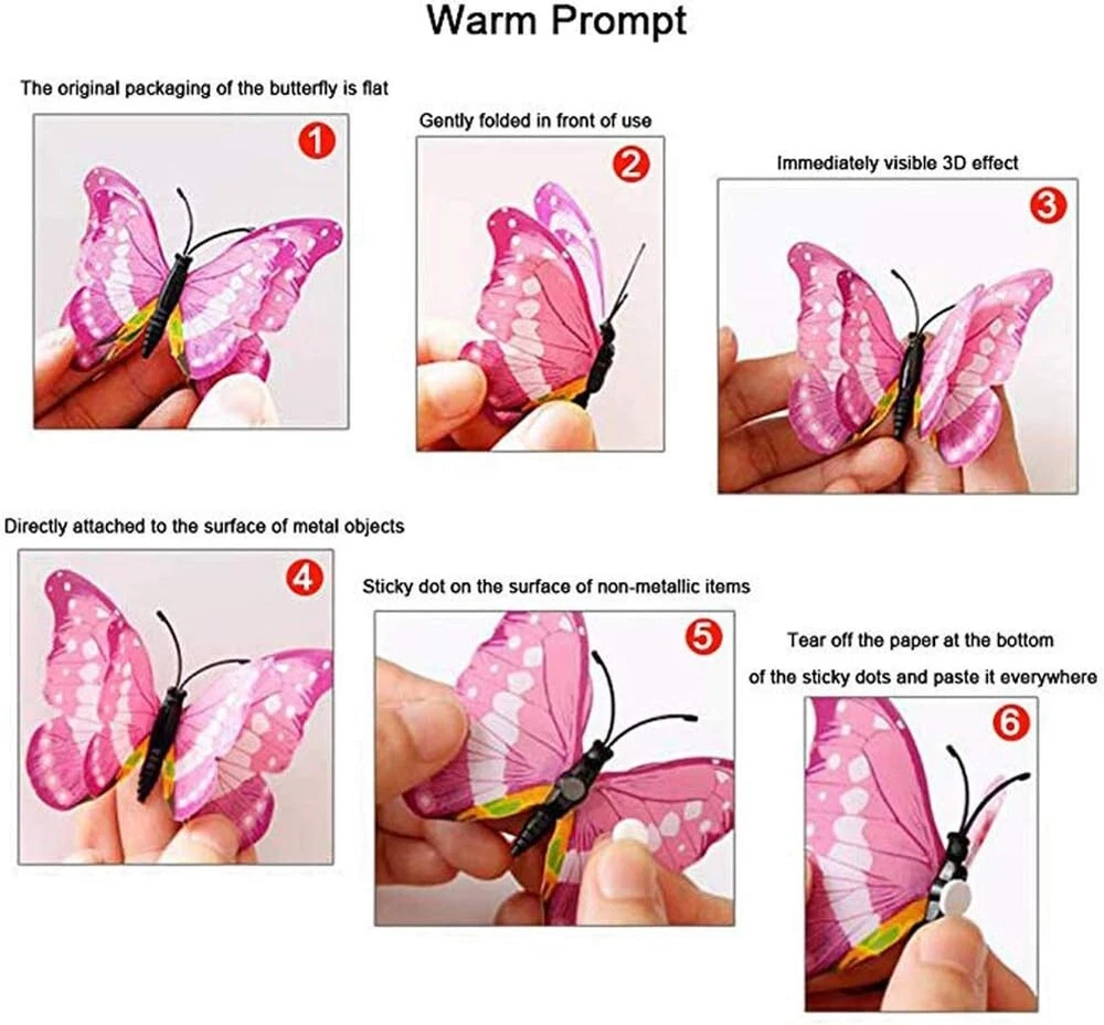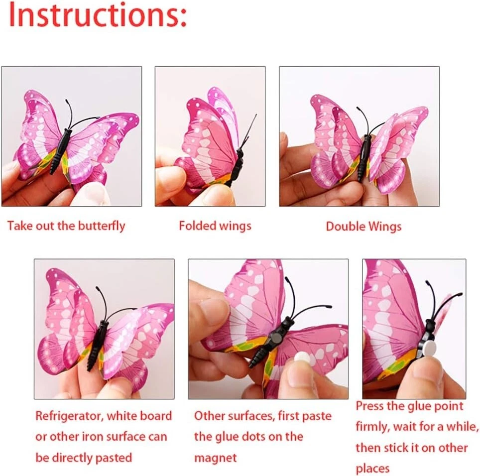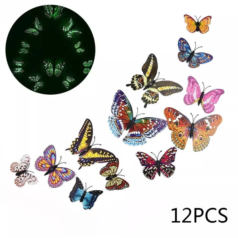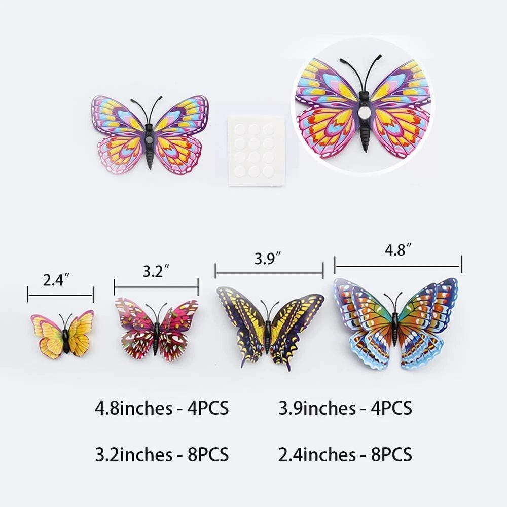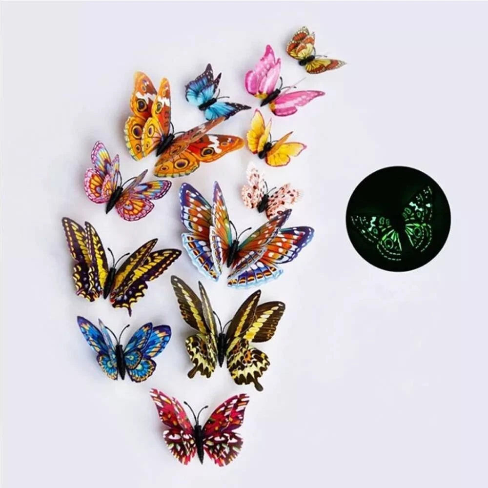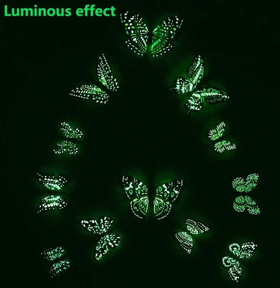 Product Description About this item Package Includes 12 lovely wall stickers in assorted sizes(4.8inches - 2PCS, 3.9inches - 2PCS, 3.2inches - 4PCS, 2.4inches - 4PCS) and comes with 12 pcs balloon glue points. Vivid and colorful 3D butterfly wall decal wings can be folded and they are adjustable, which makes every butterfly vivid like the real one, can glow at night. Butterfly wall decals are made of long-lasting and easy-to-clean PVC. They can be place in gardens, balcony and outdoors for a long time without colour fading. The magnet can be directly attached to the refrigerator or clean the place you want to stick the butterfly, use the balloon glue dots to paste them, and make sure their wings lift up. Our butterfly decorations is perfect in decorative theme parties, children's room, garden party, photography background, wedding, birthday, anniversary etc, making your life more colorful and meaningful with these butterflies wall decals. Various usages: The wall decals are perfect decoration for your kid’s bedroom, living room, hallways, cabinets, TV walls, and glass windows. Great DIY joy: A good way to develop the thinking ability and the practical ability of your children. Create warm atmosphere: These art stickers with stylish pattern add more colour to rooms, and create warm and energetic atmosphere. Removable Butterfly Decor Easy to apply and remove: These wall decals can be easily applied or removed, leaving no residue to protect your walls or refrigerator. Good material: The wall stickers are made of high-quality PVC plastic material, which is waterproof, removable. Specification: Color: Luminous Material: PVC plastic Size: 4.8inches - 2PCS 3.9inches - 2PCS 3.2inches - 4PCS 2.4inches - 4PCS Package Includes: 12 x Butterfly Wall Decals 12 x Balloon Glue Dots The stickers can be applied on all smooth surfaces, such as Walls, Doors,Closets, Plastic, Metal, Tiles, Fridges, Laptops, Cars etc. Please put the butterflies up on the clean wall and press them each for a minute. This model has fluorescent luminous effect. The product has magnets and the butterfly is double-layered, which has a three-dimensional effect. The butterfly is flat when it is convenient to transport and package. After receiving the goods, the wings can be folded and folded to reflect the take-off effect. Equal proportion of double-sided adhesive for easy paste Apply the double-sided tape to the round magnet on the back of the butterfly. Do not peel off the other side of the glue for 1-2 hours, then stick it to the wall, it will not fall easily Can be used multiple times, you just need to buy some double-sided adhesive. Butterfly wall decals - can last a long time, Easy to clean and use again Package content 12 colorful butterfly and got the magnet in the body of butterfly Type:Wall Decal & Wall Sticker Size: 6 -12cm. Pictures: Due to the difference between different monitors, the picture may not reflect the actual color of the item. We guarantee the style is the same as shown in the pictures, but not the same performance on different bodies as on the model. Thank you and happy purchase! Description: Gender:Unisex Type:3D Butterfly Age Range:>1T Color:As the picture Quantity:12 Pattern Type:Butterfly About us We are dedicated to providing premium products and services with the most reasonable prices. with each of its product under rigorous testing to ensure product quality, perfect performance and safety. We believe you will enjoy our products.