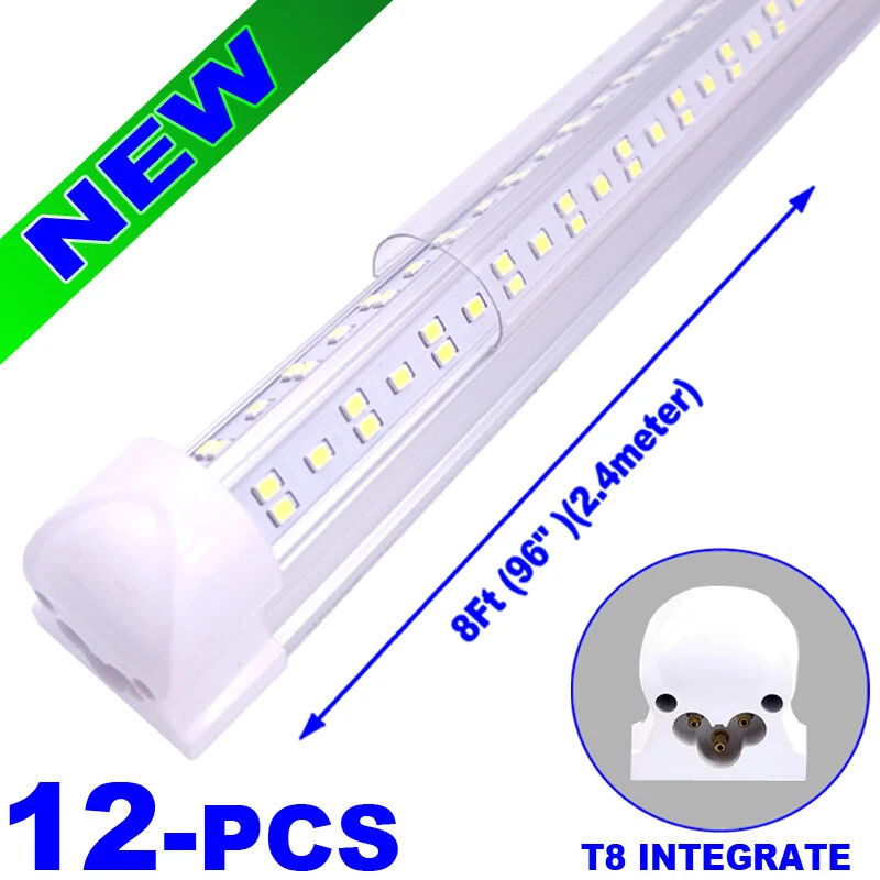 FAST DELIVERY - Ship from New Jersey or Los Angeles Warehouse via FedEx , 3-7 Days Delivered Your Door . SCIENTIFIC DESIGN - 8Ft LED Shop Lights Fixture is Made of 6500K Cold White SMD2835 LED Chip ,Plastic Clear Cover , Aluminum Bracket Housing ,and AC85-277V Constant Current Driver . It can work in -68F to 120F Temperature Conditions EASY INSTALLATION - The Integrated Tube Fixture Can be Install on Wall or Ceiling ,Easily Replace Traditional Fluorescent Tube Bulb . Plug and Play , Free Accessories (Power Cords, Connector , Extension Cords , Clip and Screw ) Come with Tube Lights Together WIDE APPLICATION - Linkable 8Ft Bulbs Widely Used in Garage Ceiling , Barbershop , Schools, Hospitals Basement , Factory Warehouses , Supermarkets Cooler Door , Offices, Shops,Hotels, etc 12/Pcs 8ft 144W Led Shop Lights Integrated 8 Foot Led Tube Light Garage Fixture FAST DELIVERY - Ship from New Jersey or Los Angeles Warehouse via FedEx , 3-7 Days Delivered Your Door . SCIENTIFIC DESIGN - 8Ft LED Shop Lights Fixture is Made of 6500K Cold White SMD2835 LED Chip ,Plastic Clear Cover , Aluminum Bracket Housing ,and AC85-277V Constant Current Driver . It can work in -68F to 120F Temperature Conditions EASY INSTALLATION - The Integrated Tube Fixture Can be Install on Wall or Ceiling ,Easily Replace Traditional Fluorescent Tube Bulb . Plug and Play , Free Accessories (Power Cords, Connector , Extension Cords , Clip and Screw ) Come with Tube Lights Together WIDE APPLICATION - Linkable 8Ft Bulbs Widely Used in Garage Ceiling , Barbershop , Schools, Hospitals Basement , Factory Warehouses , Supermarkets Cooler Door , Offices, Shops,Hotels, etc