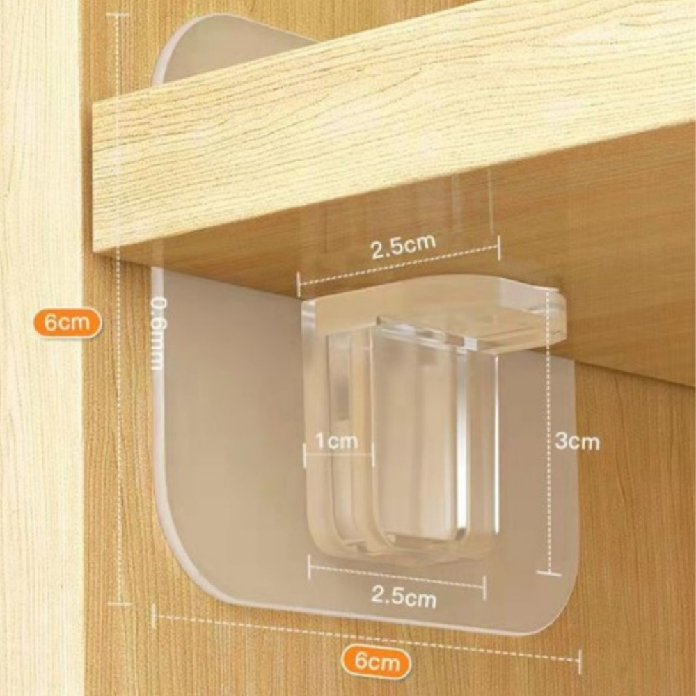 Strong Adhesive: Thanks to its high quality adhesive surface, it provides a firm grip without the need to drill holes for mounting. Easy Assembly: With its adhesive design, it can be easily mounted without any tools. Multipurpose Use: You can use it in cupboard interiors, wall corners or any area where you want to support a shelf. Robust Material: Made of durable and long-lasting materials, it can easily carry heavy loads. Aesthetic Design: Thanks to its transparent and minimalist design, it adapts to any decoration. Wide Area of Use: Ideal for use in various areas such as kitchen, bathroom, living room, bedroom and office. Usage Areas: Inside Cabinets: Perfect for creating extra shelf space in kitchen cabinets or reinforcing existing shelves. Bathroom: Use in bathroom cabinets or wall corners to organize shampoo, soap and other bathroom products. Office: Ideal for supporting desk or bookshelf shelves. Living room: Can be used to provide additional support for furniture such as a TV unit, bookcase or display cabinet.