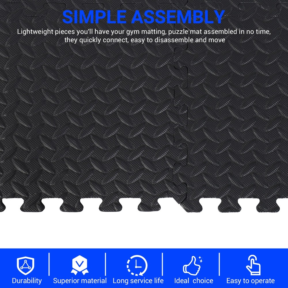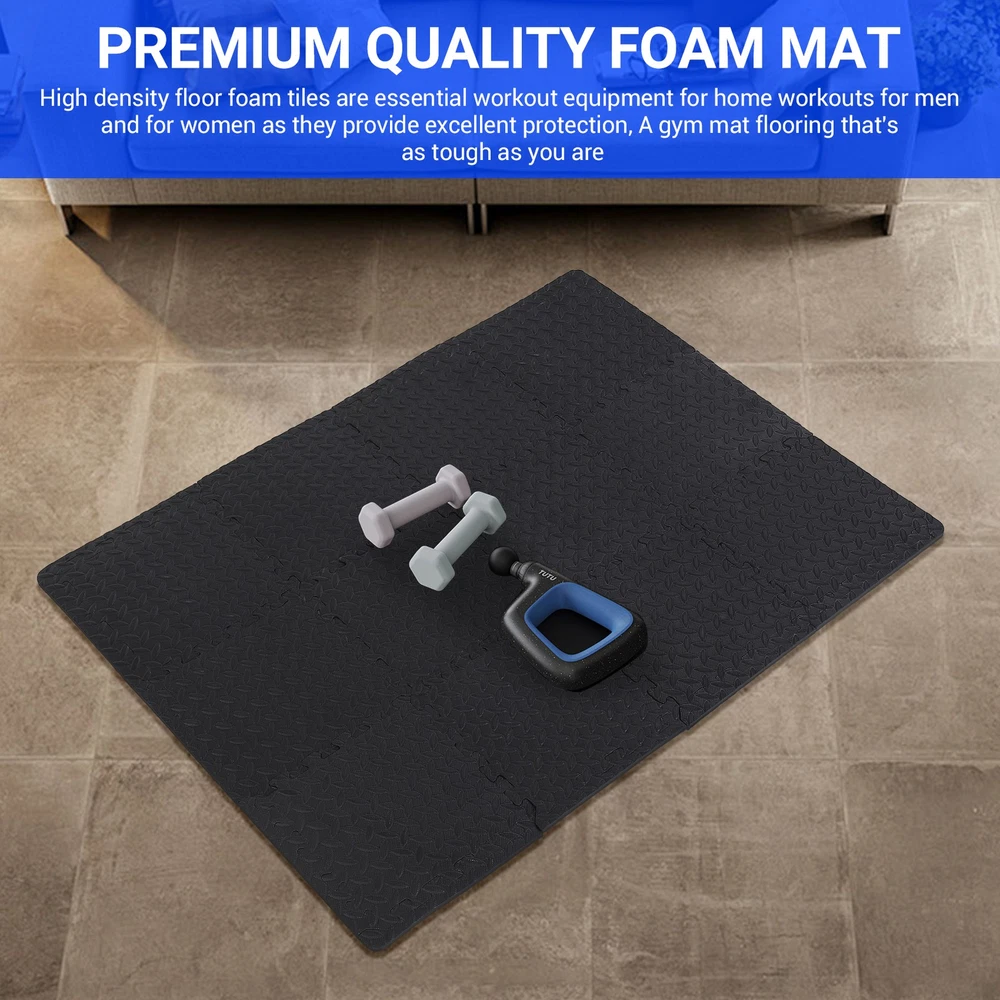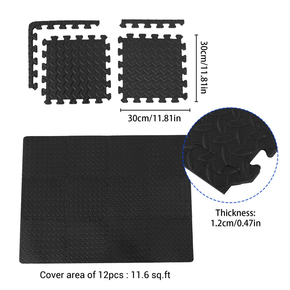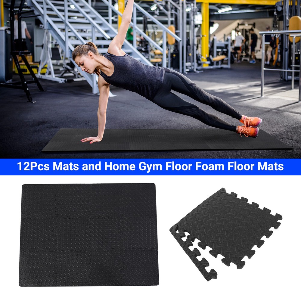12Pcs Mats and Home Gym Floor Foam Floor Mats Exercise Mat Floor Matt for5289 PROTECTIVE FLOORING Dense EVA foam floor tiles PROTECT FLOORS from home gym equipment creating a COMFORTABLE, cushioned workout space for gentle floor exercise, more versatile than an exercise mat for home, EASY to get in shape and stay in shape SIMPLE ASSEMBLY With pieces you'll have your gym matting, assembled in no time, they quickly connect, easy to disassemble and move HIGH QUALITY FOAM MAT High density floor foam tiles are essential workout equipment for home workouts for men and for women as they provide EXCELLENT PROTECTION, A gym mat flooring that's as tough as you are SAFE & LOW MAINTENANCE Non slip gym matt fitness mat workout mat with textured provides waterproof mat, noise reducing and easy to clean Colour:Black Material:EVA foam Size:30x30x1.2cm Package Contents: 12* carpet