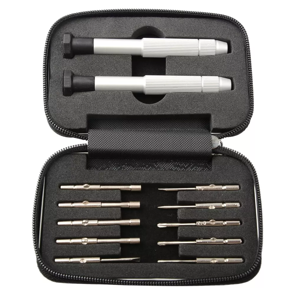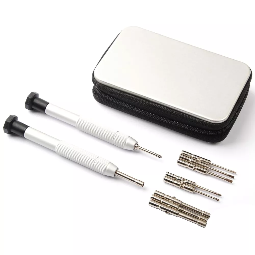 Specifications: - Material: High strength steel - Weight: 108g/0.238lb - Hand Length: 85mm/3.35" - Screwdriver Bits Length: 40mm/1.57" - Zipper Case Size: 105x65x25mm/4.1x2.6x0.98" Package Include: 2 x Screwdriver Handle 1 x Torx Sleeve Screwdriver(2.8) 3 x Flat Head Screwdriver(1.5/1.7/2.0) 3 x Phillips Screwdriver(1.5/1.7/2.0) 3 x Hex Nut Screwdriver(2.0/2.3/2.56) ❣ Note: Screwdriver are available for full-frame glasses and half-frame glasses, not suitable for his rimless glasses. ✔ How to use: Press down on the bits before removing it and then it can be easily removed. The top of glasses screwdriver can be rotated 360°, which is very easy to operate. Durable and unbreakable. ❤ Application: These screwdriver kits are perfect for repairing eyeglasses, watches, household appliances, mobile phones, toys, also ideal for smart phone, laptop, game console and most hand held electronics repair. Its more than a tools but important part in your DIY life, covered a wide range of works and repairs in our daily life. Professional Eyeglass Screwdrivers Kit: Travel pocket screwdriver set contains 2 pieces of multi-use single open-ended sockets set and 10-style rechange precision screwdriver blades. 10-Style Screwdrivers Includes: 3Pcs Flat head screwdriver(1.5/1.7/2.0), 3pcs Phillips screwdriver(1.5/1.7/2.0), 3pcs Hex nut screwdriver(2.0/2.3/2.56), and 1pcs Torx nut screwdriver (2.8). Scope of Application: These screwdriver kits are perfect for repairing eyeglasses, watches, household appliances, mobile phones, toys, and works and repairs in our daily lives. High Quality: Our screwdriver repair tools are made of high-strength steel, high-performance blades, and hardened heat treatments. Travel Pocket Screwdriver Set: With a steel polished pouch for easy carrying. Pouch size: 105x65x25mm/4.1x2.6x0.98". Small and compact to store and easy to travel with.