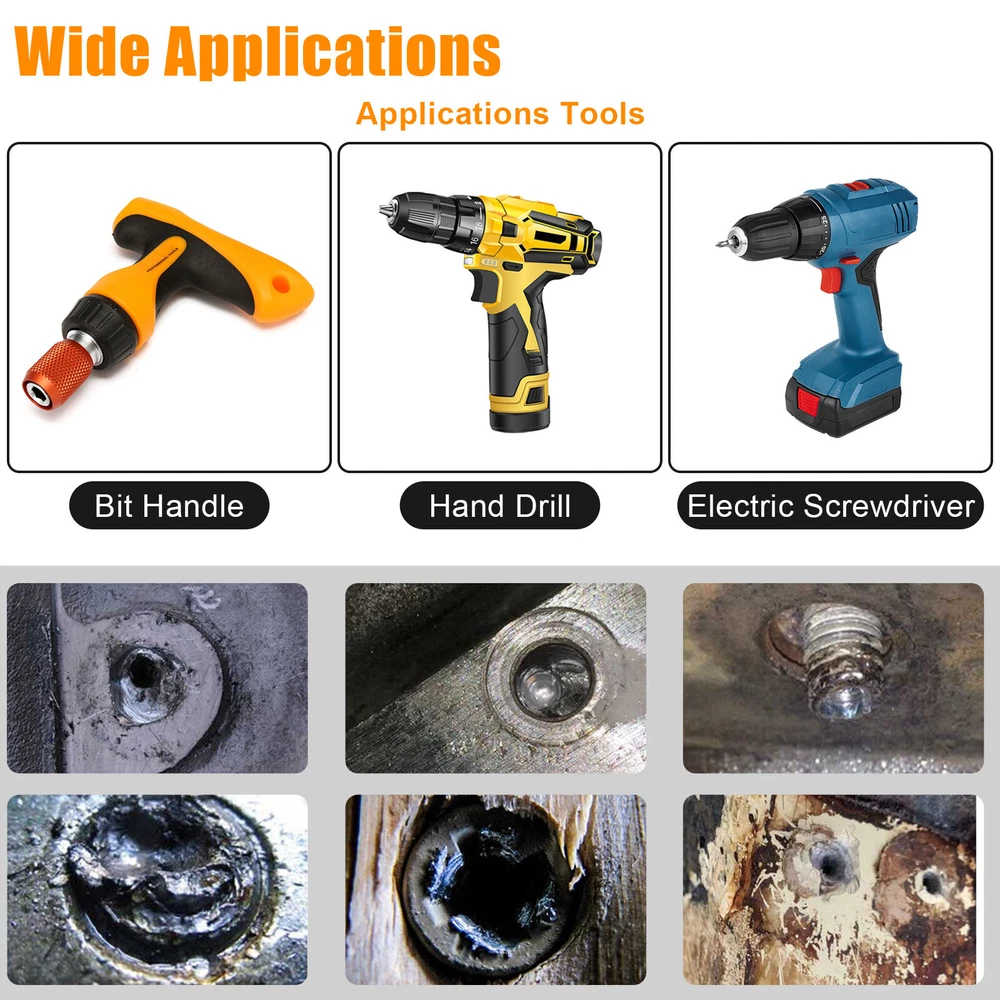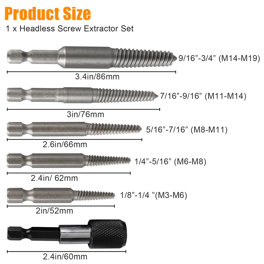 Product Feature ✨ Material: Our screw extractor set, crafted from high-quality alloy materials, ensures long-lasting reliability and durability. ✨ Size: Our 12-piece woodworking hex shank headless screw extractor kit includes 10 headless screws (50mm, 60mm, 61mm, 65mm, 74mm, 83mm, 2 pieces of each size) along with a 2pcs drill bit extension for added convenience. ✨ Hex Shank Design: Offers stable support, high-speed rotation, and even force distribution, compatible with various electric drills. ✨ Versatility: This screw extractor effectively handles broken head screws, stripped screws, stuck screws, and rusted screws, making it indispensable in various applications. ✨ Applications: Enhance your daily work, whether it's in car repair, home decoration, or craft production, with this versatile tool. Product Specification Type Screw Extractor Material Alloy Color Silver QTY 12PCS/Set Size #1 1/8”-1/4 ”(M3-M6) Size #2 1/4”-5/16” (M6-M8) Size #3 5/16”-7/16” (M8-M11) Size #4 7/16”-9/16” (M11-M14) Size #5 9/16”-3/4” (M14-M19) Package Included 🎁1 x Headless Screw Extractor Set On Oct 9, 2024 at 00:37:35 PDT, seller added the following information: