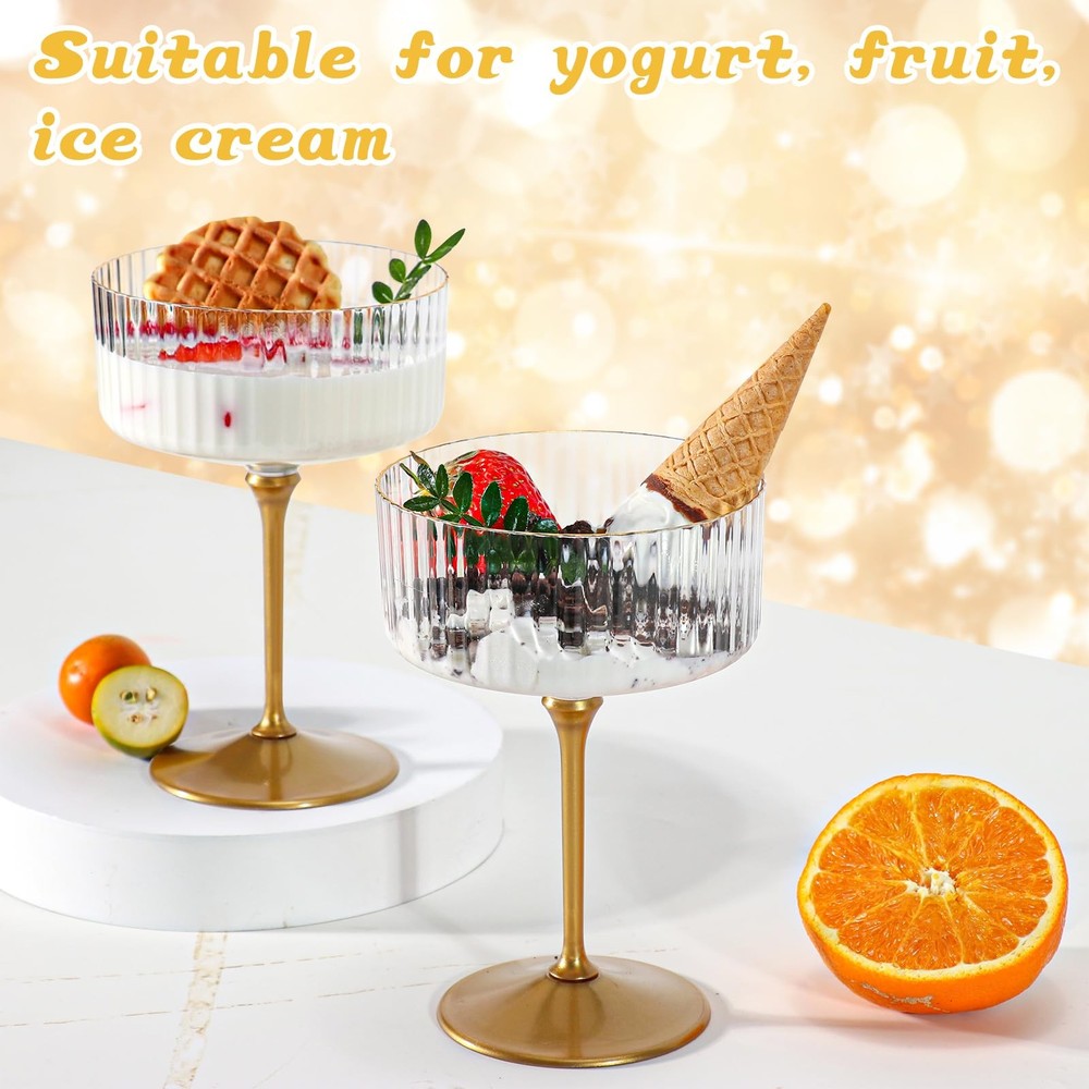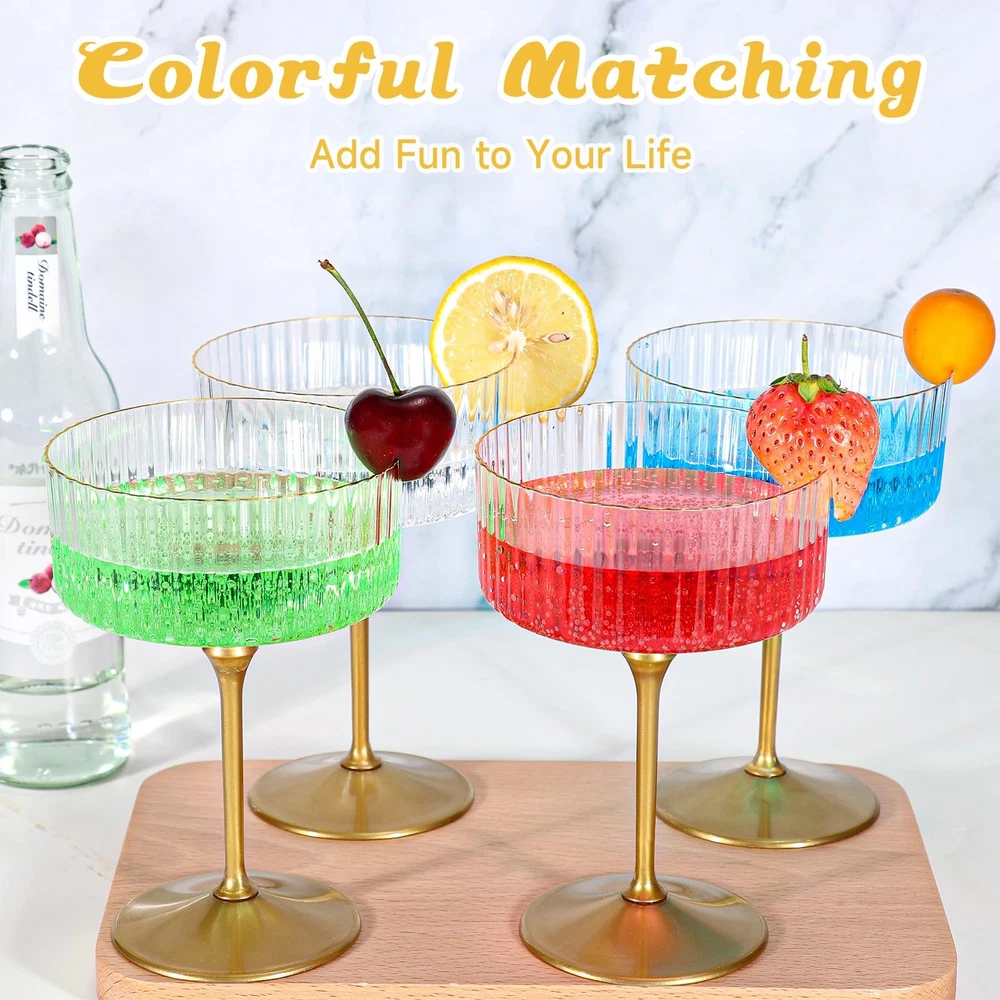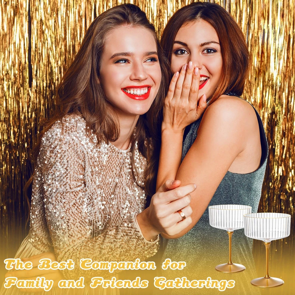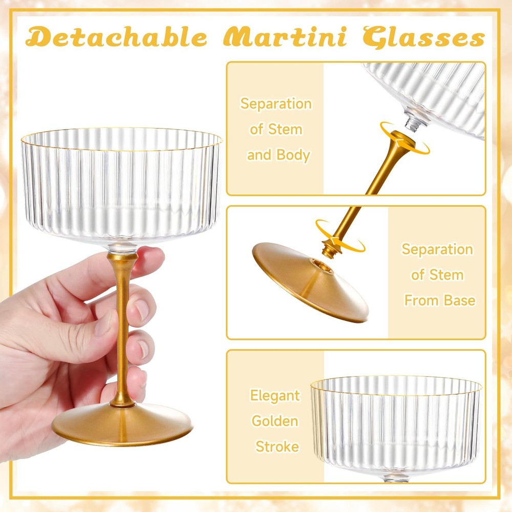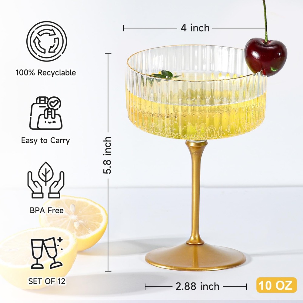 Material: plastic Color: gold pink Size:5.8*4*2.88 inch Application: Weddings, Engagements, Birthday,Party,wedding Note: Our cups are made of acrylic plastic, not glass. Perfect beverage capacity: Exquisite Martini Glasses, a set of 12 beautifully crafted wine glasses, combine style, durability, and versatility. These wine glasses are 5.8 inches tall and 4 inches in diameter, and can hold up to 10 ounces of your favorite champagne or cocktail. Our martini glasses will impress your home bar and receptions with their elegant and modern design. Durable and sustainable: Our martini glasses plastic are made of high-quality acrylic plastic, making them unbreakable and shatterproof. In addition, our cups are detachable, and its stem and base can be easily removed, which is very convenient to carry. You can put the removed cups into your carry-on bag without taking up too much space.Whether it's a picnic in the park, a day at the beach, or a boat trip. You can enjoy your favorite drink without worrying about accidental breakage, allowing you to fully enjoy the beauty of summer Eye-catching appearance: Our gold rim coupe glasses have a translucent pink appearance, well-made and with attention to detail, the pink hue adds vitality to your life, and the elegant gold-stamped cup mouth has a more noble luster, which enhances your entertainment experience Multiple beverages available: Our vintage coupe cocktail glasses add a touch of elegance to your collection of utensils, and the exquisite design adds charm to any drink, whether it is wine, champagne or cocktails, etc., can be served in our cups, whether it is a summer party or a party, you can impress your friends Multiple scenarios: Our martini glasses plastic are the best gifts for your loved ones, whether it is a birthday party, wedding dinner, bachelor party or anniversary, housewarming gift, etc., using a set of safe and unbreakable martini cups as a gift is a thoughtful and practical gift
