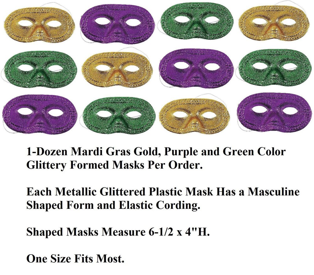 12-PC Glittery Mardi Gras Purple Gold Green Adult Half Masks Elastic String #_8 12-PC Glittery Mardi Gras Purple Gold Green Adult Half Masks Elastic String #_8 Click images to enlarge Description 12-PC Glittery Mardi Gras Purple Gold Green Adult Half Masks Elastic String. Hand out purple, gold or green plastic masquerade masks as Mardi Gras party favors and give your Fat Tuesday festivities an authentic New Orleans air of mystery. Details: Set of 1-Dozen (12-Pieces) 4 Gold Color Masks 4 Purple Color Masks 4 Green Color Masks Each Measures 6-1/2"Long x 3"High Made of Plastic Each with Elastic Band To Secure In Place One Size Fits Most Adults and Some Teens ~Buy more than one item at the same time from our eBay store and save in shipping costs!~ (If buying different items, just put them all in your cart before paying, to get the combined shipping discount!) WARNING TO CALIFORNIA RESIDENTS: This product can expose you to lead, a chemical know to the State of California to cause cancer, birth defects, and/or other reproductive harm. For more information, go to www.P65Warnings.ca.gov/product Shipping We use UPS SurePost, UPS, USPS and FedEx SmartPost to deliver our products to your home, depending on which method is more efficient for your order. We use suppliers for some of our orders and our suppliers will choose the service that is used for these orders. PLEASE MAKE SURE YOUR ADDRESS CAN BE VERIFIED BY USPS. Please allow 7-10 days for the item to reach your home. We cannot be responsible for items shipped to incorrect or incomplete addresses, which may result in the cancellation of your order. YES, we do combine shipping! The highest shipping cost item ships at regular price, and each additional item ships at $2.00 more in additional shipping charges. If you are buying several different items from our store, put them all into your cart before paying to get the combined shipping discount. Terms of Sale Unless otherwise noted, we accept returns up to 30 Days after your purchase, through the eBay Returns System. Please use eBay to contact us if there is any problems or issues with your order. In some cases, we order the item purchased from one of our suppliers, and it is shipped directly from our supplier to the customer. There are times when an item unexpectedly becomes unavailable from our supplier. We do our best to check on all of the items availability several timea a day. If an item is unexpectedly unavailable, we will issue a refund immediately. Contact Us Please use the message center in eBay to contact us. We check our message box in eBay several times a day. If you have any questions or concerns with your order, please feel free to contact us. We care very much about our customers being 100% happy with their purchases. We would very much appreciate you letting us resolve any issues you may have with your order by contacting us first, before taking any other unnecessary actions. Get images that make Supersized seem small. Showcase your items with Auctiva's Listing Templates! THE simple solution for eBay sellers.