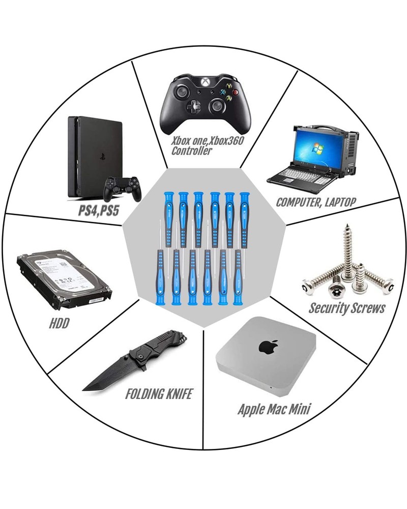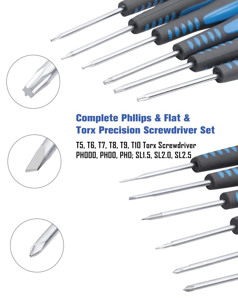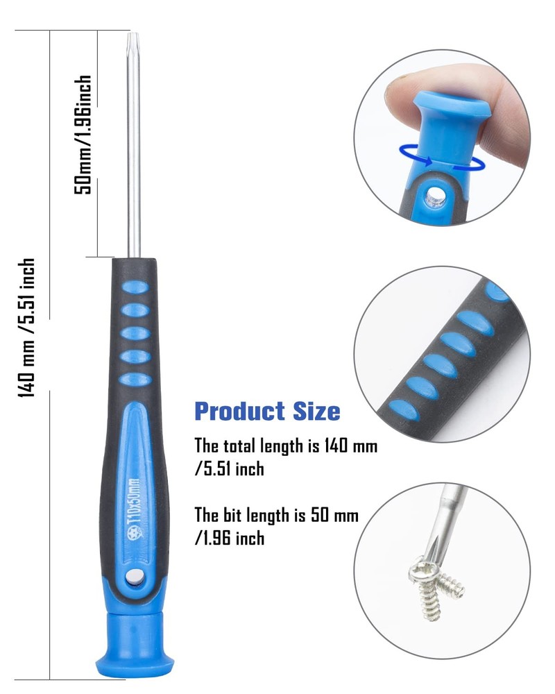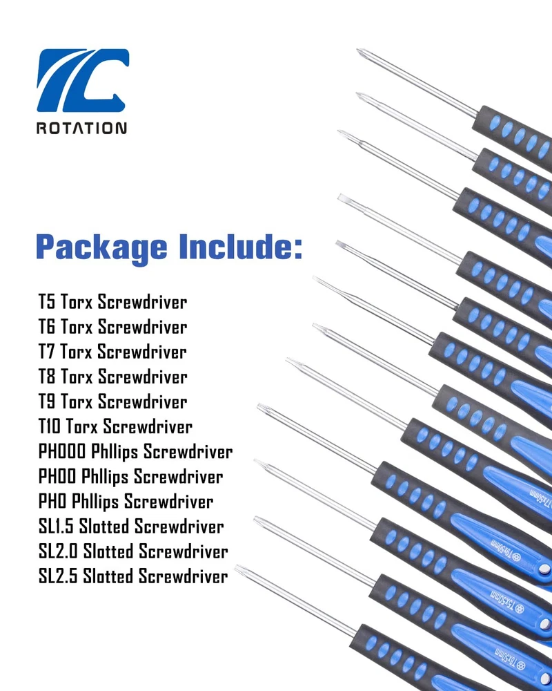 T5, T6, T7, T8, T9, T10; PH000, PH00, PH0; SL1.5, SL2.0, SL2.5 Pack with paper box Set includes: 12-Pieces mini screwdrivers with sizes of - T5, T6, T7, T8, T9, T10 torx star Screwdriver; PH000, PH00, PH0 Phillips Screwdriver; SL1.5, SL2.0, SL2.5 Slotted Screwdriver. Size: The screwdriver measures the total length 5.51 inch/140 mm, the bit length is 1.96 inch/50 mm. Non-Slip Handle: The swivel end cap of the precision magnetic screwdriver allows constant finger pressure while driving, and the non-slip rubber grip offers maximum turning power. High-Quality: screwdrivers are made of heat-treated chrome vanadium steel, having good anti-corrosion performance, stronger and tougher than most carbon steel, significantly increase the durability. Multipurpose: 12-Piece precision screwdriver is an ideal choice for your daily maintenance of electronic products, mobile phones, watches, glasses, jewelry, toys and other precision items