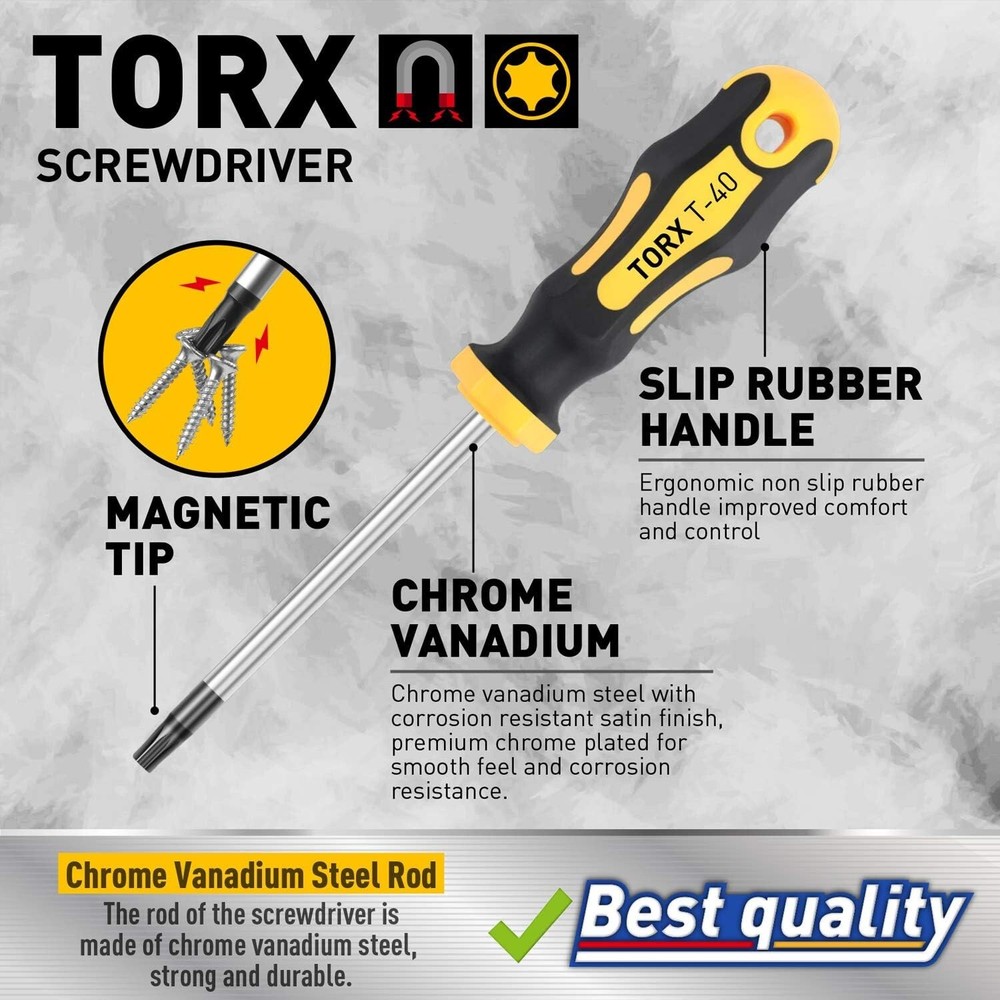 FREE SHIPPING Amartisan 12-Piece Magnetic Torx Screwdrivers Set, Magnetic Torx Driver Star Screwdrivers Set T5 - T40 Best Choice Product Description: Tackle any star screw project with confidence using the Amartisan 12-Piece Magnetic Torx Screwdriver Set. This precision-engineered set includes T5 to T40 Torx drivers, making it ideal for a wide range of tasks—from electronics and automotive repair to furniture assembly. Built with magnetic tips and ergonomic handles, it ensures comfort, control, and efficiency for both professionals and DIYers. Key Features: 🔩 12-Piece Set (T5–T40) – Comprehensive Torx range covers most star screw needs 🧲 Magnetic Tips – Securely hold screws for easy placement and removal 🔧 Durable CR-V Steel Shafts – Corrosion-resistant and built for long-lasting use ✋ Ergonomic Non-Slip Handles – Comfortable grip reduces hand fatigue during extended use 🛠️ Versatile Applications – Perfect for electronics, appliances, bicycles, automotive, and more 🎁 Organized & Portable – Comes with labeled storage pouch or box for easy tool access