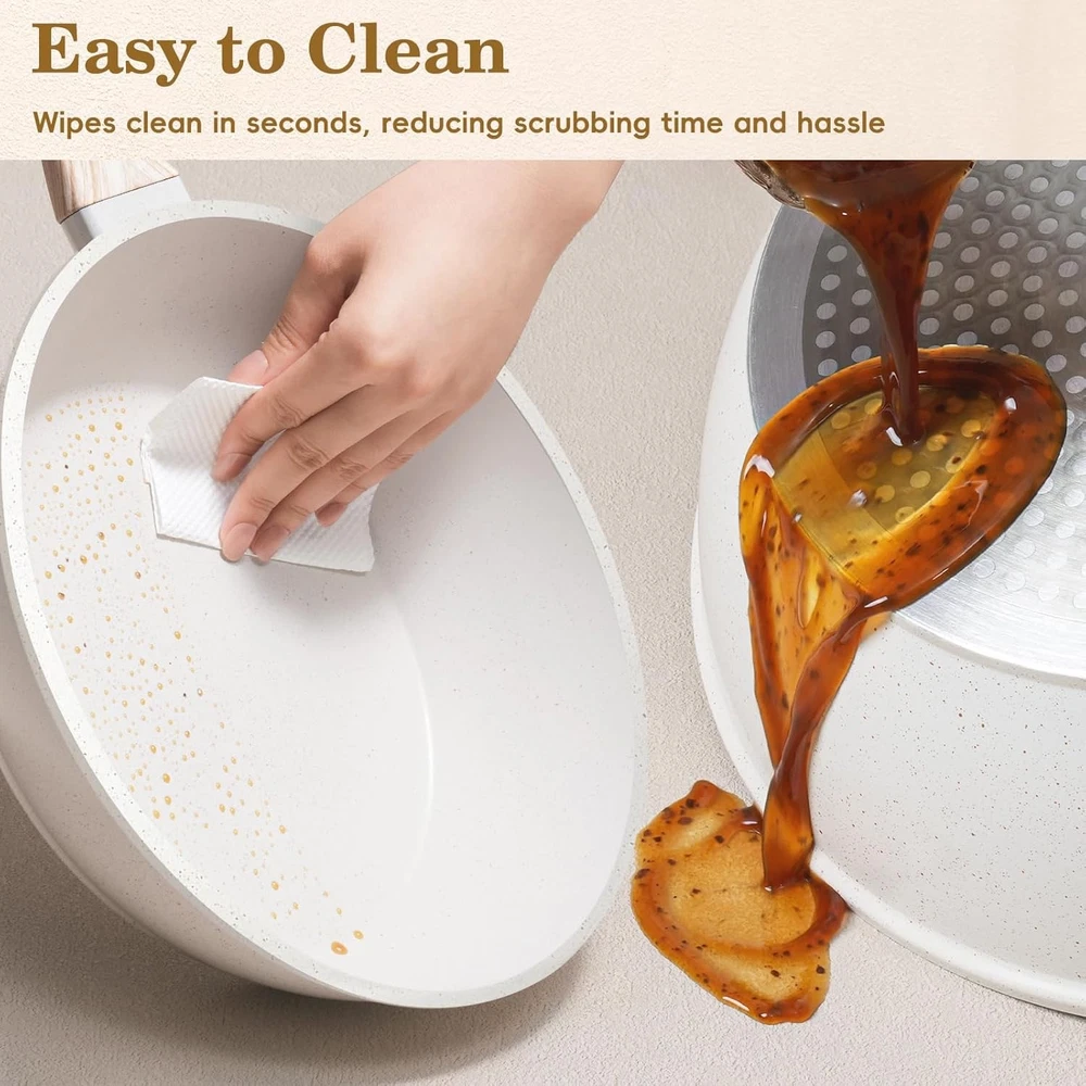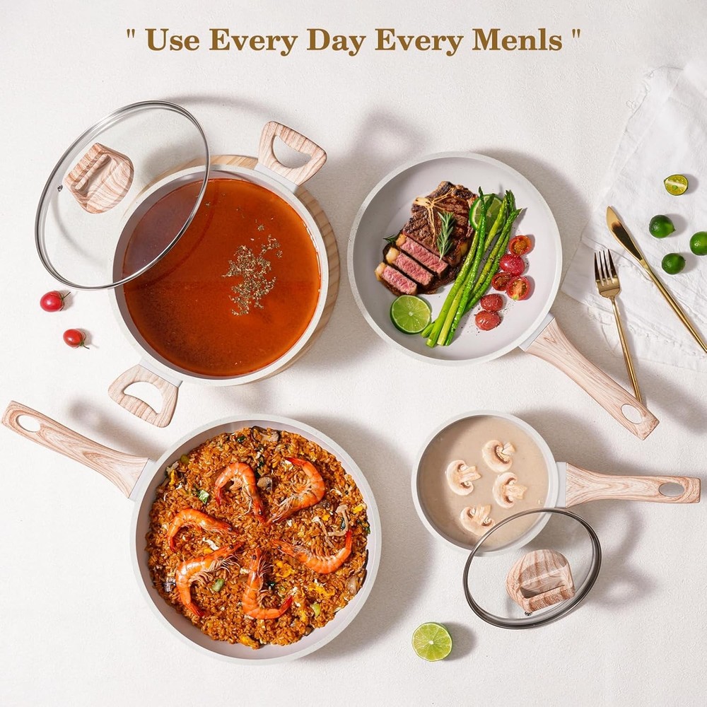 12 Pcs Pots and Pans Set Non Stick, Cookware Sets White Granite Induction Cookware, Non-toxic Healthy Nonstick Kitchen Cooking Set with Frying Pans Set, Saucepans (PFAS/PFOA/PFOS Free) Item Description About this item All-in-One Cookware Set – From frying and boiling to simmering and sautéing, this nonstick pots set includes frying pan, saute pan, casserole, milk pots and pan protectors. Simplify your kitchen with this complete pots and pans set—thoughtfully curated to cover all your daily cooking needs. Safe, Non-Toxic Cookware You Can Trust - Designed for healthier, worry-free cooking. Crafted with a durable granite non-stick coating free from harmful chemicals like PFOS, PFOA, lead, and cadmium, this pots and pans set ensures your meals are as clean and wholesome as the ingredients you use. Nonstick Performance for Effortless Cooking – Featuring a high-quality nonstick coating, food slides off effortlessly without sticking or burning, so you can cook with less oil and enjoy healthier meals every day. Easy to Clean – Spend Less Time Scrubbing, More Time Cooking. Simply wipe with a sponge or rinse under water to clean these pans sets—no soaking, no scrubbing, no stress. Die-Cast Aluminum Construction –Engineered for even heat distribution and long-lasting durability, each piece is crafted from premium die-cast aluminum that heats up quickly and cooks food evenly—eliminating hot spots and ensuring consistent results. Compatible with All Stovetops – This pots and pans set non stick is designed to perform flawlessly on all stovetops—including gas, electric, ceramic, glass, and induction. Stay-Cool Handles & Secure Lids – Ergonomic, heat-resistant handles provide a comfortable grip, while tempered glass lids lock in moisture and flavors. › See more product details Payment We accept payment only through PAYPAL Shipping We ship products worldwide through standard express courier service, it will reach within 7 to 10 days to abroad buyers, we ship the product after recieved clear payment and give full information about shipment to the buyer Return We accept product return within 14 days from delivery date but product should be in original condition, and the return shipping charges will be buyer responsibility.