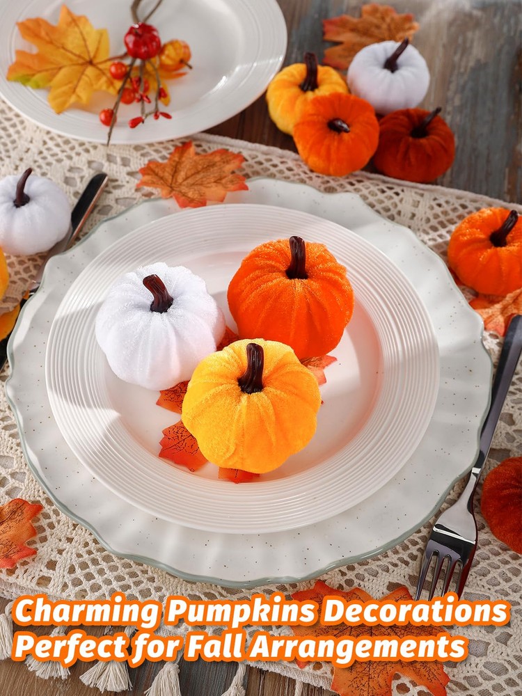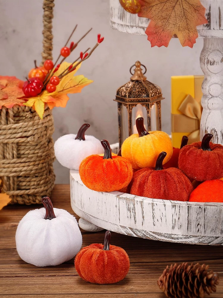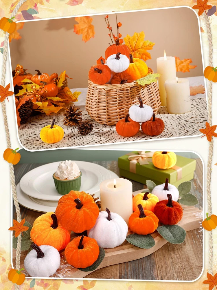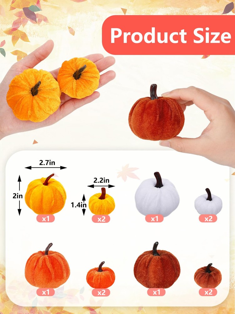 Do you want to make your house better decorated for autumn? Do you want to prepare a unique fall dinner for your friends and family? Do you want to spend a more memorable Thanksgiving Day? Try these elegant assorted fabric pumpkins! Product Specifications Shape: Artificial pumpkins Material: Velvet and foam Color: Orange, yellow, white, brown Dimensions: 2.7in x 2in, and 2.2in x 1.4in Package: 12 fabric pumpkins Product Feathers High-Quality Materials Pumpkins symbolize harvest and abundance, and the velvet material enhances their luxurious appearance compared to plastic alternatives. Perfect for Festivals and Fall These pumpkins are perfect for fall, Halloween and Thanksgiving, providing a farmhouse festive touch as you prepare your home for the celebrations. Symbol of Abundance Bring the spirit of autumn into your home with these delightful velvet pumpkins, and enjoy a season filled with warmth, color, and charm! Vibrant Fall Colors: This set includes 12 velvet artificial pumpkins in 4 autumn-inspired colors: orange, yellow, white, brown. These pumpkin colors symbolize autumn and complement the red and yellow hues of autumn leaves, capturing the season's sight and atmosphere. Exquisite Designs: Crafted from foam and wrapped in luxurious velvet fabric, these assorted fabric pumpkins offer a rich, sophisticated texture. The realistic design, complete with a natural-looking stem, adds an elegant touch to your fall decor, making them a standout piece for any setting. Ideal Autumn Decorations: Perfect for autumnal home decor, these charming velvet pumpkins enhance any space. Use them to decorate dining tables, fireplace, wide-mouthed vases, wooden bowls, decorative tiered trays, bringing a cozy, festive feel to your home. The Right Size: You will receive four small pumpkins, each 2.7 inches in diameter and 2 inches tall, and eight smaller pumpkins, each 2.2 inches in diameter and 1.4 inches tall. Different sizes of pumpkins will create a more layered autumn decoration effect. Easy to Clean: These farmhouse pumpkins decorations are easy to maintain. They resist stains and can be effortlessly wiped clean or washed to keep them looking pristine. Enjoy a fall filled with warmth, color, and charm with these delightful velvet pumpkins!