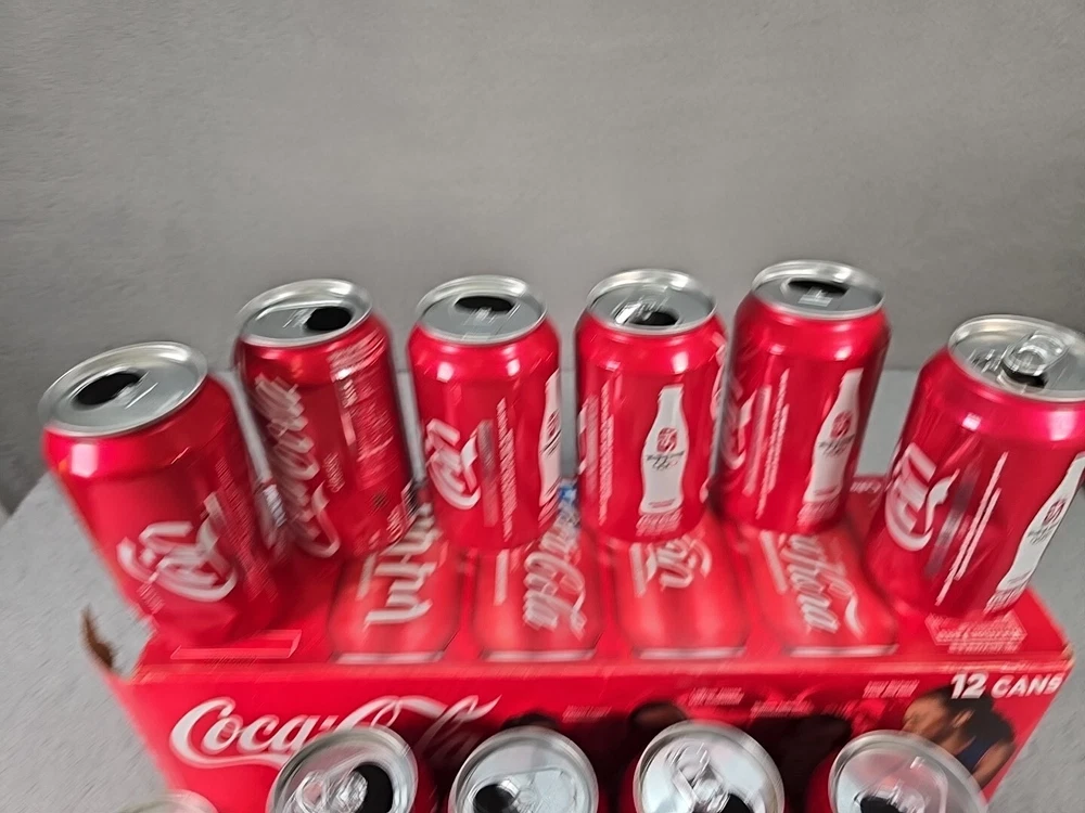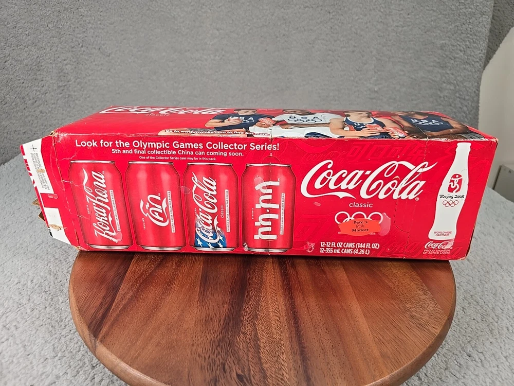 This product is a 12-Pack Carton of Coca-Cola 2008 Beijing, China Olympics Empty Cans featuring LeBron James. The cans are original, multi-color, themed around soda, and were manufactured in the United States. It is a collectible advertising item related to the Coca-Cola brand. Some cans are dented please see photos