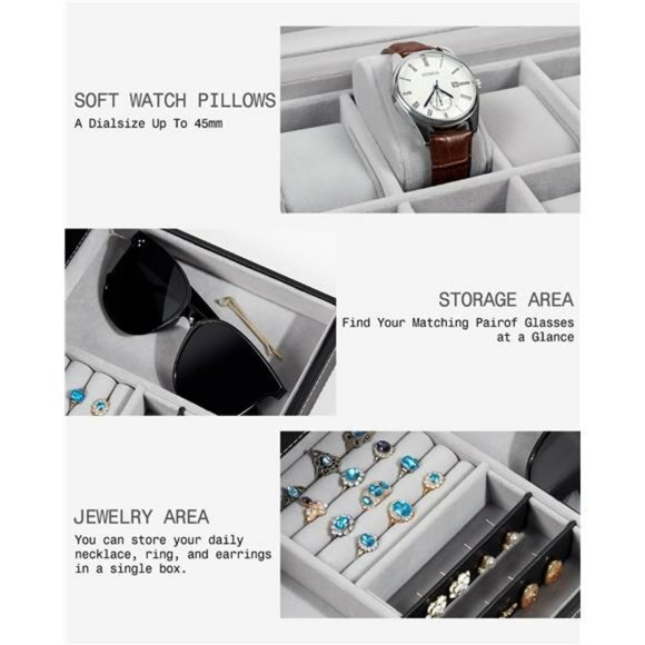 NEW! - Watch Box, 12 Slot Watch Case for Men with Real Glass Lid - DOUBLE LAYER WATCH BOX: In the top layer of the jewelry case, there are 12 watch slots with removable velvet pillows. And in the bottom layer, there are adequate suitable area for your cufflinks, necklaces, bracelets, earring, brooches, sun glasses and any other jewelry and belongings. - Made of quality black faux leather and soft velvet, and Real glass lid that keeps your watches from dust, offers you an open view of the displayed watches. - Gift for him boyfriend husband fathers day gift wedding bridal gift prom gift valentines day gift for men THANK YOU!