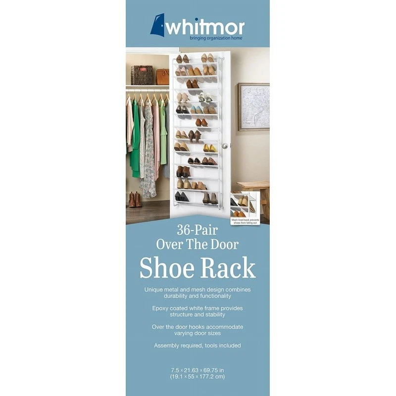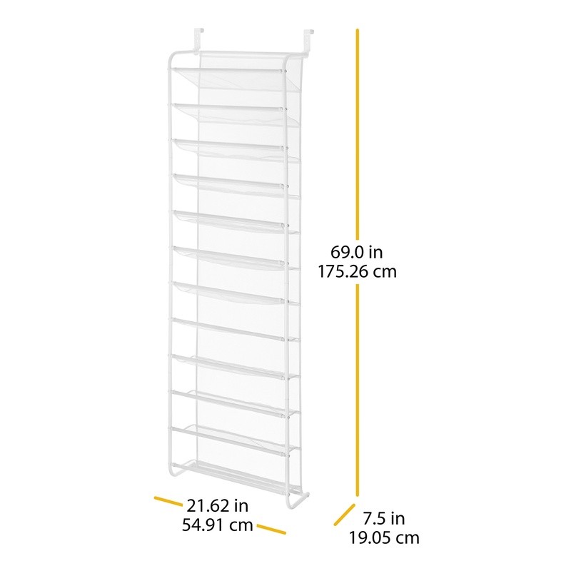 You may also like 4 Tier Closet Shelves Storage Organizer Multi Purpose Shoe Rack Indoor Home Use 33.55 USD 35.32 USD Free shipping 5% off 3-Tier Shoe Rack Storage Organizer Closet Entryway Bathroom Holds 15 Pairs New 25.13 USD 26.45 USD Free shipping 5% off Stackable 2-Tier Metal Mesh Shoe Rack Organizer Storage 9 Pairs Durable Design 25.92 USD 27.28 USD Free shipping 5% off 10-Tier Shoe Rack Organizer Holds 50 Pairs Nonwoven Shelves Indoor Storage Unit 28.54 USD 30.04 USD Free shipping 5% off Clear Plastic Extra Wide Shoe Box Stackable Storage Container W/ Lid Ventilation 10.49 USD 11.04 USD Free shipping 5% off Extra Tall Shoe Box W/ Lid Stackable Clear Plastic Organizer High Heels New 12.78 USD 13.45 USD Free shipping 5% off Clear Plastic Boot Box W/ Lid Stackable Shoe Organizer Adults Storage Solution 20.67 USD 21.76 USD Free shipping 5% off 5 Tier Shoe Rack Organizer 25 Pairs Sneakers Boots Space Saving Storage New 25.47 USD 26.81 USD Free shipping 5% off 5 Tier Shoe Rack Shoe Storage Organizer Industrial Rustic Brown Ink Black Stand 83.92 USD 88.34 USD Free shipping 5% off Rotating Shoe Rack 3 Tier Freestanding Organizer Holds 18 Pairs Storage New US 39.13 USD 41.19 USD Free shipping 5% off Entryway Metal Iron Hall Trees W/ 3-Tier Shoe Rack 18 Hooks Living Room Bedroom 55.78 USD 58.72 USD Free shipping 5% off Stackable Expandable 3-Tier Shoe Rack Wood & Chrome Storage Organizer 18 Pairs 35.38 USD 37.24 USD Free shipping 5% off Whether your shoe collection is all about function or an extension of your style, keeping them neat and accessible means getting out the door a little easier. While using that dead space behind your door, this shoe rack holds up to 36 pairs of shoes. It saves time while also protecting your investment. The unique metal and mesh design combination optimizes durability and functionality. The mesh-lined back prevents shoes from falling out while protecting the door from scuffs. The over-the-door hooks adjust to accommodate varying door sizes. 's promise is that we stand behind our product 100%. Call us and we will gladly assist you in your language. com. 12-Tier Over the Door Mesh Shoe Rack : Instantly add more closet storage for up to 36 pairs of shoes with this hanging over-the-door shoe rack Great space-saving solution for apartments and dorm rooms Works for heels, flats, boots, and sneakers Assembled Dimensions: 7. 5 x 21. 63 x 69. 0 inches Easy assembly, no tools required The shoe rack can hang on the front or back of the door Durable white resin construction Style # 6037-7037-WHT, 12-Tier over the door Mesh Shoe Rack - 36 Pair - Metal - White You may also like Lot of 2 Natural Bamboo Quiote Bird Nesting Material Logs Parrots & Small Birds 25.4 USD 26.74 USD Free shipping 5% off Hip Grip Laundry Basket W/ Comfortable Handles Durable Plastic Adults Tweens New 14.59 USD 15.36 USD Free shipping 5% off Solid Wood 6+2 Drawer Roll Cart Home Storage Craft Organizer on Wheels New 136.9 USD 144.11 USD Free shipping 5% off Vibrating Alarm Clock Super Loud Rechargeable Bed Shaker Heavy Sleepers New 43.87 USD 46.18 USD Free shipping 5% off Self-Seal Honeycomb Padded Mailer Eco-Friendly Durable Shipping 10 Pack New 13.75 USD 14.47 USD Free shipping 5% off Ceramic Speckled Ribbed Vase Decorative Pot Indoor Plants Home Decor 4.5 Inch US 10.19 USD 10.73 USD Free shipping 5% off Adjustable Feeding Booster W/ Swing Tray Toddler Dining Chair Easy Clean New 41.55 USD 43.74 USD Free shipping 5% off Double Face Satin Ribbon Craft Wedding Bows Event Decor Gift Wrap 100 Yards New 14.59 USD 15.36 USD Free shipping 5% off Multicolor Leaf Block Indoor Area Rug Non-Slip Stain Resistant 5x7 Machine Made 64.79 USD 68.2 USD Free shipping 5% off Lift Top Coffee Table W/ Hidden Storage Shelves Clutter Free Design Indoor Use 145.81 USD 153.48 USD Free shipping 5% off Adjustable Wire Mesh Baby Safety Gate Easy Install Pressure Mount 31in Tall New 43.83 USD 46.14 USD Free shipping 5% off 3-Tier Corner Wall Shelf Display Storage Unit Easy to Install Home Office New 33.91 USD 35.69 USD Free shipping 5% off