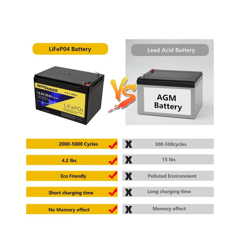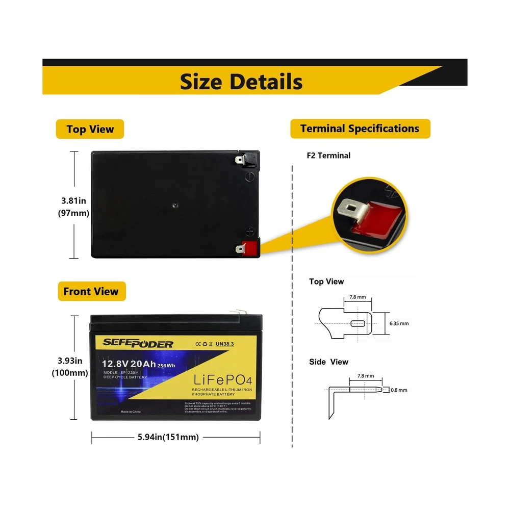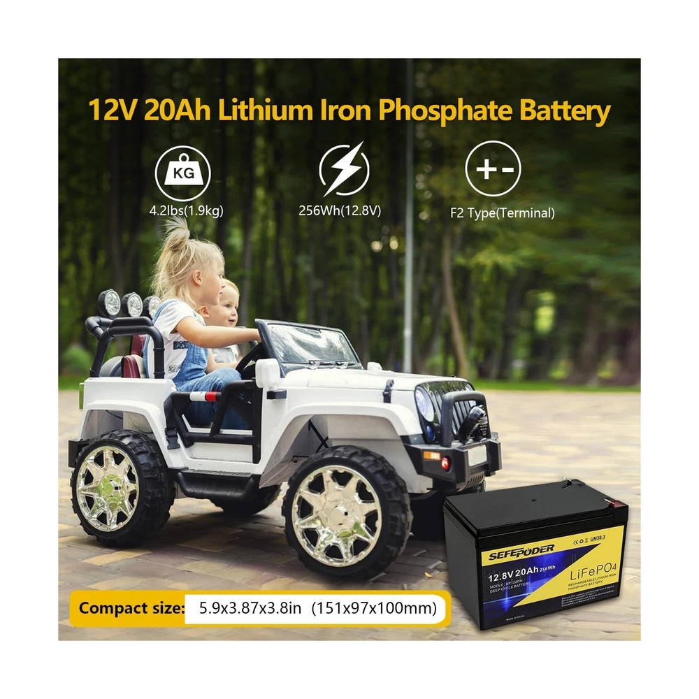 12V 20Ah Lithium LiFePO4 Deep Cycle Battery 2 Pack, 4000+ Cycles Rechargeable Battery for Electric Scooter, Ride On Toy, Lighting, Power Wheels, Fish Finder and More with Built-in 40A BMS Description Features: Excellent Performance: Sefepoder LiFePO4 batteries are made of high quality cells with high energy density, Long cycle life, Good safety performance, no memory effect, etc. The batteries are only 1/3 of the weight of lead-acid batteries of the same capacity!More safety and environmentally friendly than lead-acid batteries. Safe and Reliable: LiFepo4 batteries will not burn when overcharged, overdischarged, overcurrent or short-circuited, and can withstand high temperatures without decomposing, with built-in BMS protection against overcharge, overdischarge, overcurrent and short-circuit circuits. Can be connected in series or parallel, up to 4 identical batteries in series, 10A fast charge, output discharge up to 20A continuous and 3C pulse. Long service life: Lithium-ion batteries 4000+ cycles no problem, while traditional lead-acid batteries only 200-300 cycles, no memory effect, no matter what state the battery is in, a charge can be used. Wide Applications: Widely used in most fields, such as: Electric Scooter, Lighting, 12V router, RV/outdoor camping, riding toys, power wheels, fish finder, amateur radio, solar/wind energy, 12V router, Kayak,off-grid applications, etc. What You Get:2*12V 20Ah LiFePO4 battery, 12 months warranty, If you have any questions, please feel free to contact us(please use LiFePo4 special charger, with automatic SLA charger may not be full) Product Details: Brand: SEFEPODER Size: 12V 20Ah-Mini-2 Pack Product Dimensions: 5.94"D x 3.85"W x 3.74"H Terminal: F2 Terminal Manufacturer: SEFEPODER Product Dimensions: 5.94 x 3.81 x 3.71 inches Item Weight: 7.93 pounds Item model number: SP-1220-Mini Batteries: 1 12V batteries required. (included) Date First Available: June 25, 2024 Manufacturer: SEFEPODER Country of Origin: China Delivery We Do Not Ship Outside of the Continental US. Return Policy All items qualify for returns within 30 days of receipt. Buyer is responsible for return shipping on any item that is not damaged. Feedback We take our reputation seriously, we buy and sell online, so we understand the value of trust. If you are unsatisfied with your order, please contact us and we will work with you to resolve it to your satisfaction.