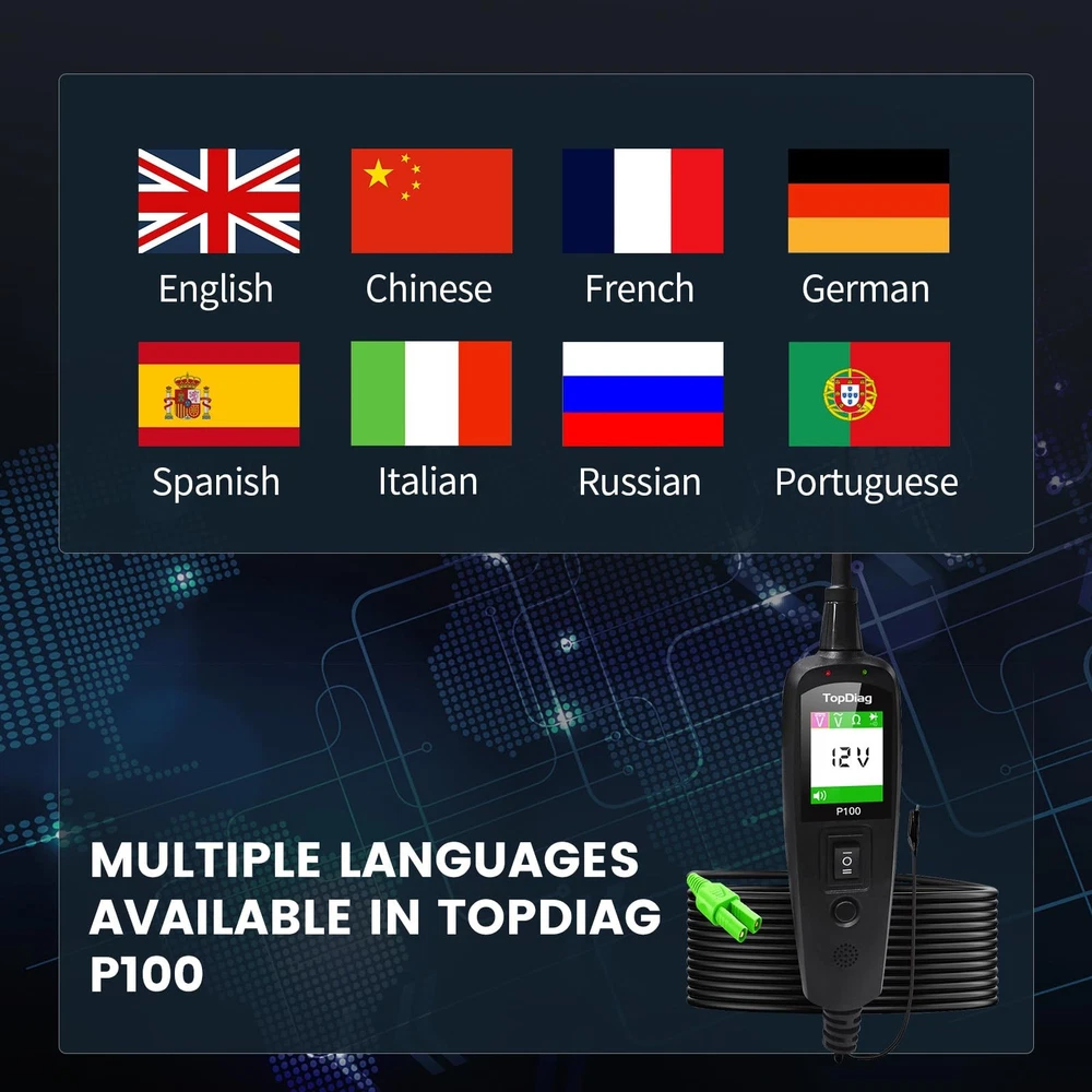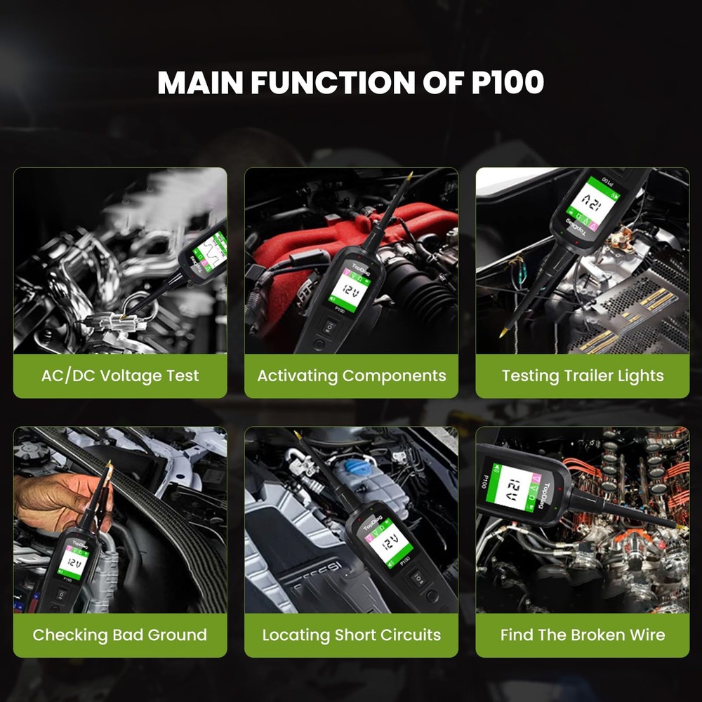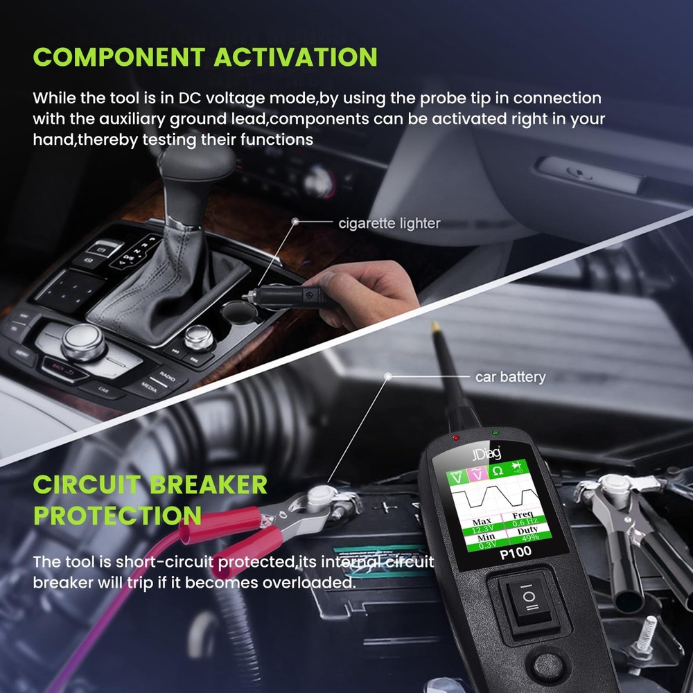 P100 is a device used to measure the health of a car battery. This probe is commonly used by mechanics or car enthusiasts to check the voltage and amperage of a car battery to determine if it is holding a charge and providing enough power to start the engine. P100 Power Circuit Probe Tester: P100 circuit tester is one of the most versatile automotive electrical tools available on the market. It is designed to test various aspects of your vehicle's electrical system, including AC/DC voltage, resistance, continuity, polarity, and connections. With this probe tester, vehicle owners can easily diagnose electrical issues on their own without the need for professional assistance. Circuit Breaker & Safety Design: Our probe tester is equipped with a built-in circuit breaker for added safety. This feature ensures that the automotive circuit tester is protected against short circuits and overloads. If the tester detects an overload, the circuit breaker will trip to protect not only the tool but also the user. Components Activation Function: This electrical circuit tester also comes with components activation function. It can be used to test various components, such as continuity, ground connection, short circuits, and polarity detection. Before testing any circuit or component, it is recommended to perform a quick self-test to ensure the tester is functioning properly. 20ft Extension Cable: Our power circuit tester comes with a durable and safe 20ft extension cable. This allows you to freely move around the vehicle while performing tests. Additionally, the extension cable ensures less deviation and provides more accurate testing data, giving you a better understanding of your vehicle's condition. Wide Application: Our P100 power circuit probe test kit has a wide range of applications. It can be used as a car fuse tester, power tester, breaker finder, short finder, and automotive multimeter, among others. It also offers professional diagnostic capabilities and supports multiple languages, making it suitable for various vehicles and user requirements.