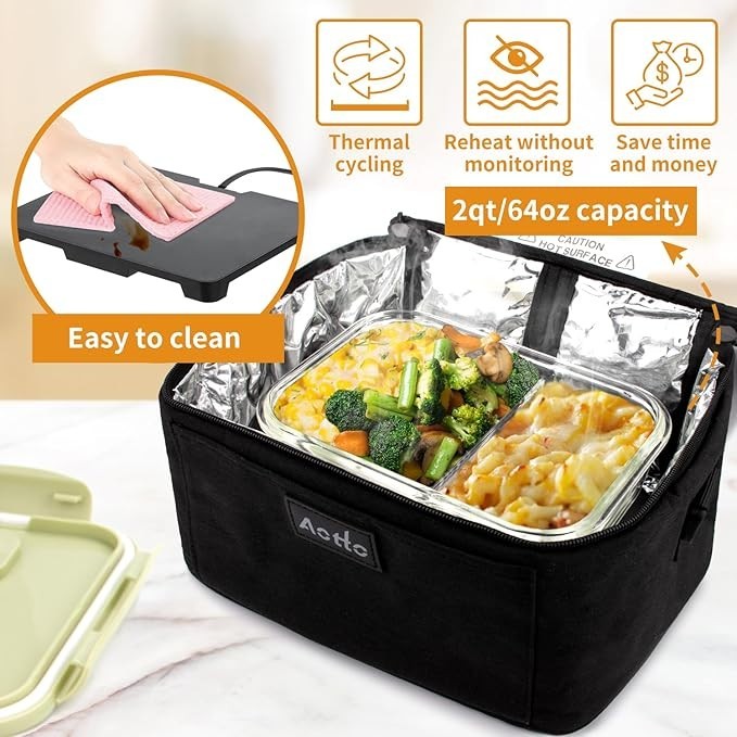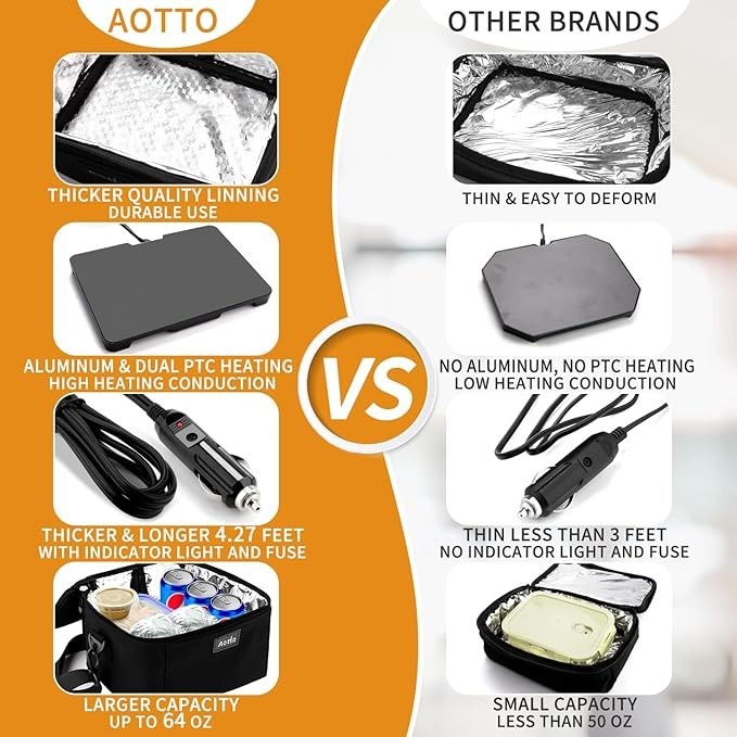 ✅ 12/24V CAR FOOD WARMER (W/VEHICLE PLUG): Easy to enjoy hot and healthy food on the road. Aotto food warmer for car is ideal for reheating or cooking healthy dishes while driving, whether you are a trucker driver, delivery person, or traveler and more. You can use it on any vehicle with a 12 volt or 24 volt lighter port like a car, truck etc ✅ PERFECTLY REHEATED FOOD: No need to keep checking on the food. The automatic temperature control will heat and cook leftovers, prepackaged, fresh, or refrigerated meals evenly and without drying out. A car microwave can hold the temperature for hours without producing a bad odor, and retain the moisture and flavor of the food ✅ STRESS-FREE COOKING: Just put a meal in the portable oven, plug it in your car with a 12V lighter port or truck with a 24V lighter port, go about your daily work or play, and enjoy your meal when you are ready for it, whether an hour or hours later, your food will be reheated or cooked to be moist and juicy ✅ NO COMPATIBILITY WORRIES: This car lunch box warmer is compatible with various flat bottom and heatable containers like Glass, Plastic, Aluminum Foil, Stainless Steel, Cardboard and more. The large capacity portable food warmer for car can accommodate containers size up to 9.76" L x 7.01" W x 3.94" H ✅ PORTABLE AND CONVENIENT: Designed with a carrying handle and an adjustable & detachable shoulder strap, foldable soft sides for easy storage. A portable travel microwave for car that you can put in your backpack and carry it to any place. No more waiting in line or eating cold food. Easy to make your meals without screwing up ✅ PREMIUM COMPONENTS: Heating pad with a power cord for vehicle use (car plug for 12V & 24V use), insulated carry bag and shoulder strap