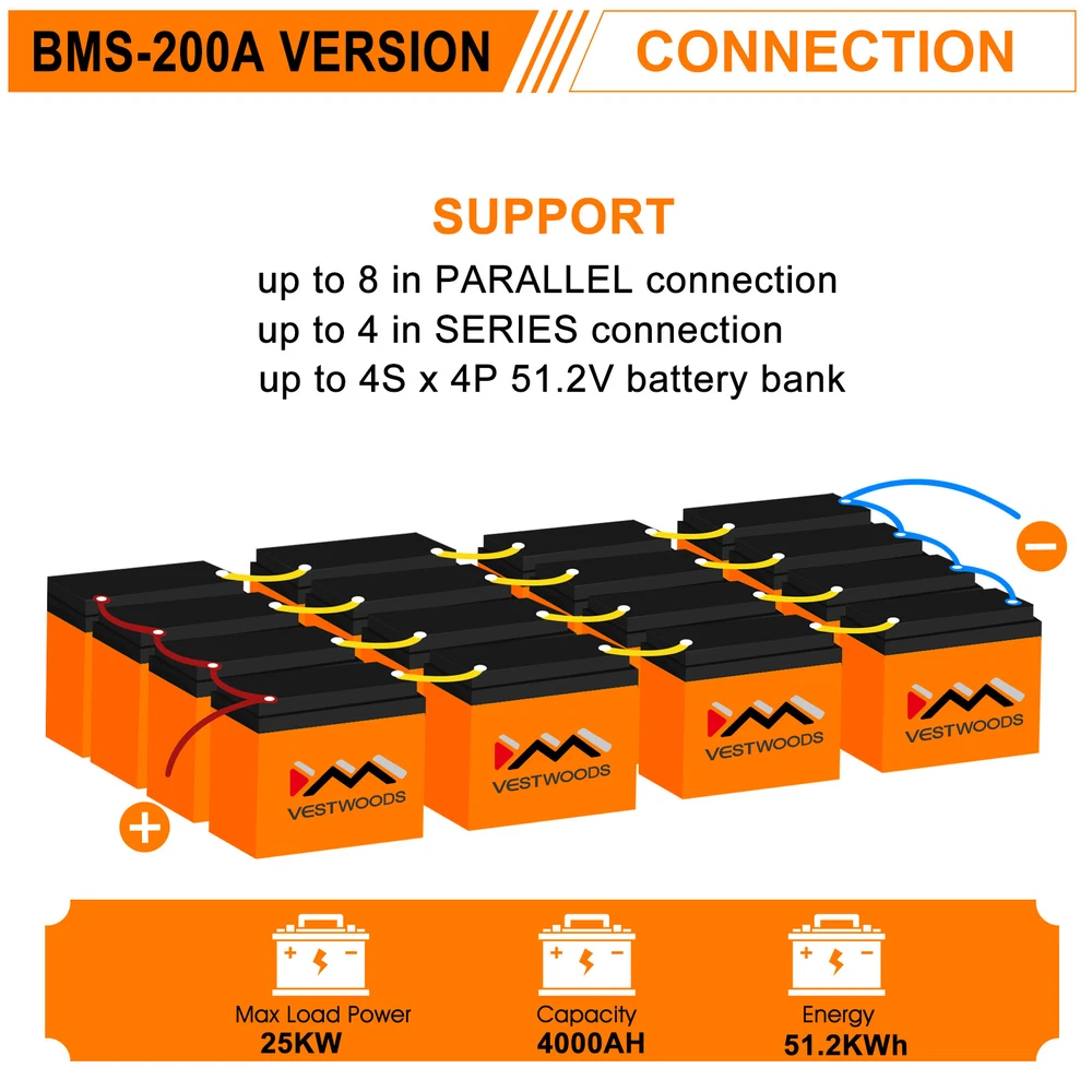 Description: [Real-time Monitoring] VESTWOODS lithium iron battery improves real-time monitoring function and obtains various data (SOC) of the lithium iron phosphate battery. Support connecting the battery through the mobile phone APP, and showing the battery voltage, current, capacity and the other information at any time. Service life increase more than 45% and failure reduced 50% with 4Pcs 3.2V 250Ah cells [Energy Storage & Save Money Solutions] VESTWOODS 12.8V 250AH batteries support up to 4 pcs in series and 8 pcs in parallel, you could get 12.8kWh and 25.6kWh. Max connected in 16 batteries (4S4P) to get 51.2kWh. Support simple connection compared with others mesh connection on 4S4P, will save $100 and half of wires usage [Intelligent Protection & Fast charge design] VESTWOODS 12.8V 240Ah LiFePO4 battery has self-developed 200A BMS, Max load power up to 25kW, prevent damage to your battery. Built-in low-temp cut off prevents overcharging, only Interior cell is 32F/0C will be charged cut off by own. Support 1280w fast charge, 2 hours full charged [Friendly Energy & Effective Integrated] VESTWOODS 12.8V 250Ah LiFePO4 battery has provides max.4500+ cycles times and 3200Wh energy, which means our 100Ah battery produces 14400kWh (3200Wh*4500 cycles times=14400kWh) @100% DOD, as well as that you can save more than a half of electricity fees compared to using commercial power. 12V 250Ah LiFePO4 battery covered stainless steel bracket via laser welding and metal support column, make inside of the battery is kept orderly, reliable and sturdy [Delivery & Customer Service] The VESTWOODS LiFePO4 batteries will be shipped from our US Local warehouse in Los Angeles, CA. SHIPPING TIME: 3-7 WORKING DAYS. 12-24 hours online help solve problems. Your VESTWOODS warranty is valid if purchased within 5 years or 2500 cycles Specification: Nominal Capacity:250Ah Charging Voltage(DC): 14.4-14.6V Nominal Voltage: 12.8 V Cycle Life: 2500-4500 Cycles Maximum Continuous Charging Current:200A Maximum Charging Power: 2900W Charging Temperature: 32-140°F/ 0-60°C Maximum Continuous Discharging Current:200A Maximum Discharging Power:2560W Discharging Voltage(DC): 10.8-14.2V Discharging Temperature:-4-140°F/ -20-60°C Min.Wire Gauge: 2/0AWG Connection Method:Support up to 4S/8P/4S4P Dimensions: L20.9 * W10.9 * H8.9 inch Return Service YOUR VESTWOODS WARRANTY IS VALID IF PURCHASED WITHIN 5 YEARS OR 2500 CYCLES BASED IN Denver Colorado, USA If you are not happy with your purchase, we will accept a return of a unused product within 30 days. Once we receive the returned item Vestwoods will then give an refund. 1. 10% restocking fee will be charged for refund. 2. Shipping fees are non-refundable. 3. Return shipping label will be paid for by the buyer. 4. 30-day return policy only. Please allow 1-2 weeks for your return to be processed. Discounted items are not eligible for a return. Vestwoods will not issue refunds for products purchased through other entities, such as distributors or retail partners. Returned items must be delivered to us unused, in original packaging and in the condition they were received or may not be eligible for refund or be subject to a restocking fee. We cannot be held responsible for items damaged or lost in return shipment, therefore we recommend an insured and trackable mail service. We are unable to issue a refund without actual receipt of the item(s) or proof of received return delivery. We aim to accept all returns. In the unlikely event that an item is returned to us in an unsuitable condition, we may have to send it back to you. All goods will be inspected on return.