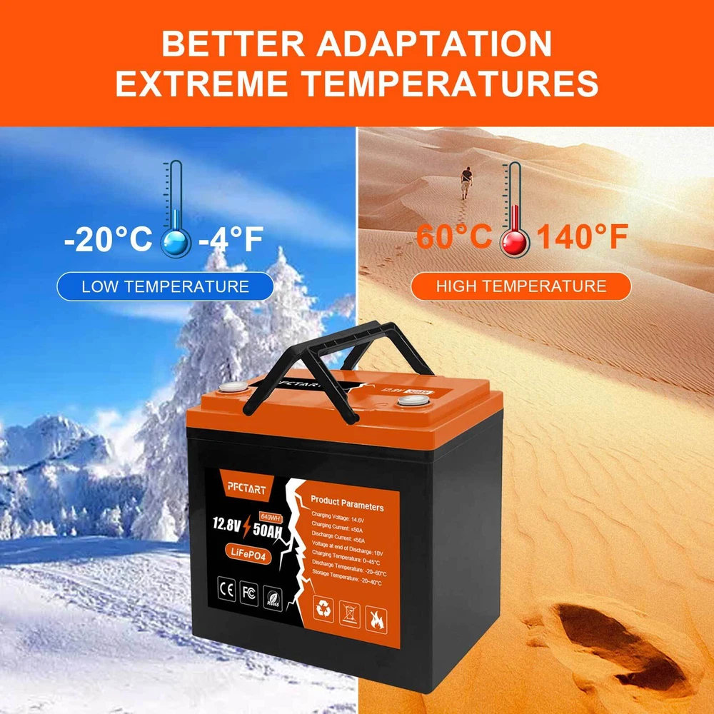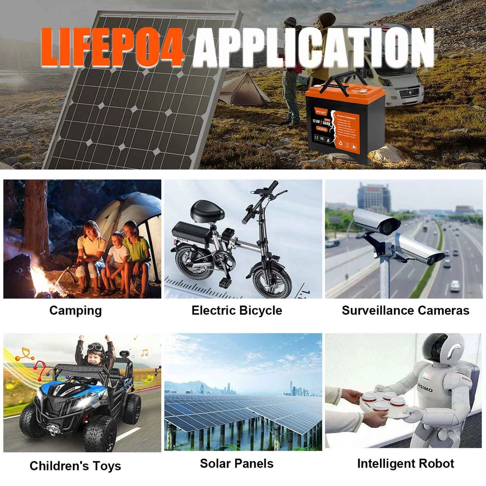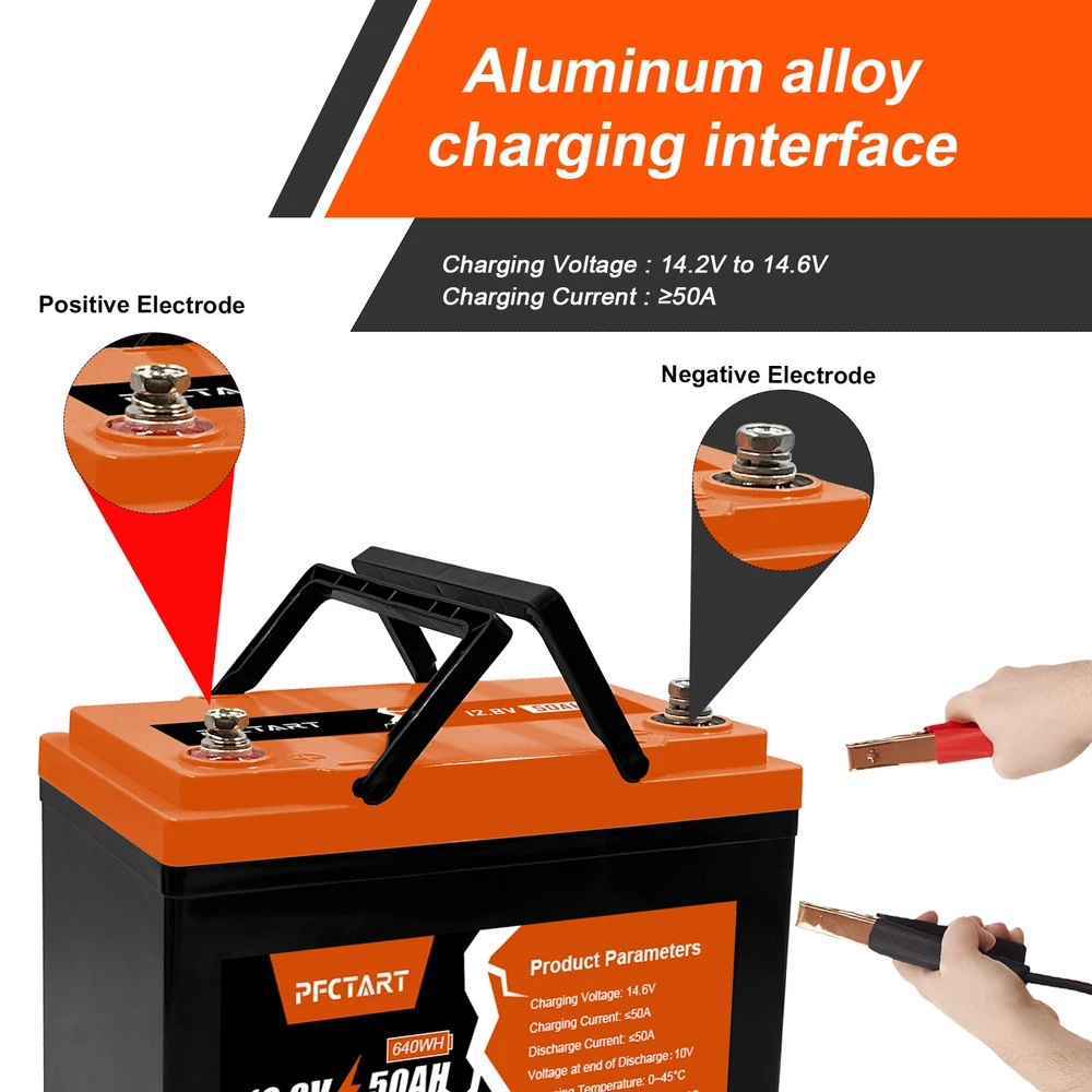 Specifications: Nominal Capacity: 50Ah Usable Capacity: 50Ah Terminal Size: M6 Nominal Voltage: 12.8V Energy: 640Wh Charge Method: CC / CV Charge Voltage: 14.4V±0.2V Current: 10A (0.2C Cycle Life≥4000 times Internal Impedance≤40mΩ Battery Management System (BMS) Board: 50A Max. Continuous Charge / Discharge Current: 50A Max. Discharge Current 5 Seconds: 100A Max. Continuous Load Power: 640W Battery Pack Case: Acrylonitrile Butadiene Styrene (ABS) PlasticProtection Class: IP65 Temperature Range: Charge: 0°C to 50°C / 32°F to 122°F Discharge: -20°C to 60°C / -4°F to 140°F Storage: -10°C to 50°C / 14°F to 122°F Dimension (L/W/H/TH): 198 * 166 * 170 mm / 9.02 x 5.43 x 8.19 inches Weight: Approx. 8.5kg / 18.07 lbs Note: 1.Please read the product manual before using the LiFePo4 Battery 2.Check the specifications (Voltage, capacity, dimension, weight etc) and make sure it would fit and replace your old battery with no problem before purchase 3. Please remove the caps on terminals before using Package Included: 1* 12V 50Ah Lithium Battery 2 Pairs* Terminal Screws 1* Warranty Card 1*Product Manual Please be noted: battery charger is not included.