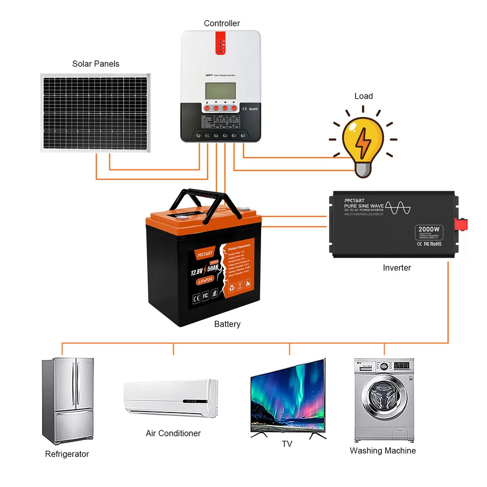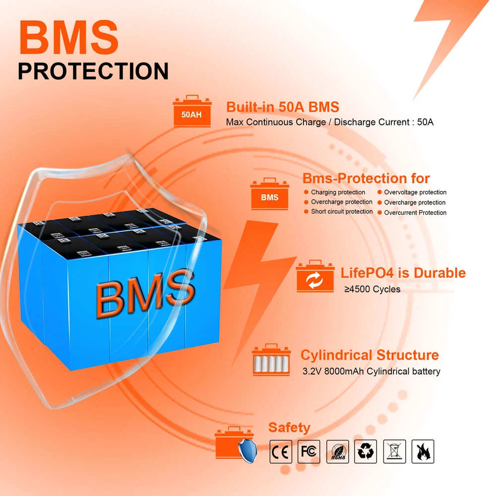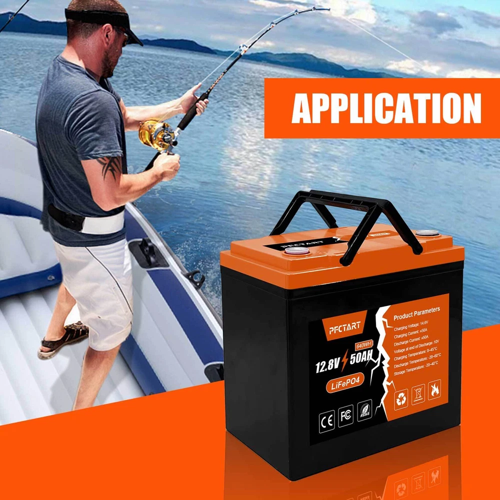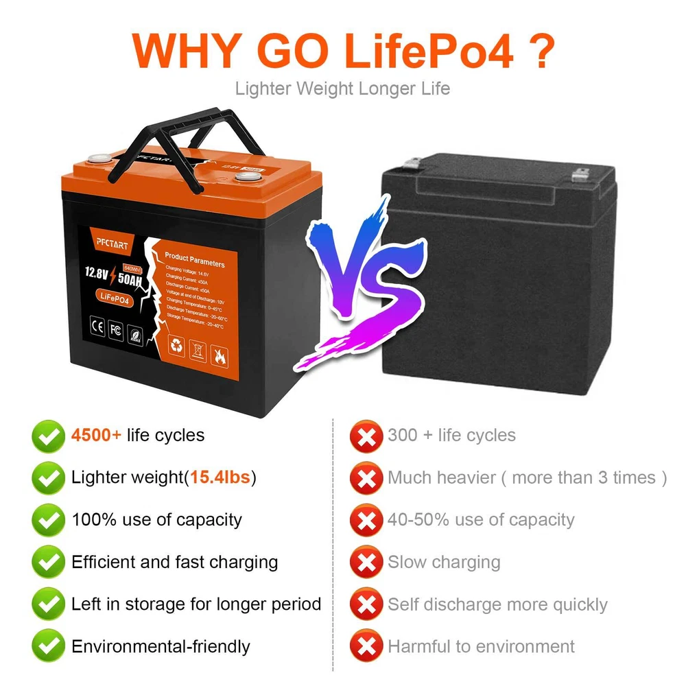 Specifications: Nominal Capacity: 50Ah Usable Capacity: 50Ah Terminal Size: M6 Nominal Voltage: 12.8V Energy: 640Wh Charge Method: CC / CV Charge Voltage: 14.4V±0.2V Current: 10A (0.2C Cycle Life≥4000 times Internal Impedance≤40mΩ Battery Management System (BMS) Board: 50A Max. Continuous Charge / Discharge Current: 50A Max. Discharge Current 5 Seconds: 100A Max. Continuous Load Power: 640W Battery Pack Case: Acrylonitrile Butadiene Styrene (ABS) PlasticProtection Class: IP65 Temperature Range: Charge: 0°C to 50°C / 32°F to 122°F Discharge: -20°C to 60°C / -4°F to 140°F Storage: -10°C to 50°C / 14°F to 122°F Dimension (L/W/H/TH): 198 * 166 * 170 mm / 9.02 x 5.43 x 8.19 inches Weight: Approx. 8.5kg / 18.07 lbs Note: 1.Please read the product manual before using the LiFePo4 Battery 2.Check the specifications (Voltage, capacity, dimension, weight etc) and make sure it would fit and replace your old battery with no problem before purchase 3. Please remove the caps on terminals before using Package Included: 1* 12V 50Ah Lithium Battery 2 Pairs* Terminal Screws 1* Warranty Card 1*Product Manual Please be noted: battery charger is not included.
