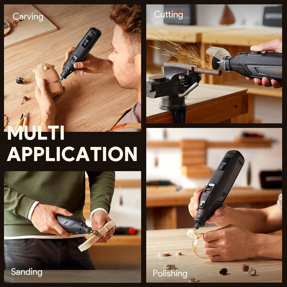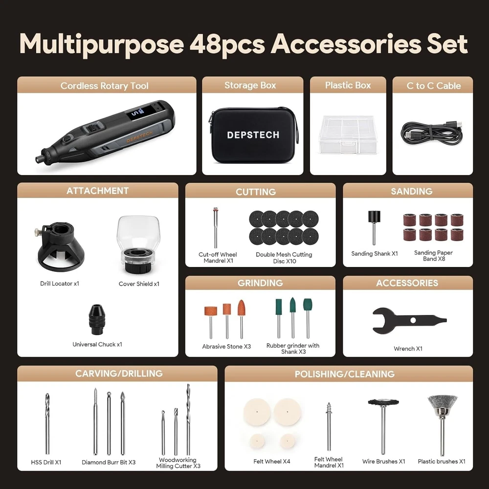 12V Cordless Rotary Tool Kit 48Pcs Accessories Digital Display Fast Charging ‹ › ‹ › ‹ › ‹ › ‹ › ‹ › ‹ › ‹ › ‹ › ‹ › 12V Cordless Rotary Tool Kit - 48Pcs Accessories Unlock the potential of your creativity with the 12V Cordless Rotary Tool Kit. This versatile tool is designed to empower your DIY projects, home repairs, and garden maintenance, making it an indispensable companion for both beginners and seasoned craftsmen alike. Key Features: 12V Powerful Motor, 5000-35000 RPM: Experience the freedom of variable speeds, handling heavy-duty tasks effortlessly compared to traditional 4V/8V grinders. Fast Charging Technology: Equipped with an 18W fast charging feature and 3 x 2.5Ah lithium-ion batteries, you’ll enjoy extended runtime and quick recharging capabilities with a USB-C charging cable. Large Display Screen: Monitor your power levels and speed with advanced digital monitoring, offering you precise control at every stage of your project. 5 Minutes Memory Function: Retain your last used settings for effortless transitions during operations, ensuring you stay in your creative flow. Ergonomic Design: Crafted with your comfort in mind, the soft rubber grip ensures reduced fatigue, allowing for longer working sessions with less noise and vibration. Multipurpose Craft Tool: Complete with 48 high-quality accessories, this tool can cut, sand, engrave, drill, and process metal with ease. The universal keyless chuck allows compatibility with most Dremel accessories. Customer-Centric Service: Enjoy a -long and specialized support, making it the perfect gift for any DIY enthusiast. Why Choose Our Cordless Rotary Tool Kit? Elevate your craftsmanship with a tool that balances power, versatility, and ease of use. Say goodbye to cumbersome cords and embrace the freedom of a cordless design. Whether you’re a hobbyist or an expert, this rotary tool will help you create, explore, and innovate without limitations. Invest in your creative journey today! Shipping Free & Fast Shipping - We offer free shipping to most of the USA with a normal delivery time of 3-7 days. However, due to the current situation, additional delivery time (up to 3 weeks) may be required for some items. Alternative Carriers - We may use alternative carriers (e.g. USPS, FedEx, UPS, etc.) to ensure your package arrives safely and on time. Due to the use of multiple carriers, we are unable to provide a tracking number automatically. Handling Time - Orders are processed and shipped within 1-2 business days of receiving cleared payment. Shipping Restrictions - Shipping to Alaska, Hawaii, Puerto Rico, Guam, and other US territories may incur shipping charges or delivery restrictions. Please contact us before ordering, or your order can be refunded/cancelled. State Restrictions - There may be restrictions based on your state of purchase. For example, certain items may not be shipped to California due to state regulations. Contact for Tracking Updates - If you require tracking updates or have any concerns about the delivery of your order, please feel free to contact us, and we will be happy to assist you. Return 30-Day Hassle-Free Returns - We want you to be completely satisfied with your purchase. If you are not, you can return the item within 30 days of receiving it for a full refund or exchange. Easy Return Process - To start a return, simply contact us and we will provide you with a prepaid return shipping label and detailed instructions. Restocking Fee - There are no restocking fees for returns. However, the buyer is responsible for return shipping costs if the return is not due to a seller's error. Refund Processing Time - Refunds will be processed within 5 business days of receiving the returned item in its condition. Payment We accept all major credit cards, PayPal, and Apple Pay for your convenience. Your payment information is secure and encrypted to ensure a safe and seamless transaction. Please complete your payment within 3 days of purchase to avoid any delays in shipping. Feedback Your feedback is extremely important to us. We strive to provide the best products and customer service possible. If you are satisfied with your purchase, please take a moment to leave us a positive review. If you have any concerns or issues with your order, please contact us before leaving negative feedback. We are committed to resolving any problems and ensuring your satisfaction. Contact Us If you have any questions or concerns, please feel free to out to our customer support team. You can contact us through the eBay messaging system. We are available Monday to Friday, 9:00 am to 5:00 pm EST, and we will do our best to respond to your inquiry within 24 hours. Buy it now and enjoy a pleasant shopping experience! Item Height: 5.4 Centimeters Item Diameter: 9.35 x 1.93 x 2.13 inches Item Weight: 1.37 pounds Unit Quantity: 1 Features: Variable Speed,Large Display Screen,12V Powerful Motor,3 x 2.5Ah Battery,Supports Fast Charging,5 Variable Speed Settings,5000 to 35000 RPM,Ergonomic Design,Low Noise Operation,Compatible with Dremel Accessories,Universal Keyless Chuck,Multi-purpose Tool Battery Included: Cordless Rotary Tool Voltage: 12 V Power Source: Battery Number of Pieces: 48 Number of Batteries: 1 Lithium Ion Batteries Required. (included) Type: Cordless Rotary Tool Chuck Type: Keyless Chuck Size: 1/4 in Battery Technology: Lithium-Ion (Li-Ion) Color: Black Motor Type: Brushed Maximum Speed: 35000 RPM Minimum Speed: 5000 RPM Unit Type: lb