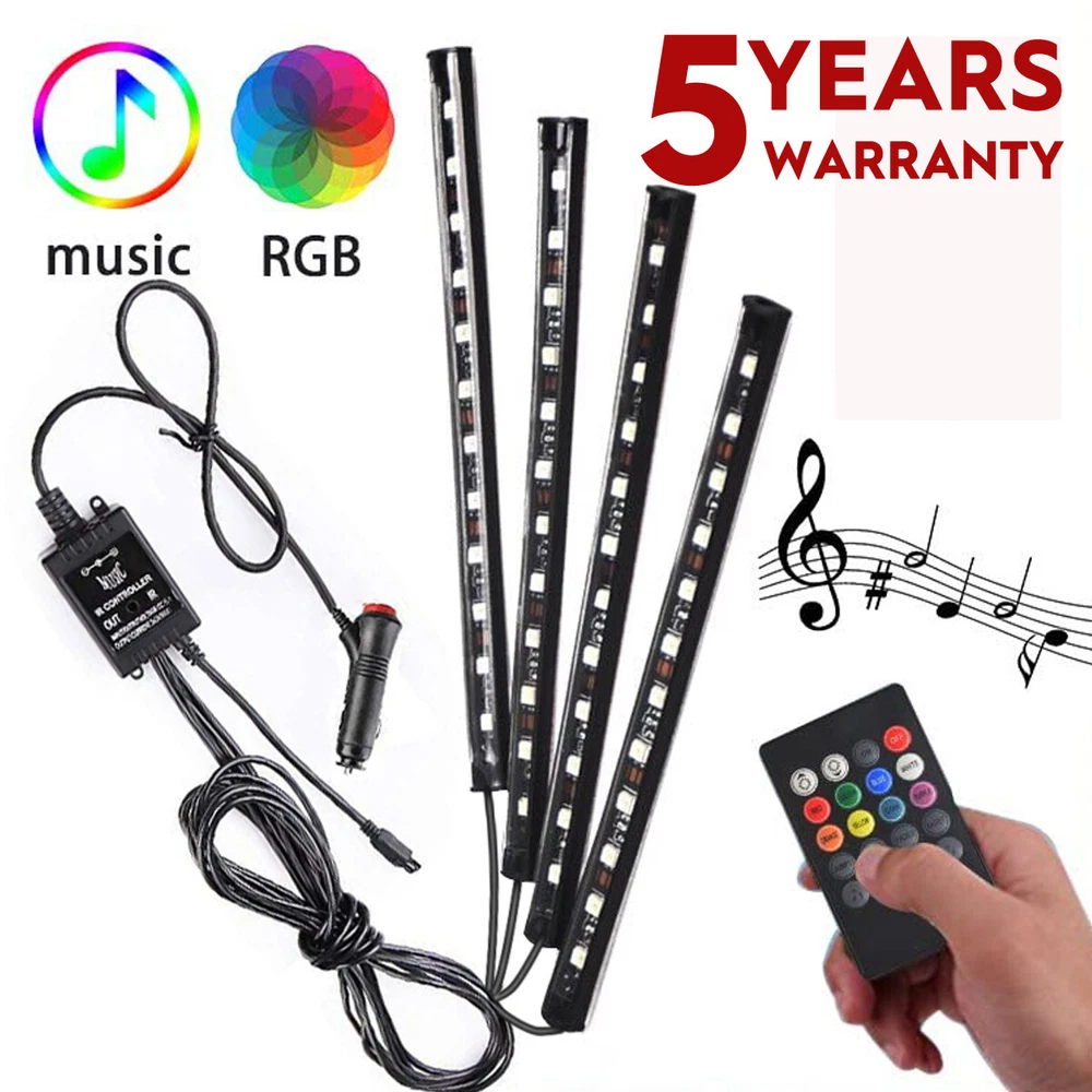 Product Description: Decorative your car by this RGB LED Strip Lights, changing the atmosphere with different color and lighting mode. Enjoy a beautiful, exotic and romantic atmosphere tonight. Product Features:Music Control LED Strip Lights 100% Brand new and high quality. Music Sync : Syncs with music rhythms, adding dynamism and vitality to your car's interior Romantic Atmosphere : Easily change the ambiance with exquisite LED decoration for romantic nights. Product Specifications: LED Type: 5050 SMD, ensuring high quality1. LED Quantity: 48 pcs (4 tubes, 12 LEDs per tube)1. Compatible Vehicles: All cars with DC 12V power supply1. Smart Control: Wireless Remote: Adjust 8 basic colors, brightness, speed, and patterns with ease. Plug-and-Play: Built-in switch on the cigarette lighter socket, no wiring modifications needed Installation & Usage: Easy Installation: Double-sided adhesive tape for quick setup on the car's interior floor or dashboard1. Versatile Applications: Suitable for car decoration, homes, bars, and other venues Note: The Total 16 colors includes 8 bright cyan/red/green/blue/white/orange/yellow/purple colors and 8 deeply cyan/red/green/blue/white/orange/yellow/purple colors. Easy to Install No need to modify the wiring, simply peel off the double-sided tape behind each strip and apply them under the seats or in the footwell area. A built-in switch on the cigarette lighter socket, easy to turn it on/off, no need plug and pull frequently. Specification Device Type: RGB Car Decorative Light Strip Strip Light Quantity: 4pcs LED Type: 5050SMD LED Quantity: 12pcs for one strip light Strip Light Size: 8.66" L x 0.55" W x 0.2" H (222 x 14 x 6 mm) Applicable: With cigarette lighter head, no need to modify the circuit. Material: PVC Voltage: DC 12V Power: 6W Power Cable Length: 2 cables: 6.3ft (1.92m), Other 2 cables: 4.6ft (1.42m) Weight: 7.83 oz (222g) Colo r: white/red/blue/green/ice blue/orange/yellow/pink purple Package Includes 4* Music Control LED Atmosphere strip light 1* Remote Controler 1* USB