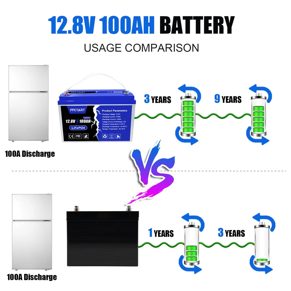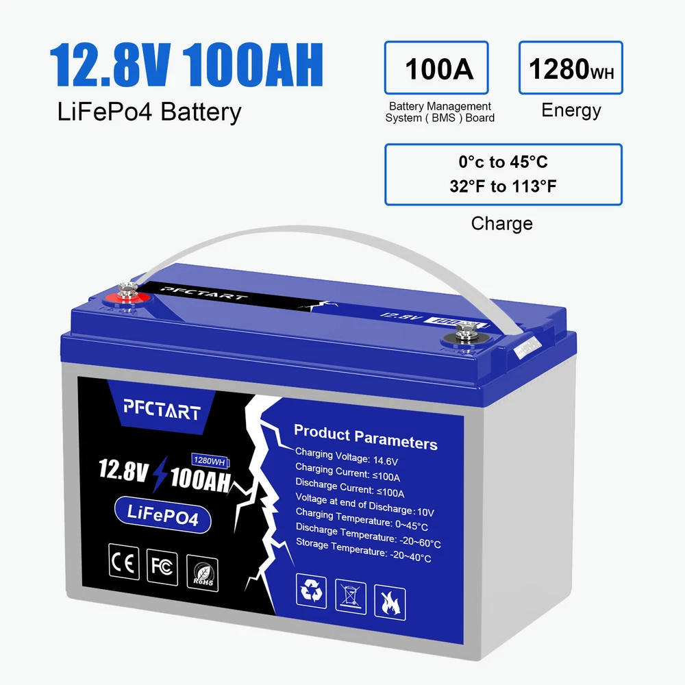 Features: BORN FOR RV LIFE An Affordable 12V 100Ah Deep Cycle LiFePO4 Battery.Your optimal & adequate LiFePO4 Battery for Camper Van, Travel Trailer, Caravan, Hauler, Motor Home, etc. 1/2 LIGHT WEIGHT IN 14.2KG Easily Pick up and go! Weighs 11.6kg, 1/2 lighter than 12V 100Ah lead-acid battery in 25kg.Effortlessly Install the 12V 100Ah LiFePO4 battery in your RVs, no any burden to you and your RVs. 1280Wh ENERGY STORAGE Provides100% 1.28kWh energy, a 2X increase in power output efficiency over lead-acid batteries (approx. 50% usable capacity in a 12V100Ah AGM SLA Lead-acid battery at 1C discharging rate).Timeusb LiFePO4 battery delivers the ideal result on stronger energy storage that users of RVs expected. 100% SAFE WITH SUPERIOR BMS 100A Battery Management System (BMS), protects the battery from safety hazards by providing five types of protection: overcharging, overdischarging, overcurrent, short circuit, and high-temperature environment above 60°C/140°F. It’s a 100% green energy that is free of heavy metals and rare metals, non-toxic, and non-polluting. EFFICIENT DELIEVERY & 24Hrs SERVICE PFCTART provides customers with a responsive and professional customer service team that provides targeted battery solutions within 24 hours of question receipt.Given Timeusbahighly effective after-sales and delivery team, our customers in the United States can receive PFCTART products within 2-7 working days. ATTENTION It is an energy storage battery rather than a start-up battery, and it CAN NOT be used for any kind of golf carts, trolling motor or starting. Package Included : 1 * 12V 100Ah LiFePO4 Battery Pack Please be noted : battery charger is not included. Specifications: Battery type: LIFEPO4 MODEL: 100Ah 12.8V(4S1P) Rated capacity: 100Ah(1280WH) Normal voltage: 12.8V Discharge termination voltage: 10.0V Charging voltage: 14.6V Internal resistance: ≤180mΩ Single cell: IFR 3.2V 100Ah Standard charging. Continuous current: 0.2C5A Continuous voltage: 14.6V Cut-off current: 0.01 C Standard discharge: Constant current 0.2C5A end voltage 10.0V Max. charging continuous current: 100A Maximum discharge continuous current: 100A Operating temperature range. Charge: 0~45℃ Discharge: -20~70℃ Product size: 329*171*235mm Weight : 11.6kg BMS protection: Cell overcharge detection voltage:3.90V±50mV Cell overcharge recovery voltage:3.80V±100mV Cell over-discharge detection voltage:2.00V±100mV Cell over-discharge recovery voltage:2.30V±100mV Rated operational charge current:100A Over current detection:150±30A PCM impedance:≤50mΩ Please note : BMS it supports a maximum of 48V series or 4 batteries of the same voltage and the same capacity in parallel installation, please fully charge the batteries before series/parallel installation to ensure that each battery is at the same voltage and the same capacity.