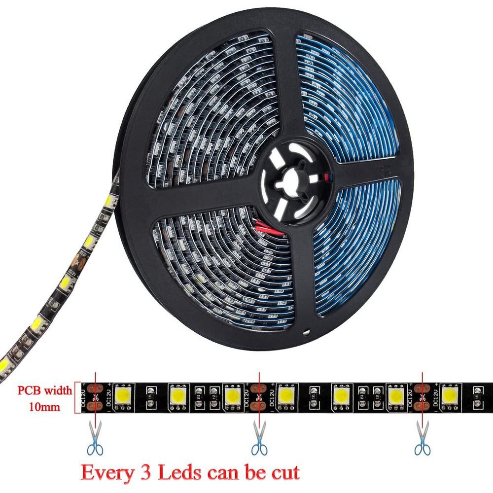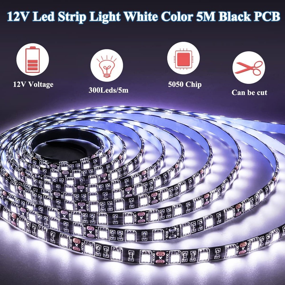 Wonderful holiday party decoration and lighting: This 12V white led light strip has the characteristics of waterproof, flexible and strong adhesion, it is a good choice for home lighting, bedroom lighting, kitchen lighting decoration, and various commercial lighting and decoration. Pick it up to show your DIY creativity. Speciations: Color: White Color tempreture: 6000-6500K LED Type: 5050 SMD Black PCB board Length: 5m/16.4ft LED Quantity: 300 pcs Weight: 0.2kg Operating Voltage: DC 12V Waterproof Rating: IP65 Long life span: 50,000+ hours Working power: 60W/16.4ft Working Temperature: -20 to 50℃ Luminous Flux: 4000-4500 Lumens/16.4ft Size: 500CM(16.4ft)x 1.0CM x 0.30CM(L*W*T) Recommended power supply: 12V 5A (not include) Tips: ① Keep the connections and end tail side indoors or in waterproof boxes when using outdoors. ② The LED light bars need to be unfolded during work to better dissipate the heat, otherwise the temperature of the light bar will rise sharply in a short time. ③ After the LED beads with the same color temperature are sprinkled with waterproof silica , the silica will have the effect of astigmatism. The color temperature of the waterproof version looks higher than that of the non- waterproof version to the naked eye. Package include: 1 x 16.4ft White 5050 300LEDs Waterproof light (not include the power adapter and dimmer). [Transparent & Safe]: This white lights includes 300 LEDs 5050 SMD, black PCB board, it is more transparent and brighter than ordinary lights. This led tape lights works with 12 V direct current, which is safe for adults and children [Cuttable, Dimmable]: Every 3 LEDs can be cut and spliced, you can DIY into any special residential decoration or design unique commercial logo. This 12 V led light strip can also be dimmable, you can connect a dimmer to control the brightness (not include) [Flexible, Waterproof & Sticky]: This led light is very flexible, it can be bent into the shape you want and adapt to various corners. The back is a strong sticky glue, the installation is stable and not easy to fall. The outer layer of the led rope light is wrapped in silicone, IP 65 waterproof, suitable for indoor and outdoor use. It meets your needs for home decoration or any commercial use [Versatile Use]: This 16.4 ft white waterproof flexible light is suitable for kitchen lighting, bedroom, mirror, dresser, living room, TV, hallway, stairs, bookcase, kitchen, bar, workbench lighting to illuminate and decorate and almost anywhere [Note]: The package contains a 16.4 ft roll of of white light strip. (Not include the power supply and dimmer). You need to buy 12 V 5 A power adapter or a current of more than 5A separately for this to work