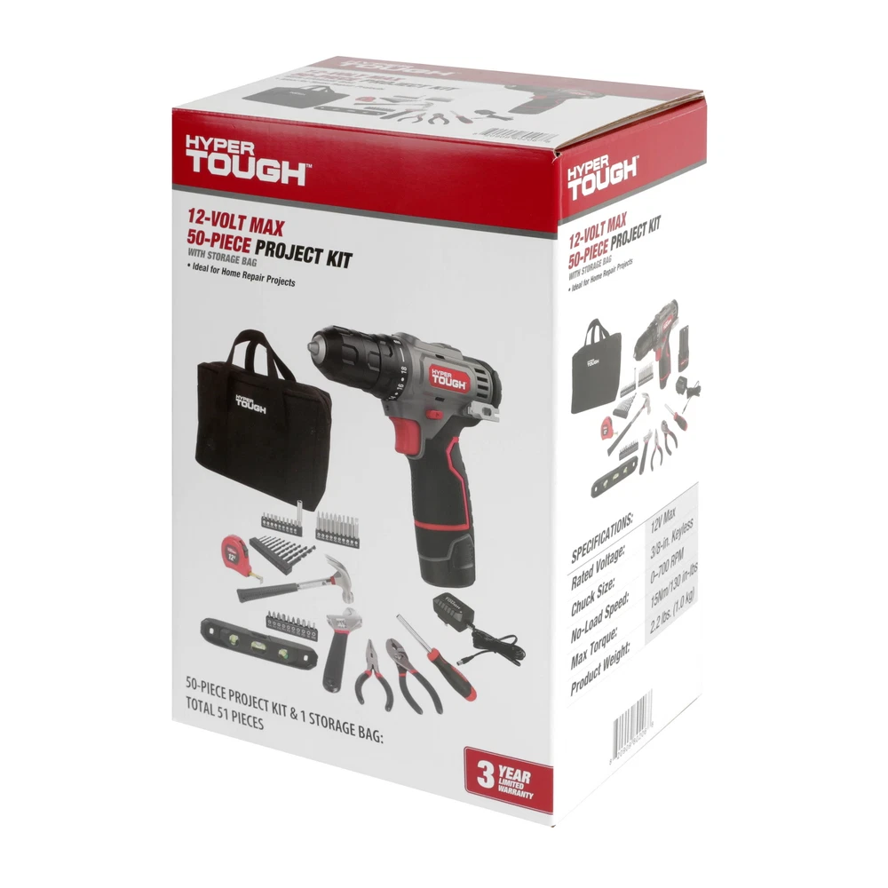 Tackle home repair projects with ease using the new Hyper Tough 12V Max Cordless 3/8-inch Drill Driver 50-Piece Project Kit. This versatile drill driver features a 3/8-inch keyless chuck and delivers a maximum torque of 130 in-lbs, making it perfect for various tasks. The variable speed trigger allows for precise control, with a no-load speed of 0-700 RPM. An integrated LED work light illuminates dim areas, while the magnet on top provides quick drill bit storage. The project kit includes a variety of tools and accessories to help you get the job done right. You'll find a 9-inch magnetic torpedo level, long nose pliers, a claw hammer, an adjustable wrench, and more. The kit also comes with a 12V lithium-ion battery, a charger, and a convenient storage bag for easy portability. With the belt clip, you can keep the drill at your side during projects. Hyper Tough 12V Max Cordless 3/8-inch Drill Driver 50-Piece Project Kit with 1.5Ah Lithium-Ion Battery, Charger, and Storage Bag Ideal for home repair projects LED Work Light for Dim or Dark Areas Variable Speed Trigger 3/8-inch Keyless Chuck No load speed of 0-700 RPM Belt Clip Magnet on Top of Drill for Quick Drill Bit Storage Max Torque: 130-inch lbs./15 nm 1 - 9-inch Magnetic Torpedo Level(3 vials) 1 - 6-inch Long Nose 10 - 2-inch Bits 10 - HSS Drill Bits 1 - Magnetic Bit Driver 1 - 8OZ Claw Hammer 1 - 12 Volt Li-Ion Battery Charger 1 - Magnetic Bit Holder 1 - 1.5Ah 12 Volt Lithium-Ion Battery 19 - 1-inch Bits 1 - 12ft. 5/8-in. Tape Measure 1 - 6-inch Slip Joint Pliers 1 - 6-inch Adjustable Wrench 1 - Storage Bag New