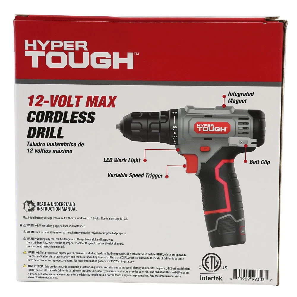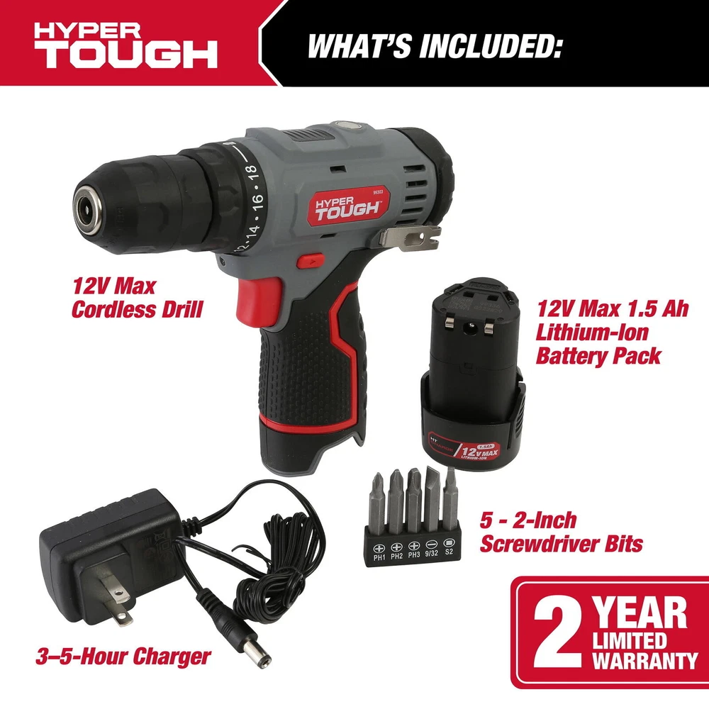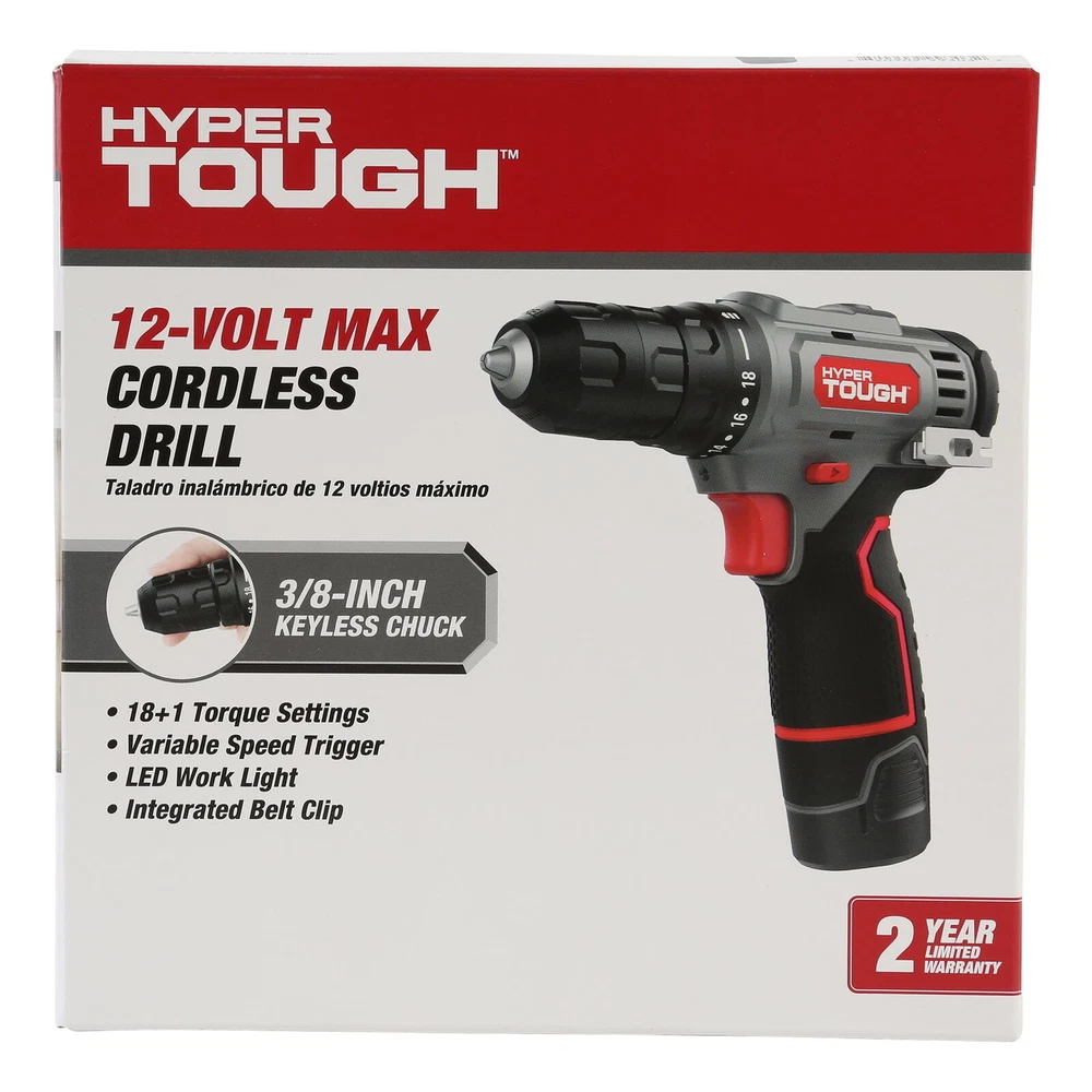 ### Hyper Tough 12-Volt Max Lithium-Ion Drill Driver **Description:** The Hyper Tough 12-Volt Max Lithium-Ion Drill Driver is a powerful and compact tool designed for efficiency in various drilling and fastening tasks. With its lightweight build and versatile features, it’s ideal for homeowners and DIY enthusiasts tackling home repairs and projects. **Key Features:** - **Compact Size:** Measures only 7.37 inches in length and weighs less than 2 pounds, making it perfect for tight spaces and overhead work. - **Powerful Performance:** Delivers 130-inch lbs. of torque and a no-load speed of up to 700 RPM for effective drilling and driving. - **Variable Speed Trigger:** Provides precise control over speed for different materials and applications. - **3/8-Inch Keyless Chuck:** Enables quick and easy bit changes without the need for additional tools. - **LED Work Light:** Illuminates work areas in dim or dark conditions for better visibility. - **Battery Life Indicator:** Helps monitor the battery status to avoid interruptions during work. - **Magnet for Bit Storage:** Conveniently holds bits or fasteners on top of the drill for easy access. - **Belt Clip:** Allows for convenient carrying and accessibility while working. - **Included Accessories:** Comes with a 1.5Ah 12-Volt Li-Ion battery, charger, and 5 screwdriver bits (#1 PH, #2 PH, #3 PH, 9/32, 7mm slotted, #2 Square). **Specifications:** - **Model:** 99303 - **Battery:** 12 Volt Li-Ion, 1.5Ah - **Torque:** 130-inch lbs. / 15 nm - **Speed:** 0-700 RPM - **Chuck Size:** 3/8-inch keyless - **Additional Features:** 18+1 torque settings, compatible with Hyper Tough 2.0Ah battery (sold separately), belt clip **Ideal For:** Drilling, screw driving, home repairs, outdoor repairs, DIY projects, woodworking, deck and patio maintenance, and automotive repairs. On Feb 11, 2025 at 01:45:42 PST, seller added the following information: