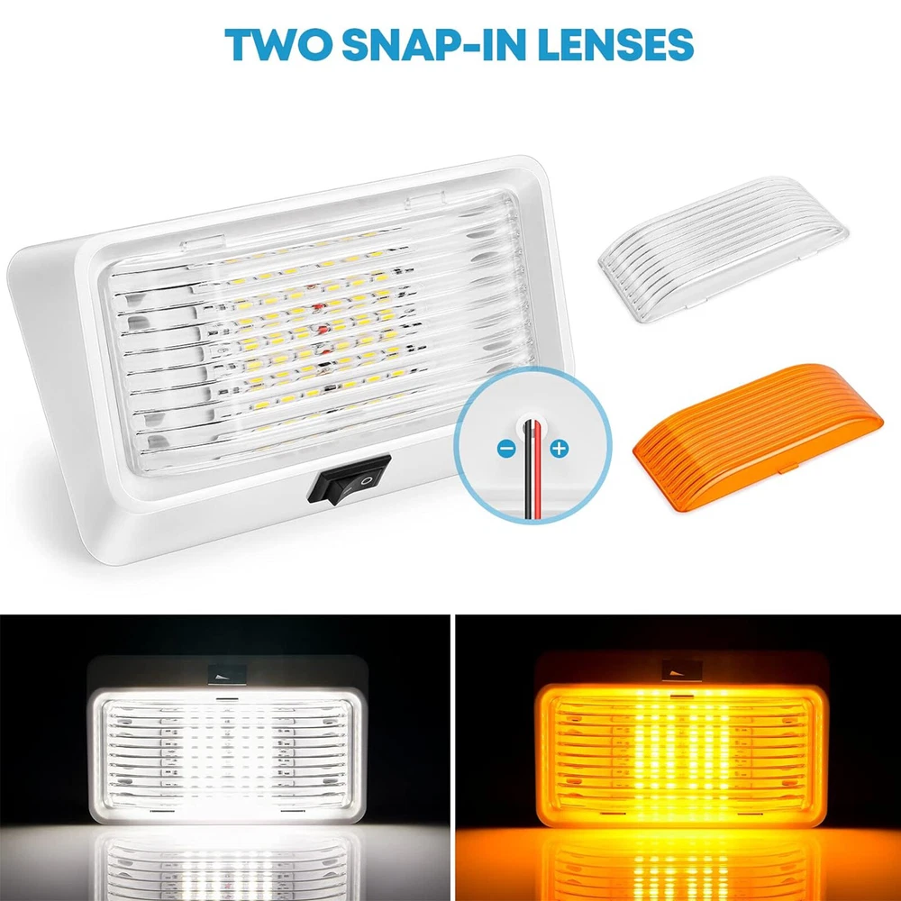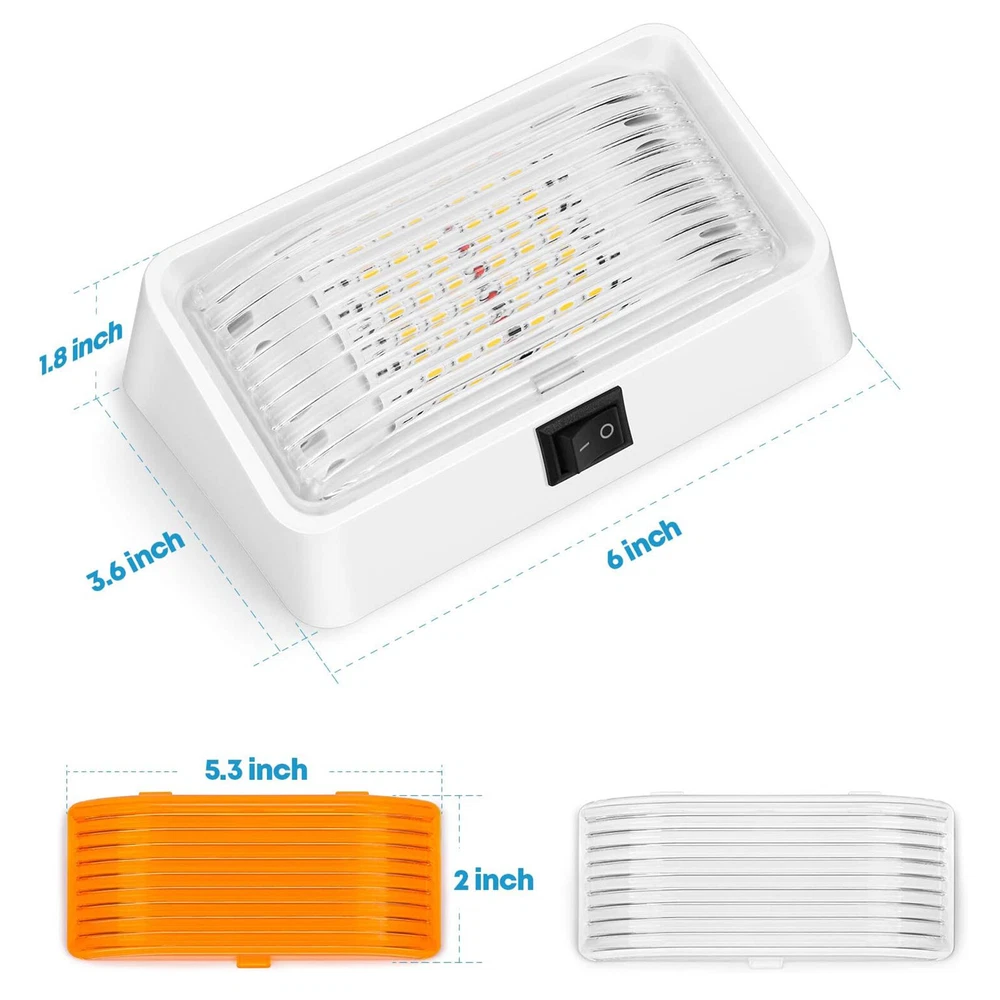 Features: 【Wide Operating voltage】 DC 11-18V, LED technology designed to withstand fluctuat working voltage and not still make it energy-saving and durable of more than 50000 lighting hours 【Easy Installation】2 wires connection: black is the ground and red positive; Interior and Exterior Compatible with 12 Volts DC recreational vehicles, great for RV camper motorhome travel trailer etc 【Waterproof IP65 & Durable Material】compared to old-typed gasket sealed design, the LED panel of this new type is completed sealed with resin and water will NOT get into the light or disrupt lighting even when you take off the lens. With all-weather molded plastic housing and durable lenses, it can prevents corrosion and last longer 【Handy ON OFF Switch & Two Lenses Options】 Equipped with convenient ON/Off switch so that you don't have to open the door, and go inside to turn on the outside light. Includes 2 snap-in replaceable lenses, clear & amber. You can choose whatever suits your situation best or the light color (white or amber) as you wish 【Specifications】 Total 24pcs High power 2835 LEDs output of 360 Lumens, 3.6W, DC 11-18V, Energy efficiency and lower power consumption Electric polarity: Black is ground and red is positive Product Description: -- Waterproof: IP65; Size: 6"(L) x 3.5"(W) -- LED type: SMD 2835, 24pcs; Light color: White 4000-4500K -- Power: 3.6Watts; Lumen: 360LM; Operating voltage: DC 11-18V -- Compact oval design for years of use and Clear snap-in replaceable lens Package includes: 1x RV LED Porch Light with switch 2 x wire nuts 4 x screws