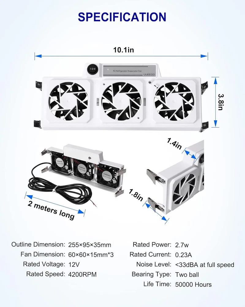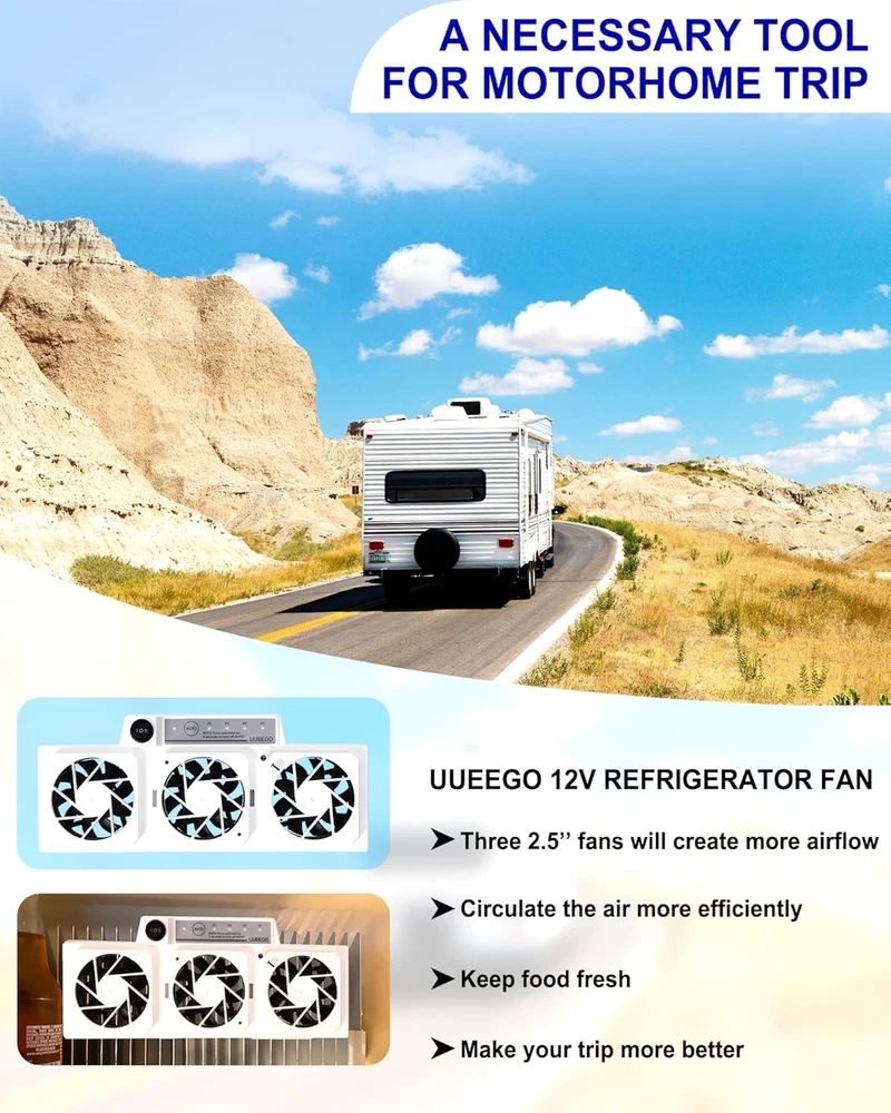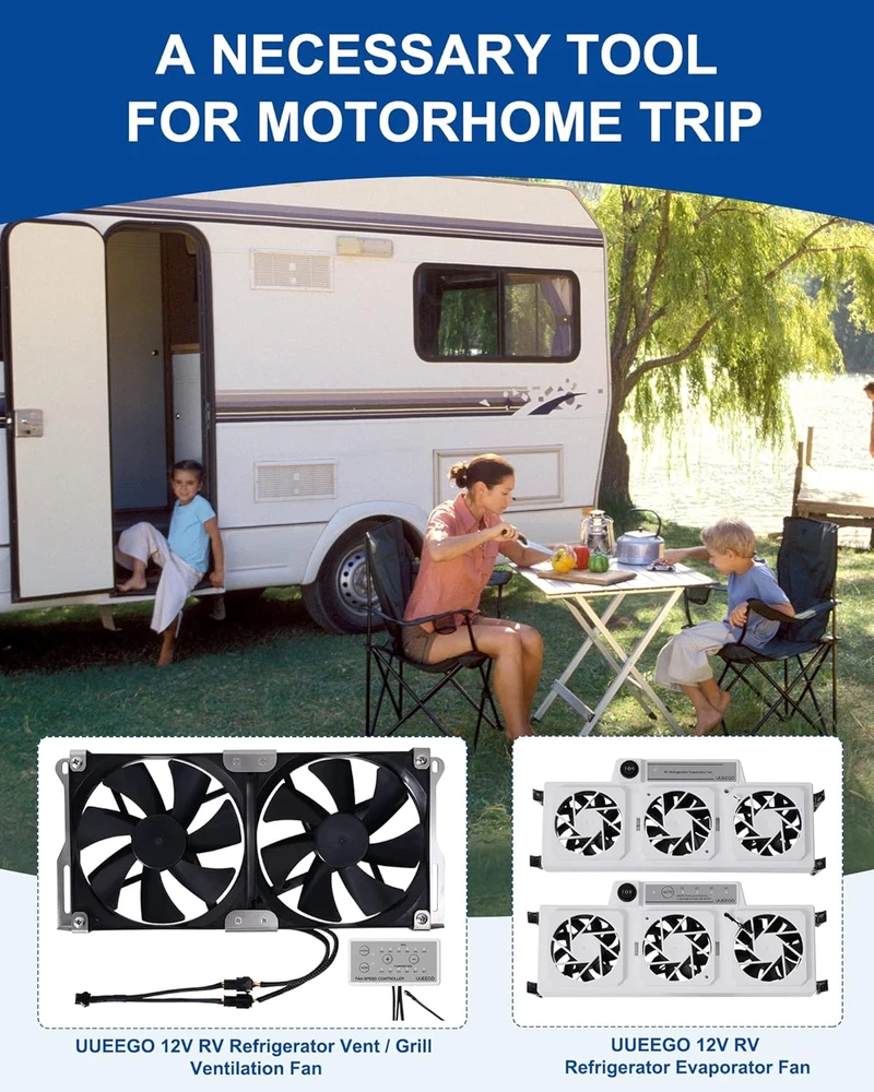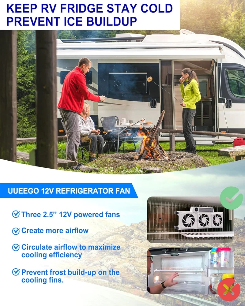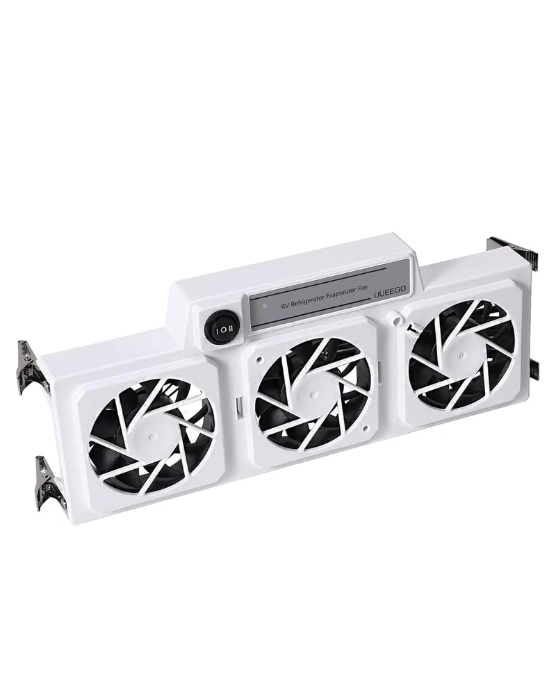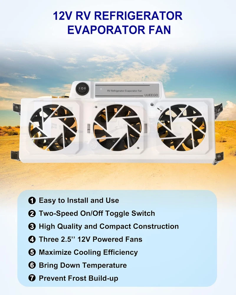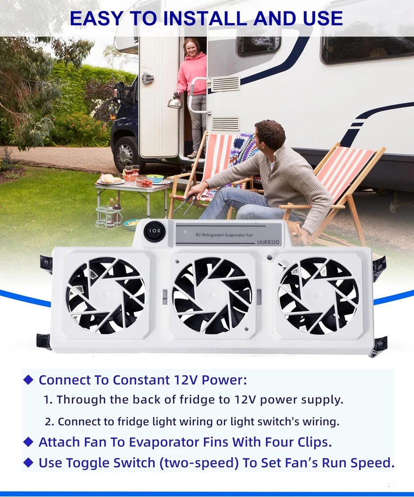 Keep Your RV Fridge Stay Cold and Prevent Ice Buildup. Uueego 12V RV refrigerator evaporator fan has three 2.5’’ 12V powered fans will create more airflow and circulate it around the fridge to maximize cooling efficiency and prevent frost build-up on the cooling fins. Easy to Install. Use the included clips to attach the RV fridge cooling fan to the evaporator fins. The fan can either be installed to the fridge light's wiring, or through the back of the fridge to the 12V power supply. Attach Directly To Evaporator Fins. Secure the camper fridge fan to the refrigerator’s cooling fins with four included built-in clips. Try to place the rv fridge fin fan to the right side of the refrigerator where the cooling typically begins. If your refrigerator has ice frost, place the fan as close as possible to the buildup area, the circulate air can help prevent the buildup. Easy to Turn On And Off. Use the two-speed on/off toggle switch on the face of the refrigerator fan to set the fan’s run speed. Press the switch to “Ⅰ” to speed up the fan, and press the switch to “Ⅱ” to slow down. High Quality and Compact Construction. Uueego camper refrigerator fans are high quality, waterproof ball bearing and are predicated to last 50,000 hours. Also the refrigerator fans for RV have a profile design and keep all wires hidden to prevent damage. Product Description A Necessary Tool For Your Trip. Place the fan to the side of the refrigerator. Place the fan as close as possible to the buildup area. Why Choose Uueego 12V RV Refrigerator Evaporator Fan? UUEEGO 12V refrigerator fan has three 2.5’’ 12V powered fans. Create more airflow. Circulate the airflow around the fridge to maximize cooling efficiency. Prevent frost build-up on the cooling fins. Highquality, waterproof ball bearing. Predicated to last 50,000 hours. Installed through the back of the fridge to the 12V power supply. Installed to the fridge light's wiring. Easy To USE Connect to the constant 12V power. Use the included clips to attach fan to the evaporator fins. Press the switch to “Ⅰ” to speed up the fan and press the switch to “Ⅱ” to slow down.