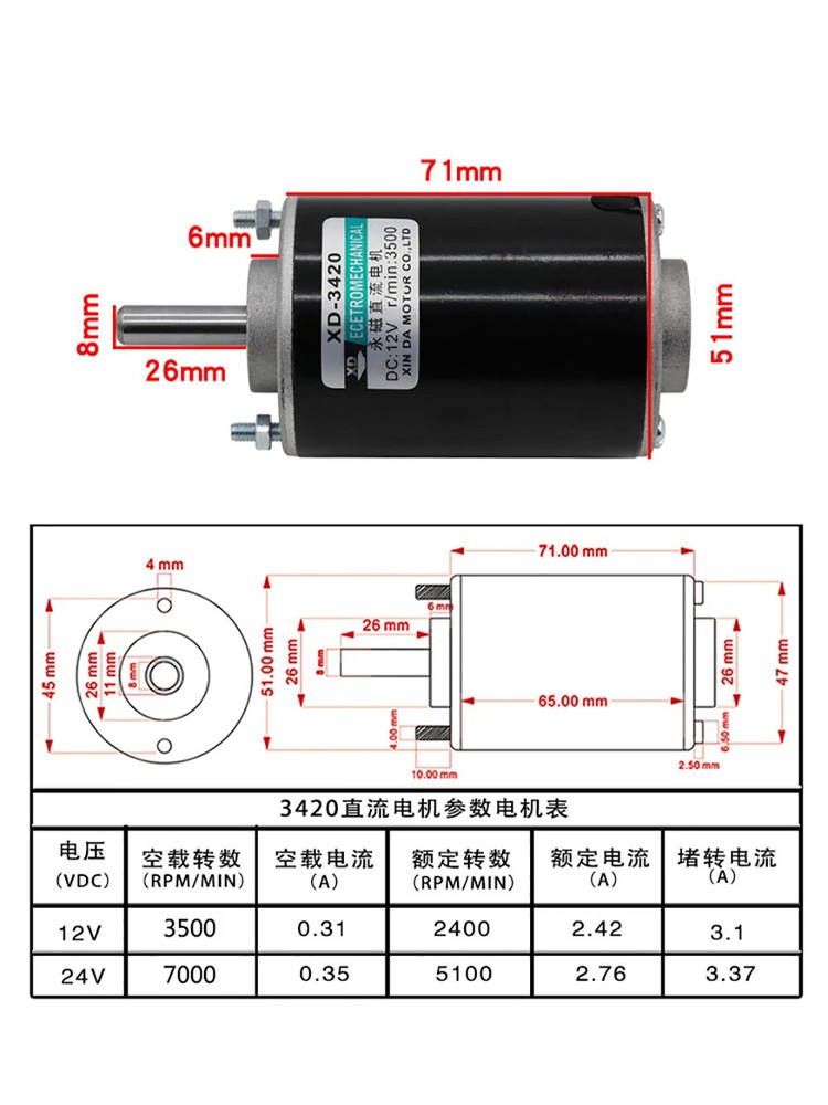Item specifics Condition New: A brand-new, unused, unopened, undamaged item in its original packaging (where packaging is applicable). Packaging should be the same as what is found in a retail store, unless the item was packaged by the manufacturer in non-retail packaging, such as an unprinted box or plastic bag. See the seller's listing for full details. See all condition definitionsopens in a new window or tab Origin Mainland China Brand Unbranded Usage Commercial Manufacture Type Power Tool Parts is_customized Yes MPN does not apply Model Number XD-3420 Item description from the seller Parameter: Model: XD-3420 Product name: DC permanent magnet high speed motor Voltage: DC 12V/24V No-load speed: 3500RPM/7000RPM No-load current: 0.31A/0.35A Rated speed: 2400RPM/5100RPM Rated current: 2.42A/2.76A Power: 30W Maximum torque: 2KGF.CM Output shaft diameter: 8MM Weight: 500G