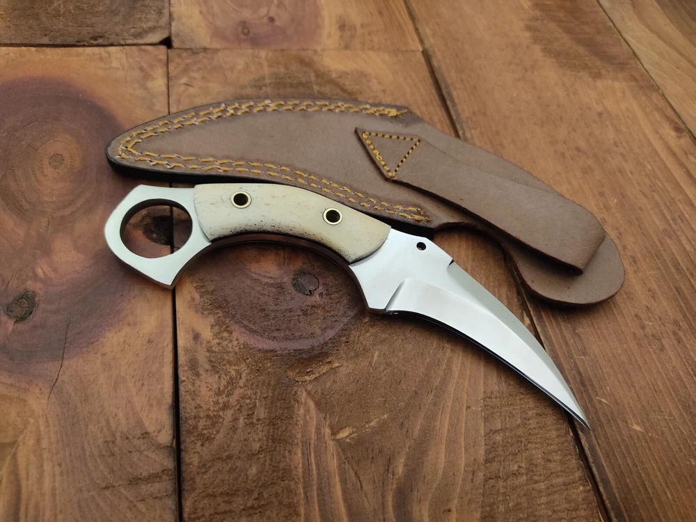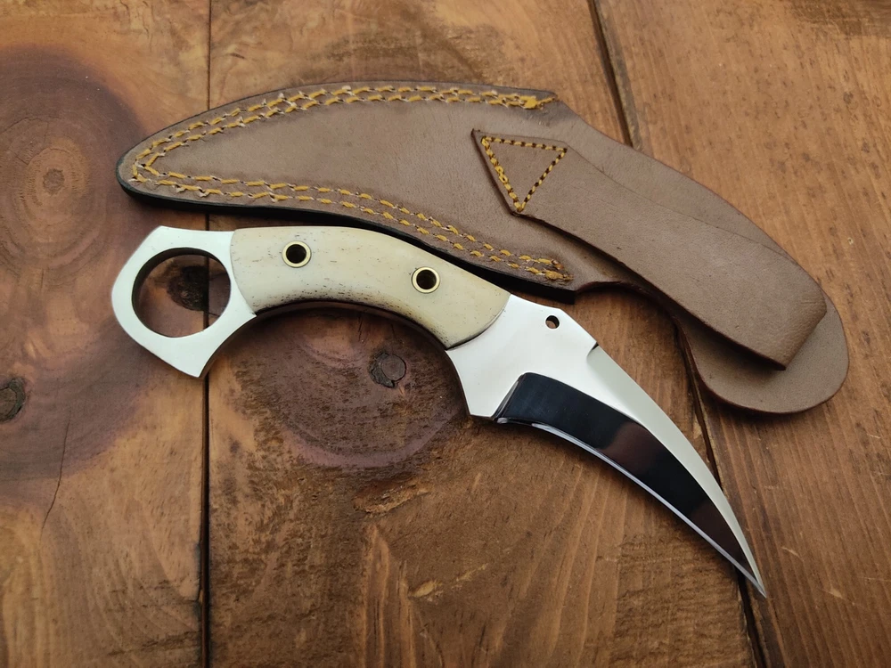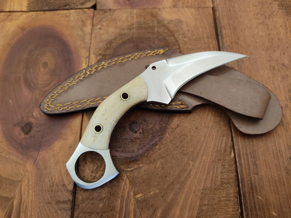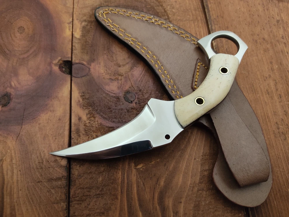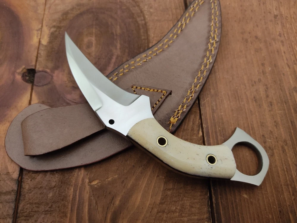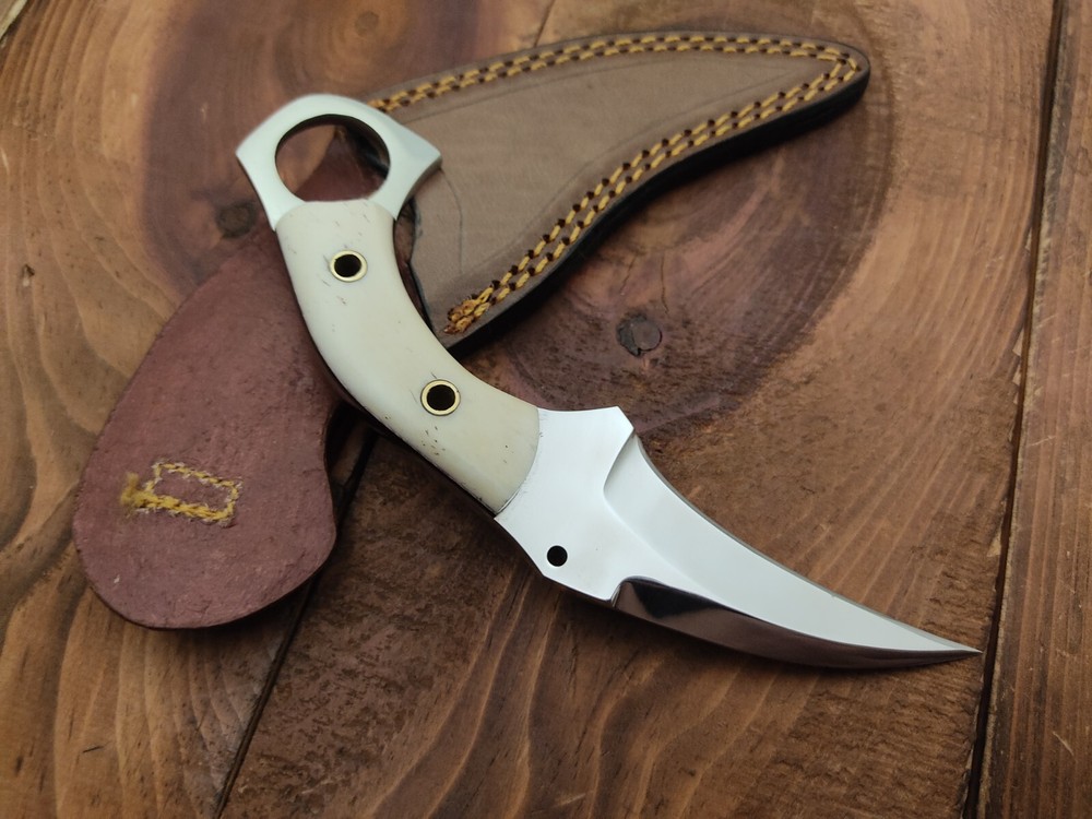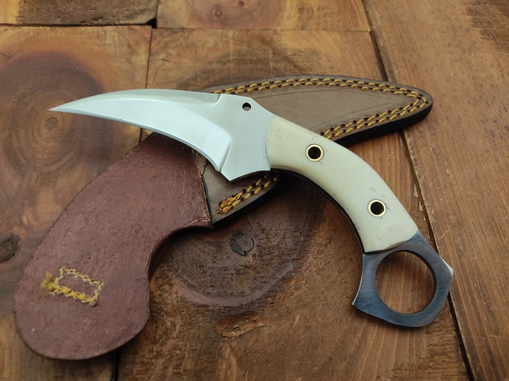 ITEM # HM-134 Fabulous Unique THUNDER STORKE Custom MADE KNIFE Custom Handmade Forged 12c27 Stainless Steel Camping Survival Outdoor Vintage Pocket Hunting Fixed Blade Karambit Knife 12c27 High Carbon Stainless Steel holds an edge very well and is optimum for hunting and skinning use as well as tactical and military tasks. The steel is very corrosive and will tarnish and turn the blade black when blood and acidic liquids or chemicals get onto the blade. The blade will still work fine, but will lose the satin color when it was new. Bone Handle 12c27 High Carbon Stainless Steel Blade RAZOR SHARP Gorgeous Handle & Blade 7.1" Long | Blade is 3.3" Long | Handle is 3.6" 4 mm Thick Blade | Beautiful Worked Blade & Handle WORK OF ART This prestigious unique HUNTING knife was designed and custom made by THUNDERSTORKE . Blade was given excellent heat treatment and Rockwell hardness of the blade 58 to 60 . PAYMENT: As Per Ebay Requirement DISPATCH TIME: 2 to 3 DAYS AFTER RECEIVING YOUR PAYMENT COURIER / SHIPPING: When we print the postage label there is a number that is on the label. This number is called a "Delivery Confirmation Number". The post office is not like UPS or FEDX where they scan the mail at the receipt point and then track it to your door. What the post office does is scan the item when it is delivered (if they choose to) and then you will see that it was delivered. Sometimes they do scan it when you drop it off, but this is rare. If they did scan it at a sorting facility, you see it moving across the USA. But this is very rare. - eBay confuses the buyer with the "tracking number" next to the post offices "delivery confirmation number" when in reality there is not a tracking number. You can ask this at the post office and they will concur. We print labels off the internet using eBay's USPS shipping program and then we drop the packages off at the post office, similar if you were mailing a stamped letter. The post office is supposed to scan it "received" and they do this about 50% of the time. But sometimes they do not scan them. Do not worry, we did mail the item and it is on it's way to you. COMBINE SHIPPING OFFER: We Do Combine Shipping Discount On Multiple Purchase are as Follow. BUYER FEEDBACK AND Detailed Seller Ratings (DSR) SCORES : We spend a lot of time trying to describe our knives 100% perfect in detail, but sometimes we miss things. In the event that we missed something, upon inspection of the item when you receive it, let us know by contacting us via the "Contact Seller" link (next to our user ID profile) and allow us to solve your problem before leaving us low DSR scores (Detailed Seller Ratings) or neutral and negative feedback. - Help us, help ourselves to do better, with our future business on eBay by allowing us to correct our faults and fix the sale with you to a positive. We need to keep our scores high to continue to offer our great knives for sale on eBay. KNIFE CARE and SHEATHS : Leather sheaths pull moisture out of the air and tend to rust knife blades if not stored properly. When you are done using the knife, store it away from the leather sheath and put gun oil, Seal 1, or a similar protectant on the blade and store. Damascus, 1095HC, and D2 can rust and develop stains if not lubricated. AGE RESTRICTION: WE DON'T SELL KNIVES TO ANY ONE WHO IS UNDER AGE . GUARANTEE: If you are not happy with your purchase, we offer you a peace of mind guarantee if you return the product within 7 working days. We will refund your money back immediately ON RECEIVING THE KNIFE BACK IN ORIGINAL CONDITION. DELIBERATE TAMPERING WITH THE PRODUCT OR MISUSE WILL NOT QUALIFY FOR THE REFUND. SHIPPING CHARGES ARE NON-REFUNDABLE. DISCLAIMER: WHEN YOU ARE BIDDING ON THIS KNIFE YOU ARE CONFIRMING US THAT YOUR AGE QUALIFIES FOR THIS PURCHASE AND THIS IS A LEGAL PURCHASE. TAKES NO RESPONSIBILITY FOR ANY ILLEGAL PURCHASE Thank you, - Props in the Photos are NOT INCLUDED. Knife & Sheath ONLY .