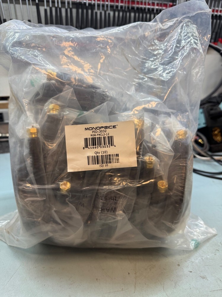 12 foot RG six quad shield cable with F connectors. New in package, Qty 10.