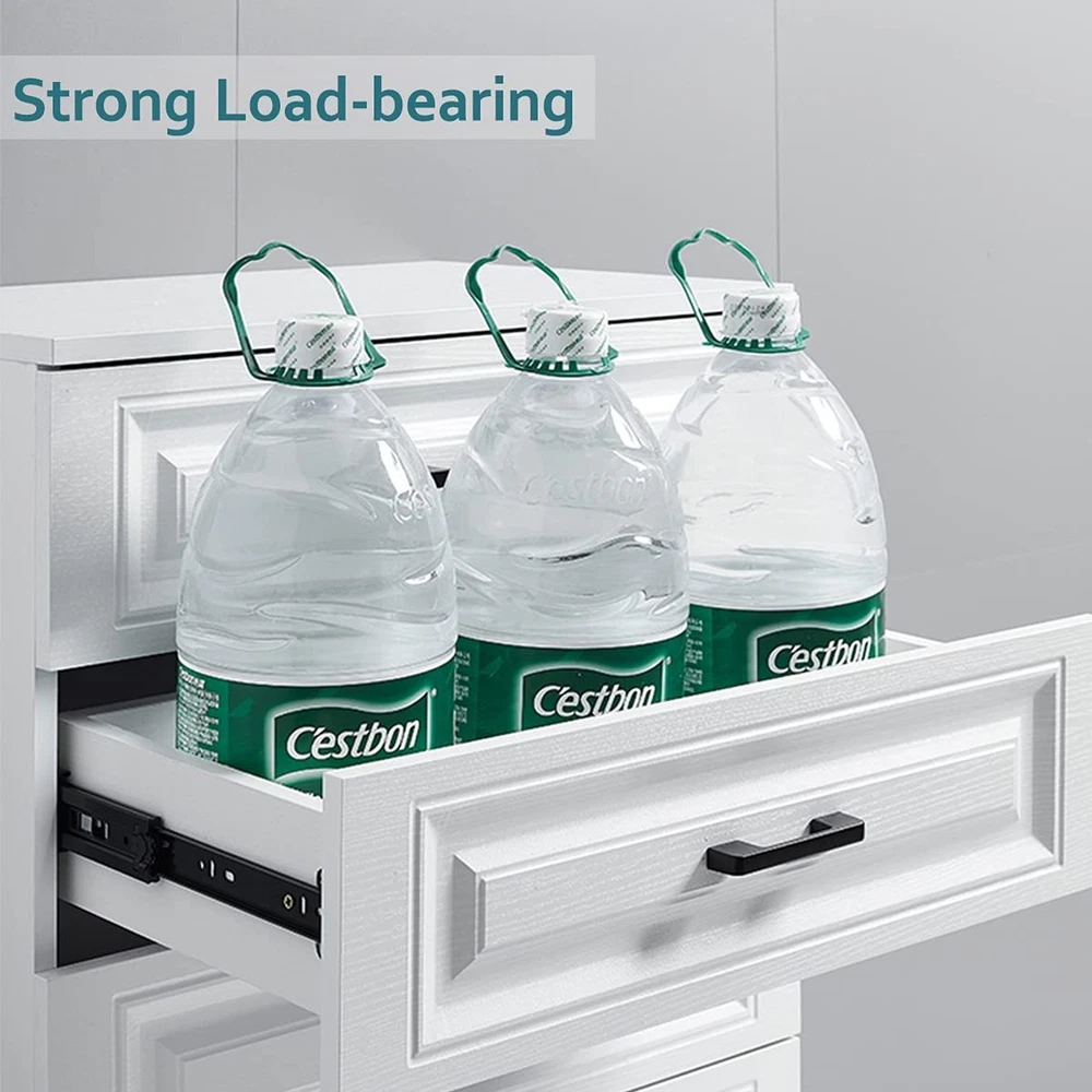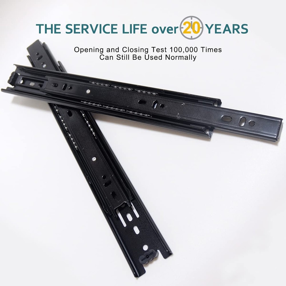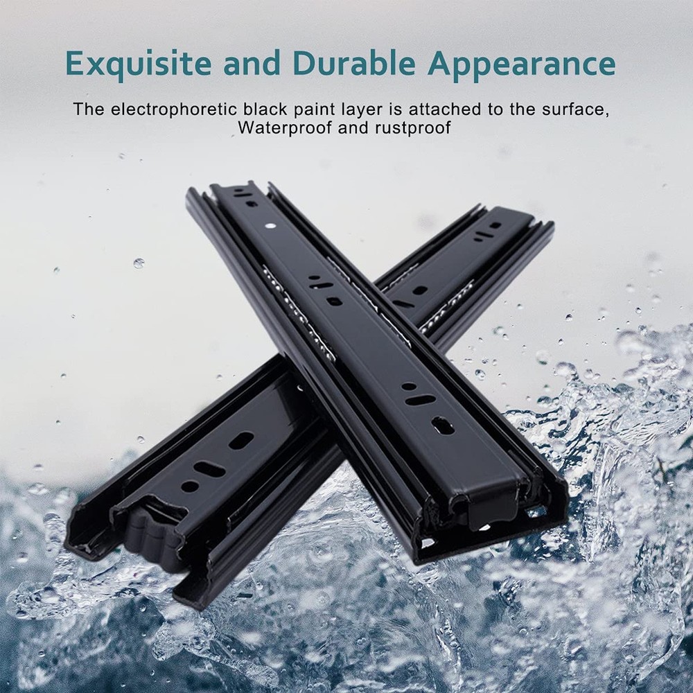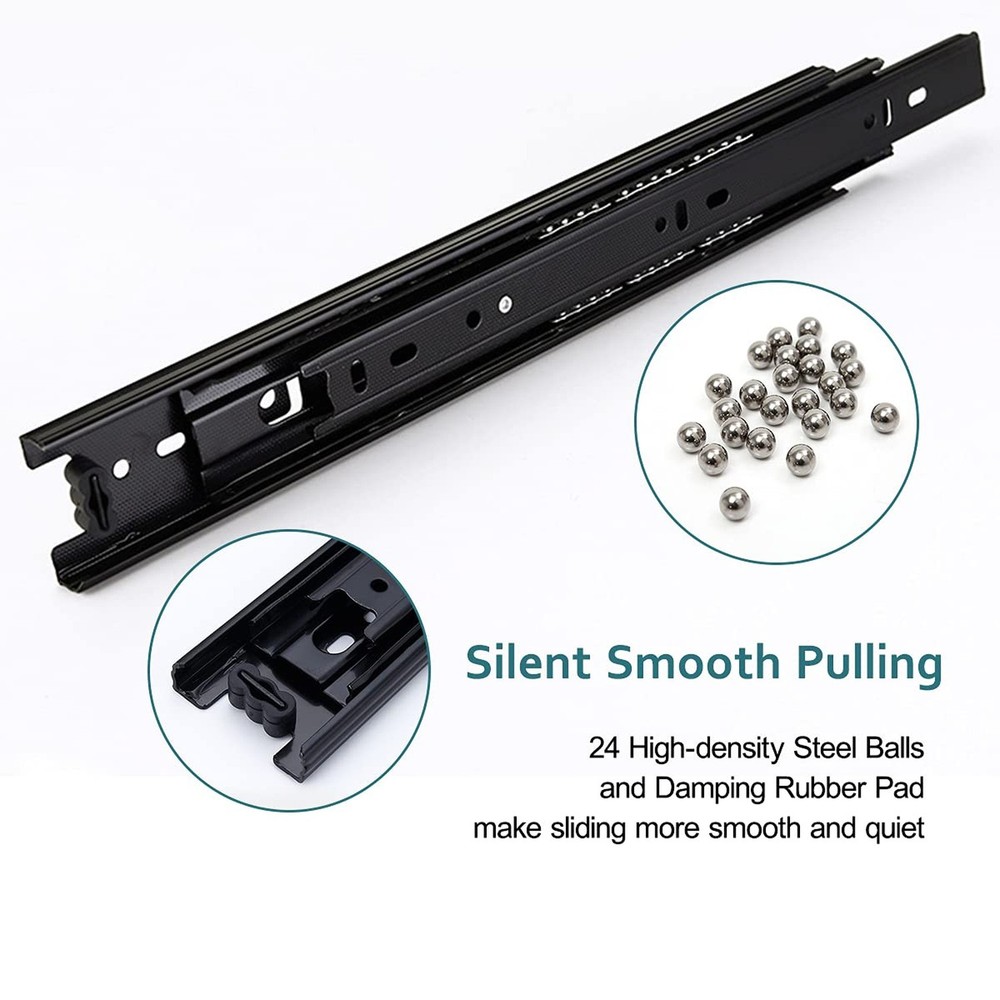 Full Extension Less Noise Drawer Slides 12 Inches, Drawer Slide Kit Fits Most Side-Mounted Drawer Systems,Full Extension Ball Bearing Heavy Duty 100 LB Product Details Size: A Brand: WhiteMyrtle MPN: Cabinet Furniture Drawer Slides 12 UPC: 746740026831 EAN: 0746740026831 Color: Black Material: Steel with Zinc Coating Brand: WhiteMyrtle Product Dimensions: 12"L x 0.5"W x 1.57"Th Finish Type: Steel Mounting Type: Side Mount Weight Limit: 100 Pounds Drawer Type: Side Mount Manufacturer: WhiteMyrtle UPC: 746740026831 Number of Items: 2 Part Number: Cabinet Furniture Drawer Slides 12 Item Weight: 1.06 pounds Product Dimensions: 12 x 1.7 x 0.5 inches Item model number: Cabinet Furniture Drawer Slides Size: A Finish: Steel Shape: Drawer Slide Maximum Weight Capacity: 100 Pounds Included Components: Includes 2 leaves Batteries Included?: No Batteries Required?: No Date First Available: July 26, 2021 Measurements:Length:12inch(300mm);Width:1.7inch(45mm);Thickness: 1/2inch(12.7mm); Load-bearing capacity: 100 LB. EASY INSTALLATION:Ensure the size of selected slides the depth of drawer;Reserve 1/2 inch of clearance for mounting on both sides;The two glides must be mounted in parallel,or will damage the glides;you can do it yourself! Mounting screws are INCLUDED. Full Extension & Ball Bearing Design: Mid-duty movable cabinet, desk drawer, ordinaty funiture, or any applications requiring 100lb load or less and requiring full extension. SPECIFICATIONS: 1 Pair of drawer slides, 12" folded slide length, made from high-grade cold rolled steel that is electrom zinc plated with black color, with load capacity of 100 lbs, mounting screws included. Full Extension & Ball Bearing Design 3-setions fold is convenient to fully open the drawer for easy access.Ball bearing design ensure drawer slides smoothly and silently. Double Anti-Rust Strength & Detachable Zinc Plating finish for anti-rust which is twice the traditional ordinary glides.Snap-on design makes the slides separate Easily,convenient to remove and install the glides.