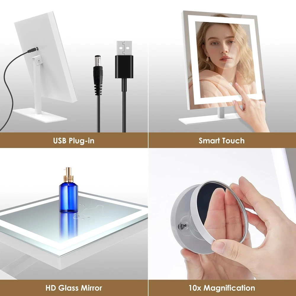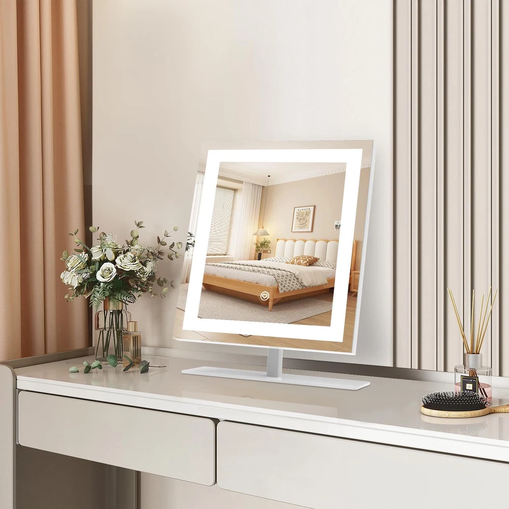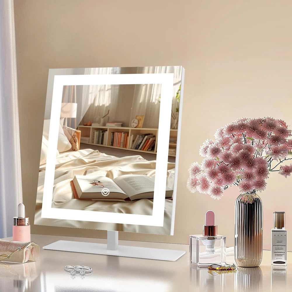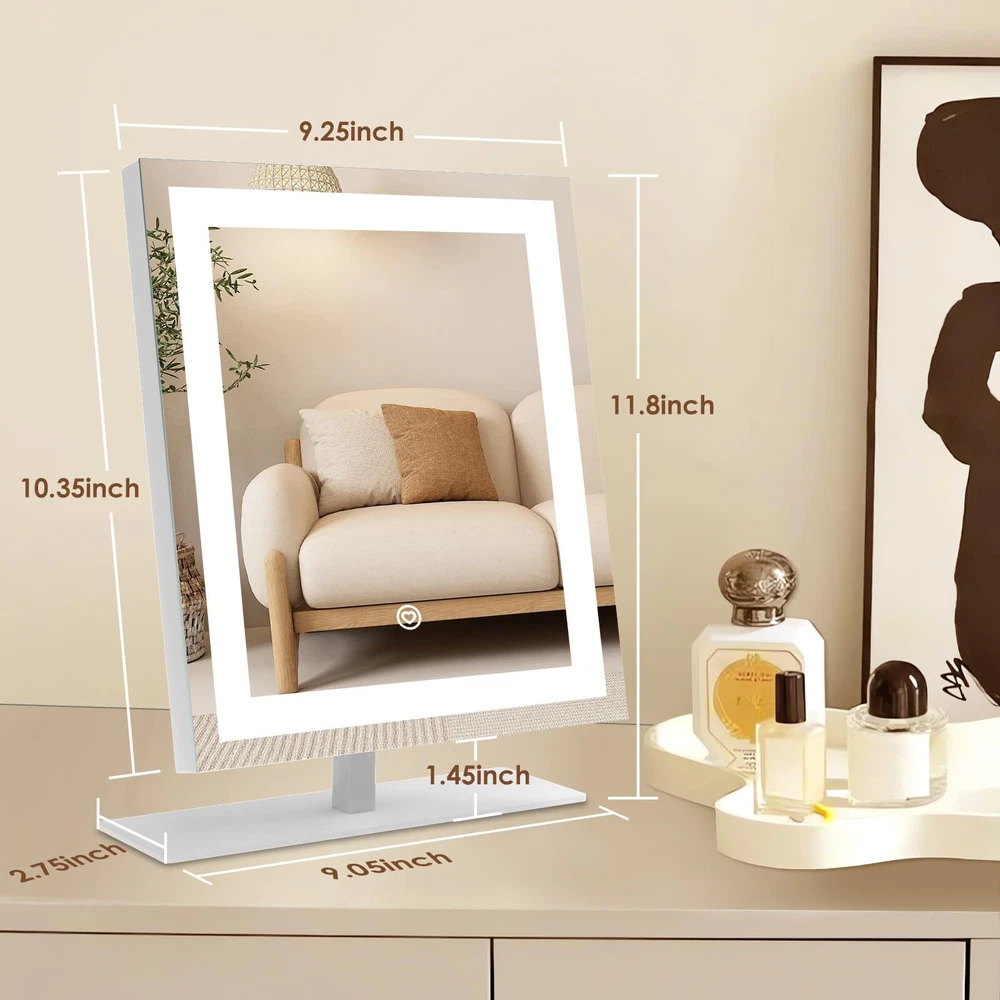 Smart Touch Control: With a simple touch, toggle through 3 colors temperature (Cold, Natural, Warm) and seamless dimming from 10% to 100% (Long press). Our lit-up vanity mirror ensures a true-to-life reflection, capturing every detail from your forehead to your chin. Sturdy Frame & Stand: Enjoy the robust stability of a metal frame and base, ready for daily wear and tear. Our cosmetic mirror boasts premium craftsmanship for enduring clarity, featuring an advanced HD silver coating that enhances visuals with gentle, luminous light. 120° Flexible Rotation: Rotate it smoothly through 120 degrees to find your ideal viewing angle. Accompanied by a versatile 5V DC cable compatible with any USB port, ensuring convenience without recharge hassles. Boasts 30% brighter illumination compared to typical battery-operated mirrors. Illuminate Your Routine: Compact yet generously proportioned, this mirror is a must-have in your luggage. It ensures you're always photo-ready, whether touching up after a long flight or prepping for an important meeting abroad. Stay confidently glamorous no matter where your journey takes you. Versatile Vanity Mirrors: Elevate spaces with this chic mirror to dressers or desks. Ideal for commemorating special days like birthdays, Valentine’s Day, Mother’s Day, and Christmas. As essentials for girls, it imbues her daily life with a sense of sophistication and a touch of self-care indulgence.