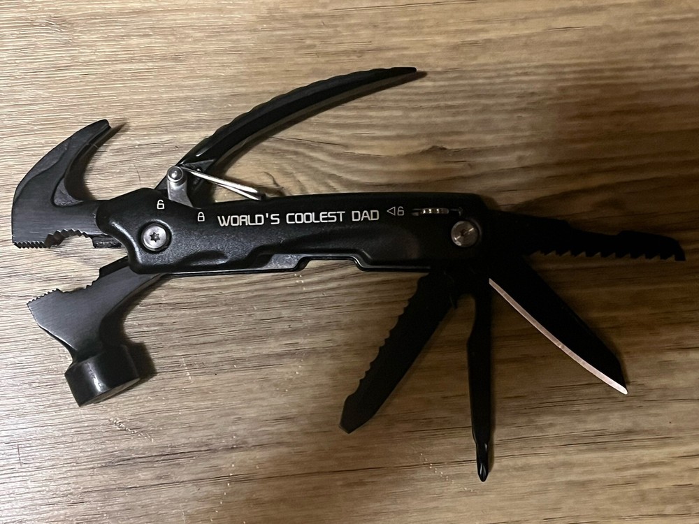 This tool has never been used, it is in like new condition. This 12-in-1 multitool hammer is the perfect gift for your dad. Made of high-quality stainless steel, it is durable and reliable. The tool set includes a plier, hammer, wire cutter, knife, screwdriver, saw, protective cap, and phillips screwdriver. It is compact and easy to carry, making it an ideal choice for camping and hiking trips. The BEST DAD EVER multitool is designed with a stylish black color and a phillips drive system. It weighs only 10 ounces and has a package dimension of 6.3 x 3.19 x 1.42 inches. This multitool is manufactured in China and does not require batteries. It is a must-have tool for any dad who loves outdoor activities.