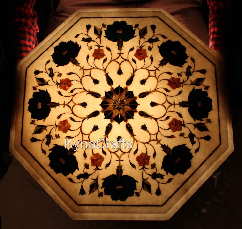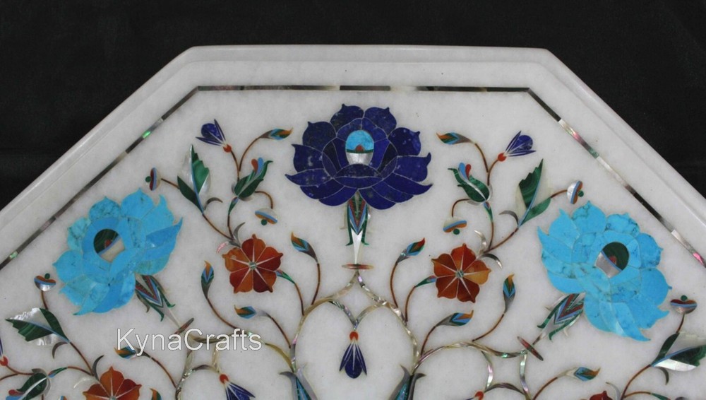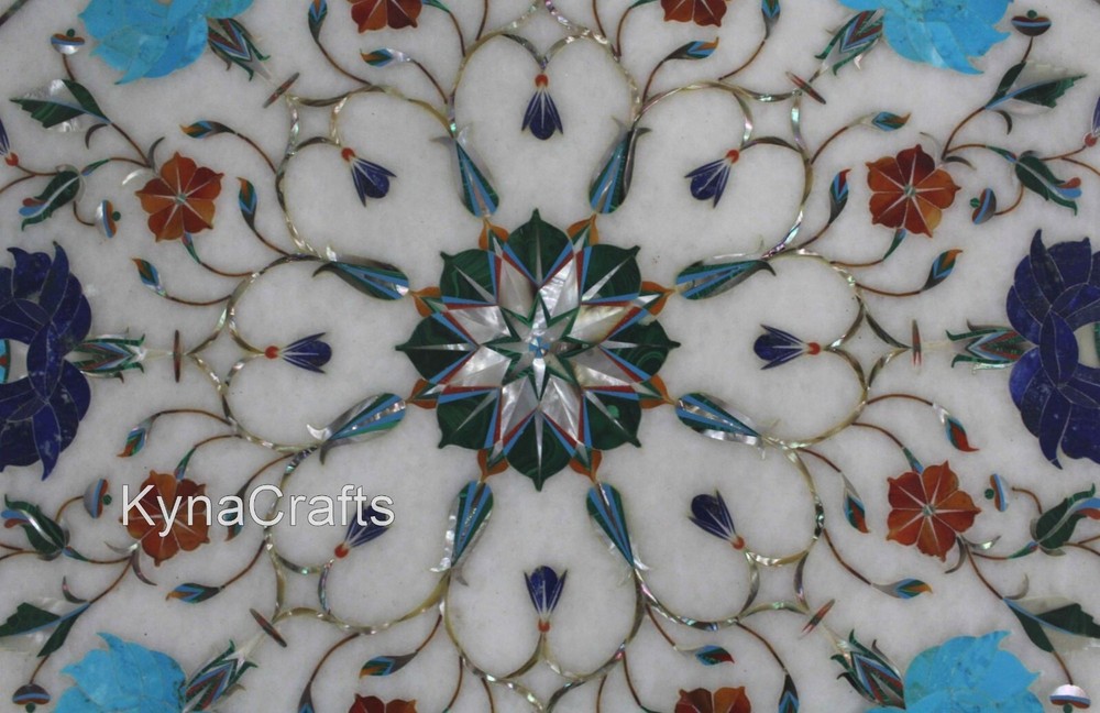 This marble table top will add elegant touch to your indoor & outdoor space. You & your guest will enjoy party, dinner, coffee and tea over it. Handmade in India with Inlay Work, Pietra Dura Art by the Skilled Artisans who are descendants of those families who built the Taj Mahal. This table top has a polished finish. Simply Wipe the table with a Damp Cloth to keep it looking beautiful with minimal maintenance. Adds high-style to yours Dining Room, Living Room, Hallway, Balcony, Kitchen, Office, Patio, Lawn & Garden with this Elegant and Contemporary Table Top, which can be used as Coffee Table, Side Table, End Table, Patio Table, Restaurant & Bar Tables. If you are looking something customize, Let us know we will make for you as per your design, size & shape. No two pieces are exactly alike, as the Gemstones used have different color, pattern & textures. Buyer has to pay custom duty or other taxes if any applicable in destination country. · Process of Inlay Art “Inlay work” is one of the most attractive art that done from marble. Same type of that adorns the Taj-Mahal and other Mughal monuments. It is a closely protected traditional art and only a few expert exponents are available today. The delicate process involves cutting and engraving marble shapes manually. To start with, a predefined pattern e.g., floral design or geometrical design is engraved on the marble slab. Small pieces of marble of different shades are cut delicately to fit in these grooves precisely. These small pieces are then slipped in the grooves. There are many varieties of colored stone available for utilization in marble inlay work: malachite, carnelian , jasper, mother of pearl, abalone shell, lapis lazuli, agate, coral, turquoise and tiger eye to name just a few. The grooves are filled with their precisely corresponding shapes of colored stone and secured in place with a white putty made from oil, and wax. Once the design is completely dry, the piece is polished with a mixture of sand, water and emery paper to give a shiny smooth finish. Apart from marble, many other materials can also be used.
